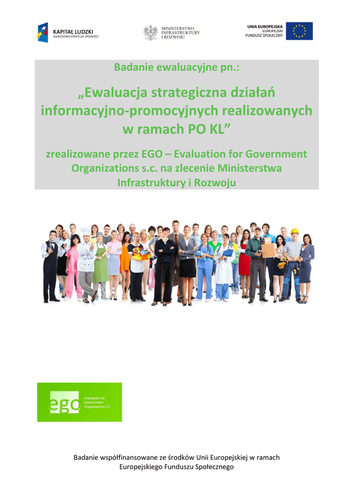 Badanie ewaluacyjne pn.: „Ewaluacja strategiczna działań informacyjno-promocyjnych realizowanych w ramach PO KL” zrealizowane przez EGO – Evaluation for Government Organizations s.c. na zlecenie Ministerstwa Infrastruktury i Rozwoju Badanie współfinansowane ze środków Unii Europejskiej w ramach Europejskiego Funduszu Społecznego Jak planowano działania komunikacyjne w PO KL? Poziom instytucji realizujących PO KL. Planowanie działań informacyjno-promocyjnych odbywało się przede wszystkim w oparciu o dokumenty programowe oraz wcześniejsze doświadczenia związane z wdrażaniem perspektywy 2004-2006. Sporadycznie korzystano z wyników dostępnych badań. ☺ Plan Komunikacji - główny dokument „planistyczny” - został oceniony przez jego użytkowników, jako narzędzie użyteczne i dobrze organizujące proces informacji i promocji Programu. Słabym punktem jest jednak jego złożoność i wielowątkowość komunikatów nt. zasad prowadzenia działań informacyjno – promocyjnych oraz brak pogłębionej, kompleksowej diagnozy sytuacji bazowej, która umożliwiłaby dokładniejsze poznanie oraz opisanie potrzeb i specyfiki grup docelowych. Poziom beneficjentów. Planując i dobierając narzędzia komunikacji beneficjenci opierają się przede wszystkim na własnych doświadczeniach, wiedzy i pomysłowości. Zwykle nie są prowadzone analizy potrzeb grup docelowych, rzadko prowadzone są też konsultacje z potencjalnymi uczestnikami projektów. ☺ Z jednej strony, nie prowadzenie pogłębionych analiz grup docelowych było uzasadnione bardzo dobrą znajomością potrzeb potencjalnych odbiorców. Część beneficjentów bowiem jest bardzo dobrze zorientowana w potrzebach informacyjnych odbiorców projektów, jako że działają w danym obszarze od wielu lat, realizują bardzo dużo projektów, współpracują z wieloma organizacjami partnerskimi i utrzymują stały kontakt z przedstawicielami grup docelowych. Z drugiej strony, brak prowadzenia diagnozy potrzeb jest zjawiskiem negatywnym, gdyż świadczy o tym, że dla większości przedstawicieli projektodawców działania informacyjno – promocyjne są drugorzędnym elementem realizacji projektów. Wielu beneficjentów albo nie przygotowuje planu w zakresie informacji o projekcie i promocji jego rezultatów (ponad 1/5 badanych beneficjentów) albo prowadzi jedynie ustne, nieformalne ustalenia odnośnie kształtu działań komunikacyjnych (prawie 1/3 badanych beneficjentów). Czy koordynacja działań komunikacyjnych w PO KL jest skuteczna? ☺ System koordynacji działań, w tym rolę IZ PO KL jako koordynatora systemu, można ocenić pozytywnie, mimo złożoności systemu i stosunkowo dużej autonomii poszczególnych instytucji. Duży wpływ na dobrą koordynację działań ma wypracowana sieć kontaktów pomiędzy instytucjami, mechanizmy współpracy i wymiany doświadczeń. ☺ Większość badanych pracowników instytucji realizujących PO KL wysoko oceniła wypracowane mechanizmy współpracy – grupę roboczą ds. informacji i promocji (IGR) oraz regionalne informacyjne grupy robocze (RIGR) – pod kątem wpływu na poprawę jakości i spójności działań informacyjno – promocyjnych. Co prawda udało się wypracować sieć kontaktów na poziomie regionalnym, ale dotyczy to raczej współpracy między instytucjami w obrębie jednego regionu, niż pomiędzy instytucjami z różnych województw. Wskazana byłaby większa wymiana doświadczeń pomiędzy regionami, które realizują zbliżone działania, a także Instytucjami Pośredniczącymi i Wdrażającymi centralnymi, które mogłyby się dzielić „dobrymi praktykami” ze swoich obszarów działań, które można by również zaadoptować w regionach. Czy system monitorowania i ewaluacji działań komunikacyjnych w PO KL jest skuteczny? System wskaźników działań komunikacyjnych PO KL opiera się przede wszystkim na wskaźnikach produktu (15 na 22 to wskaźniki produktowe). To sprawia, że system ten w bardzo ograniczony sposób pokazywał poziom osiągnięcia celów, bez regularnej i pogłębionej analizy danych jakościowych. Widoczny jest także brak systemowego podejścia do realizacji badań ewaluacyjnych z zakresu działań komunikacyjnych w PO KL. Wyniki badań cechuje brak cykliczności, duża fragmentaryczność. Badania zazwyczaj wynikają z indywidualnych potrzeb pojedynczych instytucji i dotyczą wąskiego zakresu działań komunikacyjnych. Z jakich narzędzi komunikacji najczęściej korzystano w PO KL? Poziom instytucji realizujących PO KL. Instytucje systemu wykorzystywały bogaty i zróżnicowany zbiór narzędzi komunikacyjnych, przy czym dominującą rolę pełniły narzędzia tradycyjne jak: telewizja, prasa, radio, publikacje oraz szkolenia. Z biegiem realizacji Programu zaczęto szerzej sięgać po narzędzia interaktywne, a także wykorzystywać bardziej innowacyjne formy przekazu (kampanie banerowe online, mailing, kampanie w mediach społecznościowych). Wykorzystanie narzędzi komunikacyjnych (mediów) w działaniach IZ PO KL Źródło: Opracowanie własne na podstawie systematycznego przeglądu „Formularzy sprawozdawczych dotyczący promocji i informacji PO KL” Wybór poszczególnych mediów w kolejnych etapach wdrażania PO KL był zgodny z ideą budowania marki (budowanie świadomości pokazywanie korzyści). W pierwszych latach wdrażania (2008-2011) sięgano po formę spotu telewizyjnego i radiowego, jako że z punktu widzenia celu polegającego na budowaniu świadomości Programu, telewizja i inne szeroko zasięgowe media są najskuteczniejsze. W kolejnych latach, 2012-2013, gdy świadomość Programu została „zbudowana”, można było częściej sięgać po inne kanały dotarcia, by utrwalać przekaz – wówczas spoty emitowano częściej w radiu i w Internecie. Poziom beneficjentów. Beneficjenci realizujący projekty konkursowe w swoich projektach najczęściej wykorzystywali proste formy promocji, ograni
