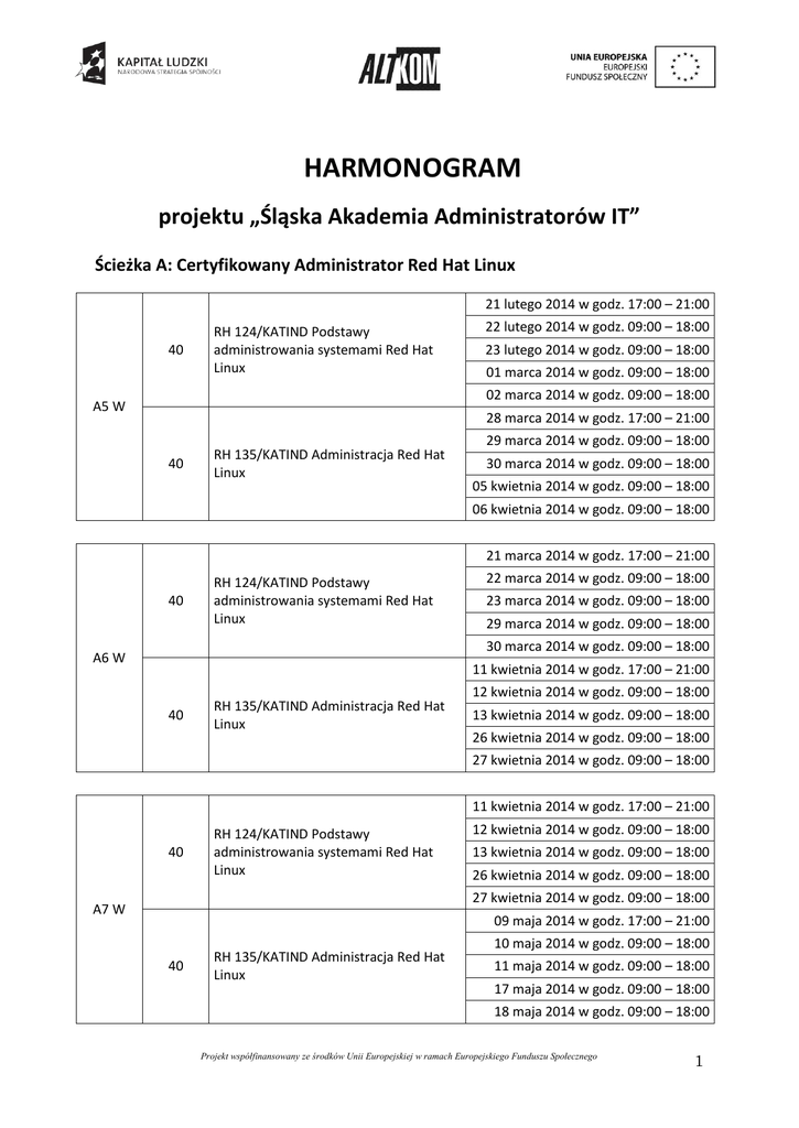 HARMONOGRAM projektu „Śląska Akademia Administratorów IT” Ścieżka A: Certyfikowany Administrator Red Hat Linux 21 lutego 2014 w godz. 17:00 – 21:00 40 RH 124/KATIND Podstawy administrowania systemami Red Hat Linux 22 lutego 2014 w godz. 09:00 – 18:00 23 lutego 2014 w godz. 09:00 – 18:00 01 marca 2014 w godz. 09:00 – 18:00 02 marca 2014 w godz. 09:00 – 18:00 A5 W 28 marca 2014 w godz. 17:00 – 21:00 40 RH 135/KATIND Administracja Red Hat Linux 29 marca 2014 w godz. 09:00 – 18:00 30 marca 2014 w godz. 09:00 – 18:00 05 kwietnia 2014 w godz. 09:00 – 18:00 06 kwietnia 2014 w godz. 09:00 – 18:00 21 marca 2014 w godz. 17:00 – 21:00 40 RH 124/KATIND Podstawy administrowania systemami Red Hat Linux 22 marca 2014 w godz. 09:00 – 18:00 23 marca 2014 w godz. 09:00 – 18:00 29 marca 2014 w godz. 09:00 – 18:00 30 marca 2014 w godz. 09:00 – 18:00 A6 W 11 kwietnia 2014 w godz. 17:00 – 21:00 40 RH 135/KATIND Administracja Red Hat Linux 12 kwietnia 2014 w godz. 09:00 – 18:00 13 kwietnia 2014 w godz. 09:00 – 18:00 26 kwietnia 2014 w godz. 09:00 – 18:00 27 kwietnia 2014 w godz. 09:00 – 18:00 11 kwietnia 2014 w godz. 17:00 – 21:00 40 RH 124/KATIND Podstawy administrowania systemami Red Hat Linux 12 kwietnia 2014 w godz. 09:00 – 18:00 13 kwietnia 2014 w godz. 09:00 – 18:00 26 kwietnia 2014 w godz. 09:00 – 18:00 27 kwietnia 2014 w godz. 09:00 – 18:00 A7 W 09 maja 2014 w godz. 17:00 – 21:00 40 RH 135/KATIND Administracja Red Hat Linux 10 maja 2014 w godz. 09:00 – 18:00 11 maja 2014 w godz. 09:00 – 18:00 17 maja 2014 w godz. 09:00 – 18:00 18 maja 2014 w godz. 09:00 – 18:00 Projekt współfinansowany ze środków Unii Europejskiej w ramach Europejskiego Funduszu Społecznego 1 16 maja 2014 w godz. 17:00 – 21:00 40 RH 124/KATIND Podstawy administrowania systemami Red Hat Linux 17 maja 2014 w godz. 09:00 – 18:00 18 maja 2014 w godz. 09:00 – 18:00 24 maja 2014 w godz. 09:00 – 18:00 25 maja 2014 w godz. 09:00 – 18:00 A8 W 13 czerwca 2014 w godz. 17:00 – 21:00 40 RH 135/KATIND Administracja Red Hat Linux 14 czerwca 2014 w godz. 09:00 – 18:00 15 czerwca 2014 w godz. 09:00 – 18:00 21 czerwca 2014 w godz. 09:00 – 18:00 22 czerwca 2014 w godz. 09:00 – 18:00 20 czerwca 2014 w godz. 17:00 – 21:00 40 RH 124/KATIND Podstawy administrowania systemami Red Hat Linux 21 czerwca 2014 w godz. 09:00 – 18:00 22 czerwca 2014 w godz. 09:00 – 18:00 28 czerwca 2014 w godz. 09:00 – 18:00 29 czerwca 2014 w godz. 09:00 – 18:00 A9 W 11 lipca 2014 w godz. 17:00 – 21:00 40 RH 135/KATIND Administracja Red Hat Linux 12 lipca 2014 w godz. 09:00 – 18:00 13 lipca 2014 w godz. 09:00 – 18:00 19 lipca 2014 w godz. 09:00 – 18:00 20 lipca 2014 w godz. 09:00 – 18:00 Ścieżka B: Certyfikowany Administrator systemowy Red Hat 11 kwietnia 2014 w godz. 17:00 – 21:00 40 RH 254/KATIND Zaawansowana administracja systemami Red Hat Linux 12 kwietnia 2014 w godz. 09:00 – 18:00 13 kwietnia 2014 w godz. 09:00 – 18:00 26 kwietnia 2014 w godz. 09:00 – 18:00 27 kwietnia 2014 w godz. 09:00 – 18:00 B3 W 16 maja 2014 w godz. 17:00 – 21:00 40 RH 300/KATIND Red Hat Linux dla inżynierów systemowych 17 maja 2014w godz. 09:00 – 18:00 18 maja 2014 w godz. 09:00 – 18:00 24 maja 2014 w godz. 09:00 – 18:00 25 maja 2014 w godz. 09:00 – 18:00 Projekt współfinansowany ze środków Unii Europejskiej w ramach Europejskiego Funduszu Społecznego 2 06 czerwca 2014 w godz. 17:00 – 21:00 40 RH 254/KATIND Zaawansowana administracja systemami Red Hat Linux 07 czerwca 2014 w godz. 09:00 – 18:00 08 czerwca 2014 w godz. 09:00 – 18:00 14 czerwca 2014 w godz. 09:00 – 18:00 15 czerwca 2014 w godz. 09:00 – 18:00 B4 W 04 lipca 2014 w godz. 17:00 – 21:00 40 RH 300/KATIND Red Hat Linux dla inżynierów systemowych 05 lipca 2014 w godz. 09:00 – 18:00 06 lipca 2014 w godz. 09:00 – 18:00 26 lipca 2014 w godz. 09:00 – 18:00 27 lipca 2014 w godz. 09:00 – 18:00 Ścieżka: ITIL – Zarzadzanie serwerami IT Nr grupy F5 W l. godz. Szkolenie 24 ITILv3-F_I/KATIND Podstawy zarządzania usługami IT 8 ITIL-A/KATIND Gra symulacyjna Apollo Terminy szkoleń 29 marca 2014 w godz. 09:00 – 16:00 30 marca 2014 w godz. 09:00 – 16:00 05 kwietnia 2014 w godz. 09:00 – 16:00 06 kwietnia 2014 w godz. 09:00 – 16:00 Projekt współfinansowany ze środków Unii Europejskiej w ramach Europejskiego Funduszu Społecznego 3