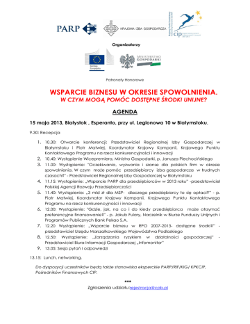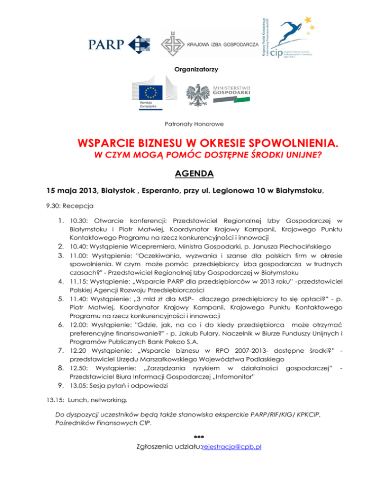 Organizatorzy Patronaty Honorowe WSPARCIE BIZNESU W OKRESIE SPOWOLNIENIA. W CZYM MOGĄ POMÓC DOSTĘPNE ŚRODKI UNIJNE? AGENDA 15 maja 2013, Białystok , Esperanto, przy ul. Legionowa 10 w Białymstoku, 9.30: Recepcja 1. 10.30: Otwarcie konferencji: Przedstawiciel Regionalnej Izby Gospodarczej w Białymstoku i Piotr Matwiej, Koordynator Krajowy Kampanii, Krajowego Punktu Kontaktowego Programu na rzecz konkurencyjności i innowacji 2. 10.40: Wystąpienie Wicepremiera, Ministra Gospodarki, p. Janusza Piechocińskiego 3. 11.00: Wystąpienie: "Oczekiwania, wyzwania i szanse dla polskich firm w okresie spowolnienia. W czym może pomóc przedsiębiorcy izba gospodarcza w trudnych czasach?" - Przedstawiciel Regionalnej Izby Gospodarczej w Białymstoku 4. 11.15: Wystąpienie: „Wsparcie PARP dla przedsiębiorców w 2013 roku” -przedstawiciel Polskiej Agencji Rozwoju Przedsiębiorczości 5. 11.40: Wystąpienie: „3 mld zł dla MSP- dlaczego przedsiębiorcy to się opłaci?” - p. Piotr Matwiej, Koordynator Krajowy Kampanii, Krajowego Punktu Kontaktowego Programu na rzecz konkurencyjności i innowacji 6. 12.00: Wystąpienie: "Gdzie, jak, na co i do kiedy przedsiębiorca może otrzymać preferencyjne finansowanie?" - p. Jakub Fulary, Naczelnik w Biurze Funduszy Unijnych i Programów Publicznych Bank Pekao S.A. 7. 12.20 Wystąpienie: „Wsparcie biznesu w RPO 2007-2013- dostępne środki?” przedstawiciel Urzędu Marszałkowskiego Województwa Podlaskiego 8. 12.50: Wystąpienie: „Zarządzania ryzykiem w działalności Przedstawiciel Biura Informacji Gospodarczej „Infomonitor” gospodarczej” 9. 13.05: Sesja pytań i odpowiedzi 13.15: Lunch, networking. Do dyspozycji uczestników będą także stanowiska eksperckie PARP/RIF/KIG/ KPKCIP, Pośredników Finansowych CIP. *** Zgłoszenia udziału:[email protected] -