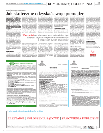 DGP | 16 sierpnia 2011 | nr 157 (3043) | WWW.GAZETAPRAWNA.PL KOMUNIKATY, OGŁOSZENIA E5 UPADŁOŚCI: poradnik przedsiębiorcy Jak skutecznie odzyskać swoje pieniądze W I półroczu 2011 r. sądy ogłosiły upadłość 333 polskich przedsiębiorstw, to daje blisko 700 upadłości rokrocznie. Jako przedsiębiorca prędzej czy później trafisz na tzw. bankruta. Co zrobić w takiej sytuacji i jak nie popełnić niepotrzebnych błędów, które mogą utrudnić odzyskanie twoich pieniędzy? Podstawową kwestią jest uzyskanie informacji o upadłości dłużnika. We wniosku o ogłoszenie upadłości dłużnik (po ogłoszeniu upadłości – upadły) sam wskazuje wierzycieli (osoby i podmioty gospodarcze wobec których ma długi) oraz wysokość poszczególnych długów. Oprócz tego w trakcie postępowania upadłościowego jest zobowiązany do wydania syndykowi wszelkich dokumentów rachunkowych z których również wynika kto jest jego wierzycielem. Pierwsze kroki Na podstawie wniosku i dokumentów upadłego syndyk rozsyła do wierzycieli zawiadomienia o ogłosze- niu upadłości. Nie jest to jednak sytuacja idealnie komfortowa dla przedsiębiorcy wierzyciela, gdyż może się zdarzyć, że upadły nie prowadził prawidłowej księgowości i celowo nie wskazał danego przedsiębiorcy jako wierzyciela. Dlatego wierzyciel we własnym interesie winien być czujny i szybko reagować na informacje o kłopotach swych dłużników. W celu ochrony „ukry- cje o dłużnikach w upadłości. Trzymanie ręki na pulsie jest dla przedsiębiorców po prostu opłacalne, gdyż wierzytelność można zgłosić w określonym przez syndyka terminie (minimum jeden - maksimum trzy miesiące). Termin do zgłaszania wierzytelności podawany jest zarówno w zawiadomieniu o upadłości dłużnika przesyłanym przez syndyka do znanych mu wierzycieli, jak Monitorowanie tych informacji jest bardzo istotne, a zaniechanie może skutkować co najmniej obciążeniem wierzyciela dodatkowymi kosztami a zdarza się nawet, że i pominięciem wierzyciela w procedurze zaspokajania roszczeń. Profesjonalne usługi Kiedy przedsiębiorca uzyska już informacje o upadłości dłużnika warto aby Wierzyciel we własnym interesie winien być czujny i szybko reagować na informacje o kłopotach swych dłużników tych” wierzycieli syndyk jest zobowiązany do ogłoszenia o upadłości w Monitorze Sądowym i Gospodarczym (MSiG) oraz w dzienniku o zasięgu lokalnym. Przeważająca większość przedsiębiorców nie prenumeruje MSiG dlatego warto zaglądać na stronę internetową www. puin.pl, gdzie dostępne są coraz liczniejsze informa- i w ogłoszeniach w MSiG oraz prasie (np. w dodatku Komunikaty - Dziennika Gazeta Prawna ukazującym się w każdy wtorek i zawierającym między innymi obwieszczenia sądowe. Wersja elektroniczna Dodatku Komunikaty znajduje się w zakładce „Obwieszczenia Upadłościowe” na portalu www.puin.pl). zastanowił się czy w postępowaniu upadłościowym będzie działał samodzielnie, czy może skorzysta z usług profesjonalisty. Najprościej odpowiedzieć sobie na pytanie – czy posiadam wystarczającą wiedzę i doświadczenie aby odzyskać moje pieniądze? Czy nie popełnię błędów, które mogą uniemoż- WOJEWODA ZACHODNIOPOMORSKI Agencja Nieruchomości Rolnych O/T w Gdańsku, podaje do publicznej wiadomości informacje o zamiarze sprzedaży w trybie przetargu nieograniczonego nieruchomości rolnej wchodzącej w skład Zasobu Własności Rolnej Skarbu Państwa po zlikwidowanym Przedsiębiorstwie Gospodarki Rolnej Skarszewach, określonej w wykazie podanym do publicznej wiadomości w dniu 08 lipca 2011r. Przedmiotem sprzedaży jest nieruchomość rolna pochodząca ze zlikwidowanego Przedsiębiorstwa Gospodarki Rolnej Skarszewach, położona w obrębie ewidencyjnym Wolny Dwór, gmina Skarszewy o ogólnej powierzchni 35,6723 ha. W skład nieruchomości wchodzi działka nr 367/5 obręb Wolny Dwór, posiadająca księgę wieczystą KW nr GD1A/00029248/6, prowadzoną przez Sąd Rejonowy w Starogardzie Powierzchnia nieruchomości wynosi 35,6723 ha, w tym: - grunty orne o pow. 31,7523 ha w klasach: RIVa-1,9300 ha; RIVb-9,1900; RV-7,74 ha; RVI-12,8923 ha; - użytki zielone o pow. 2,41 ha w klasach ŁIV-0,12 ha; ŁVI-2,17 ha; PsV-0,12 ha; - rowy - w-0,01 ha - Lasy o pow. 0,54 ha w klasach: LsVI - 0,54 ha - Grunty zadrzewione i zakrzaczone 0,09 ha w klasach Lz/ŁVI – 0,09 ha - nieużytki: 0,8700 ha; Na przedmiotowej nieruchomości znajdują złoża kruszywa naturalnego. Zgodnie ze studium uwarunkowań i kierunków zagospodarowania przestrzennego gminy Skarszewy zatwierdzonym uchwałą Nr Xi/243/98 Rady Miejskiej w Skarszewach z dnia 26 marca 1998 r, zmienionym uchwałą Nr XLII/326/09 Rady Miejskiej w Skarszewach z dnia 18 grudnia 2009 r. działka 367/5 stanowi teren rolny o niższych klasach bonitacyjnych. Cena brutto nieruchomości wynosi 2.240.000,00 zł (słownie złotych: dwa miliony dwieście czterdzieści tysięcy złotych). Przetarg ustny ( licytacja) odbędzie się w dniu 31 sierpnia 2011r. o godz. 1200, w siedzibie Oddziału Terenowego Agencji w Pruszczu Gdańskim, ul. Powstańców Warszawy 28, sala przetargowa. Szczegółowe informacje o nieruchomości będącej przedmiotem przetargu można uzyskać w Oddziale Terenowym ANR w Gdańsku z/s w Pruszczu Gdańskim, ul. Powstańców Warszawy 28, tel. /58/ 300-48-41 www.anr.gov.pl Szczecin, 5 sierpnia 2011 r. liwić ich odzyskanie? Po takim uczciwym rachunku sumienia przedsiębiorca, który podjął decyzję o skorzystaniu z pomocy profesjonalisty powinien rozważyć jeszcze jedną kwestię – czy skorzysta z pomocy specjalisty z zakresu prawa upadłościowego, np. licencjonowanego syndyka czy zdecyduje się na zwykłego prawnika. Tu przydatny jest tzw. test lekarza (zwany testem wiadomości specjalnych), w którym to teście należy się zastanowić – czy gdybym miał atak serca to szukałby pomocy u lekarza pierwszego kontaktu czy od razu wezw