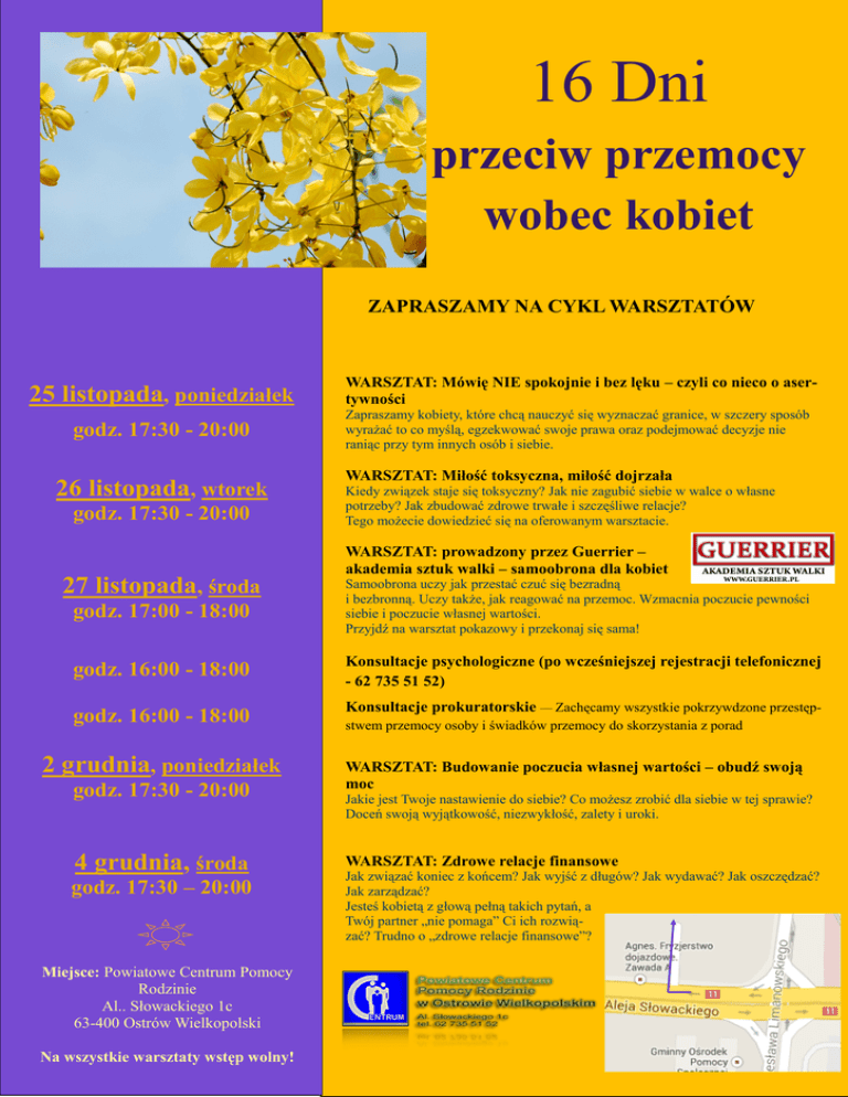 16 Dni przeciw przemocy wobec kobiet ZAPRASZAMY NA CYKL WARSZTATÓW 25 listopada, poniedziałek WARSZTAT: Mówię NIE spokojnie i bez lęku – czyli co nieco o asertywności godz. 17:30 - 20:00 Zapraszamy kobiety, które chcą nauczyć się wyznaczać granice, w szczery sposób wyrażać to co myślą, egzekwować swoje prawa oraz podejmować decyzje nie raniąc przy tym innych osób i siebie. 26 listopada, wtorek godz. 17:30 - 20:00 27 listopada, środa WARSZTAT: Miłość toksyczna, miłość dojrzała Kiedy związek staje się toksyczny? Jak nie zagubić siebie w walce o własne potrzeby? Jak zbudować zdrowe trwałe i szczęśliwe relacje? Tego możecie dowiedzieć się na oferowanym warsztacie. WARSZTAT: prowadzony przez Guerrier – akademia sztuk walki – samoobrona dla kobiet godz. 17:00 - 18:00 Samoobrona uczy jak przestać czuć się bezradną i bezbronną. Uczy także, jak reagować na przemoc. Wzmacnia poczucie pewności siebie i poczucie własnej wartości. Przyjdź na warsztat pokazowy i przekonaj się sama! godz. 16:00 - 18:00 Konsultacje psychologiczne (po wcześniejszej rejestracji telefonicznej - 62 735 51 52) godz. 16:00 - 18:00 Konsultacje prokuratorskie — Zachęcamy wszystkie pokrzywdzone przestęp- 2 grudnia, poniedziałek godz. 17:30 - 20:00 4 grudnia, środa godz. 17:30 – 20:00 Miejsce: Powiatowe Centrum Pomocy Rodzinie Al.. Słowackiego 1c 63-400 Ostrów Wielkopolski Na wszystkie warsztaty wstęp wolny! stwem przemocy osoby i świadków przemocy do skorzystania z porad WARSZTAT: Budowanie poczucia własnej wartości – obudź swoją moc Jakie jest Twoje nastawienie do siebie? Co możesz zrobić dla siebie w tej sprawie? Doceń swoją wyjątkowość, niezwykłość, zalety i uroki. WARSZTAT: Zdrowe relacje finansowe Jak związać koniec z końcem? Jak wyjść z długów? Jak wydawać? Jak oszczędzać? Jak zarządzać? Jesteś kobietą z głową pełną takich pytań, a Twój partner „nie pomaga” Ci ich rozwiązać? Trudno o „zdrowe relacje finansowe”?