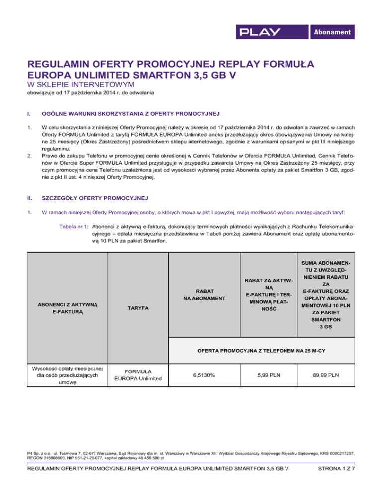 REGULAMIN OFERTY PROMOCYJNEJ REPLAY FORMUŁA EUROPA UNLIMITED SMARTFON 3,5 GB V W SKLEPIE INTERNETOWYM obowiązuje od 17 października 2014 r. do odwołania I. OGÓLNE WARUNKI SKORZYSTANIA Z OFERTY PROMOCYJNEJ 1. W celu skorzystania z niniejszej Oferty Promocyjnej należy w okresie od 17 października 2014 r. do odwołania zawrzeć w ramach Oferty FORMUŁA Unlimited z taryfą FORMUŁA EUROPA Unlimited aneks przedłużający okres obowiązywania Umowy na kolejne 25 miesięcy (Okres Zastrzeżony) pośrednictwem sklepu internetowego, zgodnie z warunkami opisanymi w pkt III niniejszego regulaminu. Prawo do zakupu Telefonu w promocyjnej cenie określonej w Cennik Telefonów w Ofercie FORMUŁA Unlimited, Cennik Telefonów w Ofercie Super FORMUŁA Unlimited przysługuje w przypadku zawarcia Umowy na Okres Zastrzeżony 25 miesięcy, przy czym promocyjna cena Telefonu uzależniona jest od wysokości wybranej przez Abonenta opłaty za pakiet Smartfon 3 GB, zgodnie z pkt II ust. 4 niniejszej Oferty Promocyjnej. 2. II. SZCZEGÓŁY OFERTY PROMOCYJNEJ 1. W ramach niniejszej Oferty Promocyjnej osoby, o których mowa w pkt I powyżej, mają możliwość wyboru następujących taryf: Tabela nr 1: Abonenci z aktywną e-fakturą, dokonujący terminowych płatności wynikających z Rachunku Telekomunikacyjnego – opłata miesięczna przedstawiona w Tabeli poniżej zawiera Abonament oraz opłatę abonamentową 10 PLN za pakiet Smartfon. RABAT NA ABONAMENT ABONENCI Z AKTYWNĄ E-FAKTURĄ TARYFA RABAT ZA AKTYWNĄ E-FAKTURĘ I TERMINOWĄ PŁATNOŚĆ SUMA ABONAMENTU Z UWZGLĘDNIENIEM RABATU ZA E-FAKTURĘ ORAZ OPŁATY ABONAMENTOWEJ 10 PLN ZA PAKIET SMARTFON 3 GB OFERTA PROMOCYJNA Z TELEFONEM NA 25 M-CY Wysokość opłaty miesięcznej dla osób przedłużających umowę FORMUŁA EUROPA Unlimited 6,5130% 5,99 PLN 89,99 PLN P4 Sp. z o.o., ul. Taśmowa 7, 02-677 Warszawa, Sąd Rejonowy dla m. st. Warszawy w Warszawie XIII Wydział Gospodarczy Krajowego Rejestru Sądowego, KRS 0000217207, REGON 015808609, NIP 951-21-20-077, kapitał zakładowy 48 456 500 zł REGULAMIN OFERTY PROMOCYJNEJ REPLAY FORMUŁA EUROPA UNLIMITED SMARTFON 3,5 GB V STRONA 1 Z 7 Tabela nr 2: Abonenci z fakturą papierową – opłata miesięczna przedstawiona w Tabeli poniżej zawiera Abonament oraz opłatę abonamentową 10 PLN za pakiet Smartfon. SUMA ABONAMENTU ORAZ OPŁATY ABONAMENTOWEJ 10 PLN ZA PAKIET SMARTFON 3 GB RABAT NA ABONAMENT ABONENCI Z FAKTURĄ PAPIEROWĄ TARYFA OFERTA PROMOCYJNA Z TELEFONEM NA 25 M-CY Wysokość opłaty miesięcznej dla osób przedłużających umowę FORMUŁA EUROPA Unlimited 6,5130% 95,98 PLN 2. W ramach niniejszej Oferty Promocyjnej osoby, o których mowa w pkt I otrzymują: 2.1. Rabat na Abonament, przyznawany każdego Okresu Rozliczeniowego przez cały okres obowiązywania Umowy, w wysokości uzależnionej od wybranej taryfy zgodnie z Tabelą nr 1 i 2 powyżej, przyznawany na zasadach opisanych w pkt II ust. 3 niniejszej Oferty Promocyjnej. 2.2. Pakiet Smartfon 3 GB na zasadach opisanych w pkt II ust. 4 niniejszej Oferty Promocyjnej; 2.3. Pakiet Internet 500 MB na zasadach opisanych w pkt II ust. 5 niniejszej Oferty Promocyjnej; 2.4. Możliwość korzystania z dodatkowej usługi „Darmowy Internet LTE”, zgodnie z zasadami opisanymi w pkt II ust 6 poniżej. 2.5. W przypadku zawarcia aneksu do Umowy w ramach taryfy FORMUŁA EUROPA Unlimited usługę „Pakiet 1000 minut na połączenia przychodzące w UE”, przyznawaną na zasadach opisanych w pkt II ust. 7 niniejszej Oferty Promocyjnej. 2.6. Dodatkowy rabat 50% na Abonament przyznawany przez trzy pierwsze pełne Okresy Rozliczeniowe, na zasadach opisanych w pkt. II ust. 9 niniejszej Oferty Promocyjnej. 2.7. W przypadku zawarcia aneksu do Umowy połączonej z zakupem Telefonu LG G3s, Usługę „Audiobooki w Play”, przyznawaną zgodnie z zasadami opisanymi w pkt. II ust. 10 poniżej. 3. Szczegóły przyznawania rabatów na Abonament, o których mowa w pkt II ust. 2.1: 3.1. Rabaty naliczane są od kwoty Abonamentu określonej w Cenniku Oferty FORMUŁA Unlimited dla poszczególnych taryf. 3.2. Rabaty naliczane są w pierwszej kolejności przed rabatem przyznawanym z tytułu aktywacji e-faktury. 3.3. Jeżeli rozpoczęcie świadczenia Usług Telekomunikacyjnych na zmienionych warunkach Umowy nastąpi w trakcie Okresu Rozliczeniowego, rabat naliczany jest od kwoty Abonamentu liczonej proporcjonalnie do liczby dni pozostałych do końca tego Okresu Rozliczeniowego. 3.4. Rabaty przyznawane są każdego Okresu Rozliczeniowego przez cały Okres Zastrzeżony oraz po przekształceniu Umowy w Umowę zawartą na czas nieokreślony. 3.5. Rabaty dotyczą tylko Abonamentu, wszystkie pozostałe opłaty będą naliczane zgodnie z Cennikiem Oferty FORMUŁA Unlimited. 4. Szczegóły przyznawania płatnego pakietu Smartfon, o którym mowa w pkt II ust. 2.2: Tabela nr 3: Pakiet Smartfon Miesięczna opłata za pakiet Smartfon TARYFA FORMUŁA EUROPA UNLIMITED Pakiet Smartfon 3 GB Oferty Promocyjne z telefonem na 25 miesięcy 20 PLN 30 PLN 40 PLN 50 PLN 70 PLN 120 PLN P4 Sp. z o.o., ul. Taśmowa 7, 02-677 Warszawa, Sąd Rejonowy dla m. st. Warszawy w Warszawie XIII Wydział Gospodarczy Krajowego Rejestru Sądowego, KRS 0000217207, REGON 015808609, NIP 951-21-20-077, kapitał zakładowy 48 456 500 zł REGULAMIN OFERTY PROMOCYJNEJ REPLAY FORMUŁA EUROPA UNLIMITED SMARTFON 3,5 GB V STRONA 2 Z 7 4.1. 4.2. 4.3. 4.4. 4.5. 4.6. 4.7. 4.8. 4.9. 4.10. 4.11. 4.12. 5. Pakiet może być wykorzystany na transmisję danych na terytorium Rzeczypospolitej Polskiej w zasięgu Sieci Telekomunikacyjnej, przy wykorzystaniu ustawień APN. Pakiet jest przyznawany pierwszego dnia każdego Okresu Rozliczeniowego pomiędzy godziną 00:00 a 01:00 przez cały Okres Zastrzeżony oraz po przekształceniu Umowy w Umowę na czas nieokreślony. Do czasu przyznania jednostek na pakiecie, transmisja danych jest Bezpłatna oraz odbywa się z prędkością do maksimum 8 kb/s. Transmisja danych w ramach pakietu rozlic