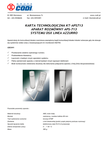 01-905 Warszawa ul. Renesansowa 7c tel.: (22) 8346626 fax: (22) 8353201 www.codi.pl e-mail: [email protected] KARTA TECHNOLOGICZNA KT-APS713 APARAT ROZMÓWNY APS-713 SYSTEMU DSX LINEA AZZURRO Aparat s³u¿y do komunikacji lokator-rozmówca zewnêtrzny b¹dŸ komunikacji lokator-lokator wówczas gdy nie stosuje siê systemów wideo wraz z towarzysz¹cymi im monitorami M2700. CECHY: P P P P P Powtarzanie ostatnio wybranego numeru Podœwietlenie klawiatury £¹cznoœæ z ka¿dym innym aparatem systemu Pe³na zamiennoœæ aparatu z niemal ka¿dym innym typowym telefonem Brak koniecznoœci otwierania obudowy dla dokonania po³¹czenia aparatu z lini¹ (linia dwuprzewodowa) Pozosta³e parametry aparatu : Materia³ obudowy ABS, kolor bia³y Monta¿ naœcienny, rozstaw ko³ków 86 mm Tryb wybierania numerów tonowy DTMF Zasilanie z linii lokatorskiej (pobór pr¹du jedynie podczas rozmowy) Sposób ³¹czenia kabla telefoniczny wtyk RJ12 (2 przewody) Zakres temperatur pracy 0 ... + 40 EC Masa 280 g