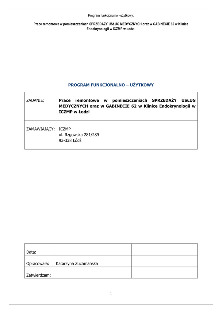 Program funkcjonalno –uŜytkowy: Prace remontowe w pomieszczeniach SPRZEDAśY USŁUG MEDYCZNYCH oraz w GABINECIE 62 w Klinice Endokrynologii w ICZMP w Łodzi. PROGRAM FUNKCJONALNO – UśYTKOWY ZADANIE: Prace remontowe w pomieszczeniach SPRZEDAśY USŁUG MEDYCZNYCH oraz w GABINECIE 62 w Klinice Endokrynologii w ICZMP w Łodzi ZAMAWIAJĄCY: ICZMP ul. Rzgowska 281/289 93-338 Łódź Data: Opracowała: Katarzyna Zuchmańska Zatwierdzam: 1 Program funkcjonalno –uŜytkowy: Prace remontowe w pomieszczeniach SPRZEDAśY USŁUG MEDYCZNYCH oraz w GABINECIE 62 w Klinice Endokrynologii w ICZMP w Łodzi. Kody robót budowlanych wg Numerycznego Słownika Głównego wspólnego słownika zamówień (CPV) ................................................................................................................................ 4 1. DANE OGÓLNE. ............................................................................................................................. 5 1.1. 2. DANE EWIDENCYJNE. .......................................................................................................... 5 1.1.1. NAZWA NADANA ZAMÓWIENIU PRZEZ ZAMAWIAJĄCEGO.................................... 5 1.1.2. ADRES OBIEKTU. .......................................................................................................... 5 1.1.3. NAZWA I ADRES INWESTORA. ................................................................................... 5 1.2. PODSTAWA OPRACOWANIA. .............................................................................................. 5 1.3. CEL OPRACOWANIA. ............................................................................................................ 5 1.4. PRZEDMIOT OPRACOWANIA. ............................................................................................. 5 CZĘŚĆ OPISOWA. ......................................................................................................................... 6 2.1. OPIS OGÓLNY PRZEDMIOTU ZAMÓWIENIA. ................................................................... 6 2.2. CHARAKTERYSTYCZNE PARAMETRY OKREŚLAJĄCE ZAKRES ROBÓT BUDOWLANYCH. ............................................................................................................................... 6 2.2.1. 2.3. 2.2.1.1. POMIESZCZENIA SPRZEDAśY USŁUG MEDYCZNYCH ..................................... 6 2.2.1.2. GABINET 62 W KLINICE ENDOKRYNOLOGII.................................................... 6 CHARAKTERYSTYKA PRZEDSIĘWZIĘCIA. ......................................................................... 6 2.3.1. POMIESZCZENIA SPRZEDAśY USŁUG MEDYCZNYCH. ............................................ 6 2.3.1.1. PROJEKT TECHNICZNY ........................................................................................ 7 2.3.1.2. ROBOTY BUDOWLANE ......................................................................................... 7 2.3.1.3. INSTALACJE ELEKTRYCZNE................................................................................. 8 2.3.1.4. INSTALACJE TELETECHNICZNE .......................................................................... 8 2.3.2. 1.1. LOKALIZACJA................................................................................................................. 6 GABINET 62 W KLINICE ENDOKRYNOLOGII.......................................................... 11 2.3.2.1. WYKONANIE PROJEKTU TECHNICZNEGO....................................................... 11 2.3.2.2. ROBOTY BUDOWLANE ....................................................................................... 11 2.3.2.3. INSTALACJE ELEKTRYCZNE............................................................................... 12 2.3.2.4. INSTALACJE SANITARNE ................................................................................... 12 2.3.2.5. INSTALACJE TELETECHNICZNE ........................................................................ 12 AKTUALNE UWARUNKOWANIA WYKONANIA PRZEDMIOTU ZAMÓWIENIA.............. 13 2 Program funkcjonalno –uŜytkowy: Prace remontowe w pomieszczeniach SPRZEDAśY USŁUG MEDYCZNYCH oraz w GABINECIE 62 w Klinice Endokrynologii w ICZMP w Łodzi. 1.1.1. DOKUMENTY FORMALNO-PRAWNE. ............................................................................ 13 1.1.2. UWARUNKOWANIA WYNIKAJĄCE Z LOKALIZACJI INWESTYCJI............................. 13 1.1.3. UZBROJENIE TERENU I ZASILANIE W MEDIA. .......................................................... 13 1.1.4. UWARUNKOWANIA TECHNICZNE. ............................................................................... 13 1.1.5. PROJEKT TECHNICZNY .................................................................................................. 13 1.1.6. ORGANIZACJA BUDOWY................................................................................................ 13 1.1.7. INSPEKTOR NADZORU................................................................................................... 13 1.1.8. WIZJA LOKALNA.............................................................................................................. 13 1.2. OPIS WYMAGAŃ ZAMAWIAJĄCEGO W STOSUNKU DO PRZEDMIOTU ZAMÓWIENIA. 13 1.2.1. PRZYGOTOWANIE DOKUMENTACJI PROJEKTOWEJ ................................................. 13 1.2.2. PRZYGOTOWANIE TERENU PROWADZENIA PRAC.................................................... 14 1.2.3. WYMAGANIA DOTYCZĄCE ZASTOSOWANYCH MATERIAŁÓW. ............................... 14 DOCIEPLENIE OD WEWNĄTRZ ............................................................................................. 15 POSADZKI................................................................................................................................. 15 TYNKI WEWNĘTRZNE ............................................................................................................ 15 MALOWANIE ............................................................................................