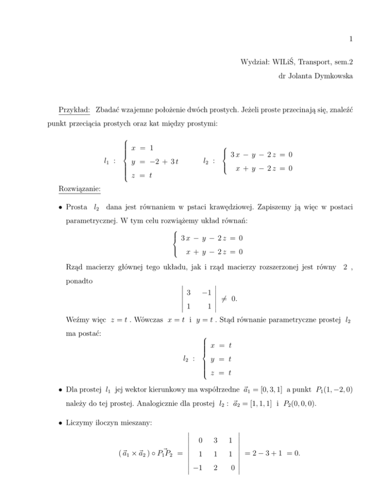 1 Wydział: WILiŚ, Transport, sem.2 dr Jolanta Dymkowska Przykład: Zbadać wzajemne położenie dwóch prostych. Jeżeli proste przecinają się, znaleźć punkt przeciącia prostych oraz kat między prostymi: l1 : x = 1 l2 : y = −2 + 3 t z = t 3x − y − 2z = 0 x + y − 2z = 0 Rozwiązanie: • Prosta l2 dana jest równaniem w pstaci krawędziowej. Zapiszemy ją więc w postaci parametrycznej. W tym celu rozwiążemy układ równań: 3x − y − 2z = 0 x + y − 2z = 0 Rząd macierzy głównej tego układu, jak i rząd macierzy rozszerzonej jest równy 2 , ponadto 3 1 −1 6= 0. 1 Weźmy więc z = t . Wówczas x = t i y = t . Stąd równanie parametryczne prostej l2 ma postać: l2 : x = t y = t z = t • Dla prostej l1 jej wektor kierunkowy ma współrzedne ~a1 = [0, 3, 1] a punkt P1 (1, −2, 0) należy do tej prostej. Analogicznie dla prostej l2 : ~a2 = [1, 1, 1] i P2 (0, 0, 0). • Liczymy iloczyn mieszany: ( ~a1 × ~a2 ) ◦ P1~P2 0 = 1 −1 3 1 2 1 1 = 2 − 3 + 1 = 0. 0 2 Ponieważ ( ~a1 × ~a2 ) ◦ P1~P2 = 0 , to proste l1 i l2 są współpłaszczyznowe. • Obliczmy kąt pomiedzy tymi prostymi: cos α = | ~a1 ◦ ~a2 | 4 4 = √ √ = √ . | ~a1 | · | ~a2 | 10 3 30 • Obliczamy punkt przecięcia prostych, rozwiązując układ równań: 1 −2 + 3 t t = s = s = s Jest to układ trzech równań z dwoma niewiadomymi. Z geometrii wiemy, że układ ten ma dokładnie jedno rozwiązanie: t = s = 1 . Stąd punkt przecięcia prostych ma współrzędne P (1, 1, 1) .