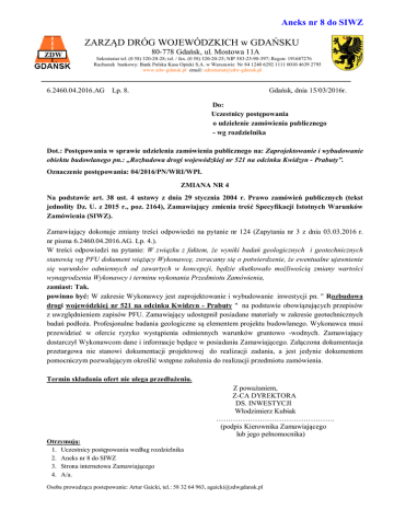 Aneks nr 8 do SIWZ ZARZ D DRÓG WOJEWÓDZKICH w GDA SKU 80-778 Gda sk, ul. Mostowa 11A Sekretariat tel. (0 58) 320-20-28; tel. / fax. (0 58) 320-20-25; NIP 583-25-90-397; Regon: 191687276 Rachunek bankowy: Bank Polska Kasa Opieki S.A. w Warszawie Nr 84 1240 6292 1111 0010 4639 2795 www.zdw-gdansk.pl email: [email protected] 6.2460.04.2016.AG Lp. 8. Gda sk, dnia 15/03/2016r. Do: Uczestnicy post powania o udzielenie zamówienia publicznego - wg rozdzielnika Dot.: Post powania w sprawie udzielenia zamówienia publicznego na: Zaprojektowanie i wybudowanie obiektu budowlanego pn.: „Rozbudowa drogi wojewódzkiej nr 521 na odcinku Kwidzyn - Prabuty”. Oznaczenie post powania: 04/2016/PN/WRI/WPI. ZMIANA NR 4 Na podstawie art. 38 ust. 4 ustawy z dnia 29 stycznia 2004 r. Prawo zamówie publicznych (tekst jednolity Dz. U. z 2015 r., poz. 2164), Zamawiaj cy zmienia tre Specyfikacji Istotnych Warunków Zamówienia (SIWZ). Zamawiaj cy dokonuje zmiany tre ci odpowiedzi na pytanie nr 124 (Zapytania nr 3 z dnia 03.03.2016 r. nr pisma 6.2460.04.2016.AG. Lp. 4.). W tre ci odpowiedzi na pytanie: W zwi zku z faktem, e wyniki bada geologicznych i geotechnicznych stanowi wg PFU dokument wi cy Wykonawc , zwracamy si o potwierdzenie, e ewentualne ujawnienie si warunków odmiennych od zawartych w koncepcji, b dzie skutkowa o mo liwo ci zmiany warto ci wynagrodzenia Wykonawcy i terminu wykonania Przedmiotu Zamówienia, zamiast: Tak. powinno by : W zakresie Wykonawcy jest zaprojektowanie i wybudowanie inwestycji pn. " Rozbudowa drogi wojewódzkiej nr 521 na odcinku Kwidzyn - Prabuty " na podstawie obowi zuj cych przepisów z uwzgl dnieniem zapisów PFU. Zamawiaj cy udost pni posiadane materia y w zakresie geotechnicznych bada pod a. Profesjonalne badania geologiczne s elementem projektu budowlanego. Wykonawca musi przewidzie w ofercie ryzyko wyst pienia odmiennych warunków gruntowo -wodnych. Zamawiaj cy dostarczy Wykonawcom dane i informacje b ce w posiadaniu Zamawiaj cego. Za czona dokumentacja przetargowa nie stanowi dokumentacji projektowej do realizacji zadania, a jest jedynie dokumentem pomocniczym pozwalaj cym okre li wst pne za enia do realizacji przedmiotu zamówienia. Termin sk adania ofert nie ulega przed eniu. Z powa aniem, Z-CA DYREKTORA DS. INWESTYCJI W odzimierz Kubiak …………………………………………. (podpis Kierownika Zamawiaj cego lub jego pe nomocnika) Otrzymuj : 1. Uczestnicy post powania wed ug rozdzielnika 2. Aneks nr 8 do SIWZ 3. Strona internetowa Zamawiaj cego 4. A/a. Osoba prowadz ca postepowanie: Artur Gaicki, tel.: 58 32 64 963, [email protected] Aneks nr 8 do SIWZ ZARZ D DRÓG WOJEWÓDZKICH w GDA SKU 80-778 Gda sk, ul. Mostowa 11A Sekretariat tel. (0 58) 320-20-28; tel. / fax. (0 58) 320-20-25; NIP 583-25-90-397; Regon: 191687276 Rachunek bankowy: Bank Polska Kasa Opieki S.A. w Warszawie Nr 84 1240 6292 1111 0010 4639 2795 www.zdw-gdansk.pl email: [email protected] 6.2460.04.2016.AG Lp. 8. Gda sk, dnia 15/03/2016r. Do: Uczestnicy post powania o udzielenie zamówienia publicznego - wg rozdzielnika Dot.: Post powania w sprawie udzielenia zamówienia publicznego na: Zaprojektowanie i wybudowanie obiektu budowlanego pn.: „Rozbudowa drogi wojewódzkiej nr 521 na odcinku Kwidzyn - Prabuty”. Oznaczenie post powania: 04/2016/PN/WRI/WPI. ZMIANA NR 4 Na podstawie art. 38 ust. 4 ustawy z dnia 29 stycznia 2004 r. Prawo zamówie publicznych (tekst jednolity Dz. U. z 2015 r., poz. 2164), Zamawiaj cy zmienia tre Specyfikacji Istotnych Warunków Zamówienia (SIWZ). Zamawiaj cy dokonuje zmiany tre ci odpowiedzi na pytanie nr 124 (Zapytania nr 3 z dnia 03.03.2016 r. nr pisma 6.2460.04.2016.AG. Lp. 4.). W tre ci odpowiedzi na pytanie: W zwi zku z faktem, e wyniki bada geologicznych i geotechnicznych stanowi wg PFU dokument wi cy Wykonawc , zwracamy si o potwierdzenie, e ewentualne ujawnienie si warunków odmiennych od zawartych w koncepcji, b dzie skutkowa o mo liwo ci zmiany warto ci wynagrodzenia Wykonawcy i terminu wykonania Przedmiotu Zamówienia, zamiast: Tak. powinno by : W zakresie Wykonawcy jest zaprojektowanie i wybudowanie inwestycji pn. " Rozbudowa drogi wojewódzkiej nr 521 na odcinku Kwidzyn - Prabuty " na podstawie obowi zuj cych przepisów z uwzgl dnieniem zapisów PFU. Zamawiaj cy udost pni posiadane materia y w zakresie geotechnicznych bada pod a. Profesjonalne badania geologiczne s elementem projektu budowlanego. Wykonawca musi przewidzie w ofercie ryzyko wyst pienia odmiennych warunków gruntowo -wodnych. Zamawiaj cy dostarczy Wykonawcom dane i informacje b ce w posiadaniu Zamawiaj cego. Za czona dokumentacja przetargowa nie stanowi dokumentacji projektowej do realizacji zadania, a jest jedynie dokumentem pomocniczym pozwalaj cym okre li wst pne za enia do realizacji przedmiotu zamówienia. Termin sk adania ofert nie ulega przed eniu. Z powa aniem, Z-CA DYREKTORA DS. INWESTYCJI W odzimierz Kubiak …………………………………………. (podpis Kierownika Zamawiaj cego lub jego pe nomocnika) Otrzymuj : 1. Uczestnicy post powania wed ug rozdzielnika 2. Aneks nr 8 do SIWZ 3. Strona internetowa Zamawiaj cego 4. A/a. Osoba prowadz ca postepowanie: Artur Gaicki, tel.: 58 32 64 963, [email protected] Aneks nr 8 do SIWZ ZARZ D DRÓG WOJEWÓDZKICH w GDA SKU 80-778 Gda sk, ul. Mostowa 11A Sekretariat tel. (0 58) 320-20-28; tel. / fax. (0 58) 320-20-25; NIP 583-25-90-397; Regon: 191687276 Rachunek bankowy: Bank Polska Kasa Opieki S.A. w Warszawie Nr 84 1240 6292 1111 0010 4639 2795 www.zdw-gdansk.pl email: [email protected] 6.2460.04.2016.AG Lp. 8. Gda sk, dnia 15/03/2016r. Do: Uczestnicy post powania o udzielenie zamówienia publicznego - wg rozdzielnika Dot.: Post powania w sprawie udzielenia zamówienia publicznego na: Zaprojektowanie i wybudowanie obiektu budowlanego pn.: „Rozbudowa drogi wojewódzkiej nr 521 na odcinku Kwidzyn - Prabuty”. Oznaczenie post powania: 04/2016/PN/WRI/WPI. ZMIANA NR 4 Na podstawie art. 38 ust. 4 ustawy z dnia 29 stycznia 2004 r.
