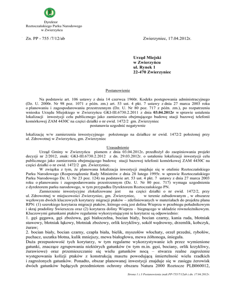 Dyrektor Roztoczańskiego Parku Narodowego w Zwierzyńcu Zn. PP - 755 /7/12/ab Zwierzyniec, 17.04.2012r. Urząd Miejski w Zwierzyńcu ul. Rynek 1 22-470 Zwierzyniec Postanowienie Na podstawie art. 106 ustawy z dnia 14 czerwca 1960r. Kodeks postępowania administracyjnego (Dz. U. 2000r. Nr 98 poz. 1071 z późn. zm.) art. 53 ust. 4 pkt. 7 ustawy z dnia 27 marca 2003 roku o planowaniu i zagospodarowaniu przestrzennym (Dz. U. Nr 80 poz. 717 z późn. zm.), po rozpatrzeniu wniosku Urzędu Miejskiego w Zwierzyńcu GKI-III.6730.2.2011 z dnia 03.04.2012r w sprawie ustalenia lokalizacji inwestycji celu publicznego jako zamierzenia obejmującego budowę stacji bazowej telefonii komórkowej ZAM 4430C na części działki o nr ewid. 1472/2 gm. Zwierzyniec postanawia uzgodnić negatywnie lokalizację w/w zamierzenia inwestycyjnego położonego na działkce nr ewid. 1472/2 położonej przy ul. Zdrowotnej w Zwierzyńcu, gm. Zwierzyniec Uzasadnienie Urząd Gminy w Zwierzyńcu pismem z dnia 03.04.2012r. przedłożył do zaopiniowania projekt decyzji nr 2/2012, znak: GKI-III.6730.2.2012 z dn. 29.03.2012r. o ustaleniu lokalizacji inwestycji celu publicznego jako zamierzenia obejmującego budowę stacji bazowej telefonii komórkowej ZAM 4430C na części działki o nr ewid. 1472/2 gm. Zwierzyniec. W związku z tym, że planowana lokalizacja inwestycji znajduje się w otulinie Roztoczańskiego Parku Narodowego (Rozporządzenie Rady Ministrów z dnia 28 lutego 1995r. w sprawie Roztoczańskiego Parku Narodowego Dz. U. Nr 23 poz. 124) na podstawie art. 53 ust. 4 pkt. 7 ustawy z dnia 27 marca 2003 roku o planowaniu i zagospodarowaniu przestrzennym (Dz. U. Nr 80 poz. 717) wymaga uzgodnienia z dyrektorem parku narodowego, w tym przypadku Dyrektorem Roztoczańskiego PN. Zamierzenie inwestycyjne zlokalizowane jest na części działki o nr ewid. 1472/2, przy ul. Zdrowotnej w miejscowości Zwierzyniec, gm. Zwierzyniec, w terenie zabudowanym , w obszarze węzłowym dwóch kluczowych korytarzy migracji ptaków – zdefiniowanych w materiałach do projektu planu RPN: (1) szerokiego korytarza migracji ptaków, którego osią jest dolina Wieprza w przebiegu południkowym i skraj pradoliny Świerszcza oraz (2) korytarza doliny Wieprza – biegnącego w układzie równoleżnikowym. Kluczowymi gatunkami ptaków regularnie wykorzystującymi te korytarze są odpowiednio: 1. gęś gęgawa, gęś zbożowa, gęś białoczelna, bocian biały, bocian czarny, kania ruda, błotniak stawowy, błotniak łąkowy, błotniak zbożowy, orlik krzykliwy, sokół wędrowny, drzemlik, kobczyk, żuraw; 2. bocian biały, bocian czarny, czapla biała, bielik, myszołów włochaty, orzeł przedni, rybołów, puchacz, uszatka błotna, kulik mniejszy, mewa białogłowa, mewa żółtonoga, śnieguła. Duża przepustowość tych korytarzy, w tym regularne wykorzystywanie ich przez wymienione gatunki, znaczące zgrupowania niektórych gatunków (w tym m.in. gęsi, bociany, orlik krzykliwy, żurawiowe) oraz przemieszczanie się wielu gatunków nocą – stwarza realne zagrożenie występowania kolizji ptaków z konstrukcją masztu powodującą śmiertelność wielu rzadkich i zagrożonych gatunków. Ponadto, obszar planowanej inwestycji znajduje się w zasięgu żerowisk dwóch gatunków będących przedmiotem ochrony obszaru Natura 2000 Roztocze PLB060012, Strona 1 z 3 Postanowienia znak:PP-755/7/12ab z dn. 17.04.2012r. gniazdujących w Roztoczańskim Parku Narodowym – trzmielojada i orlika krzykliwego. Funkcjonowanie masztu może stwarzać zagrożenie kolizji z ptakami oraz ograniczyć w sposób istotny funkcjonalność żerowisk tych gatunków. W wyniku takich działań zostanie pogorszona integralność Roztoczańskiego PN z obszarem przyrodniczym Roztocza. Nie można bowiem rozpatrywać wpływu inwestycji jedynie na terenie bezpośrednio objętym zmianami, ale należy rozpatrywać kompleksowo w odniesieniu do całości przestrzeni przyrodniczej, gdyż zgodnie z art. 33 ustawy o ochronie przyrody (Dz. U. z 2009r. Nr 151, poz. 1220) zabrania się podejmowania działań mogących pogorszyć integralność obszaru Natura 2000 lub jego powiązanie z innymi obszarami w tym przypadku z Roztoczański PN. Ze względu na status wymienionych gatunków w Parku oraz ustawowy obowiązek ich ochrony w obszarze Parku – zarówno w odniesieniu do miejsc gniazdowania jak również obszarów funkcjonalnych (żerowisk, miejsc odpoczynku itp.) – zlokalizowanie planowanej inwestycji w omawianym miejscu stoi w sprzeczności z celami i zakresem działań ochronnych RPN – przez co inwestycja nie powinna zostać zrealizowana. Zgodnie z art. 5 pkt. 2 ustawy o ochronie przyrody, korytarz ekologiczny jest obszarem umożliwiającym migrację roślin, zwierząt lub grzybów. Do zachowania ciągów komunikacyjnych dla zwierząt (korytarzy migracyjnych, zobowiązuje również § 10 pkt 3 lit. h) Rozporządzenia Ministra Środowiska z dn. 28 września 2004r. w sprawie gatunków dziko występujących zwierząt objętych ochroną (Dz. U. Nr 220, poz. 2237), który stanowi, iż sposoby ochrony gatunków dziko występujących zwierząt polegają w szczególności na tworzeniu i utrzymywaniu korytarzy umożliwiających migrację. Utrzymanie korytarzy migracyjnych (ekologicznych), jest bardzo ważne w celu zachowania różnorodności biologicznej, szczególnie w obrębie parku narodowego, w tym przypadku Roztoczańskiego Parku Narodowego, utworzonego m.in. w tym celu (art. 8 ust. 2 ustawy o ochronie przyrody). przywołana ustawa również w art. 5 pkt. 6 definiuje różnorodność biologiczną jako zróżnicowanie żywych organizmów występujących w ekosystemach w obrębie gatunku i między gatunkami, oraz zróżnicowanie ekosystemów. Ustawodawca wyraźnie wskazuje, iż przez pojęcie różnorodności biologicznej należy rozumieć nie tylko zróżnicowanie między gatunkami (rozumiane jako liczba gatunków na jednostce powierzchni ale również zróżnicowanie w obrębie gatu