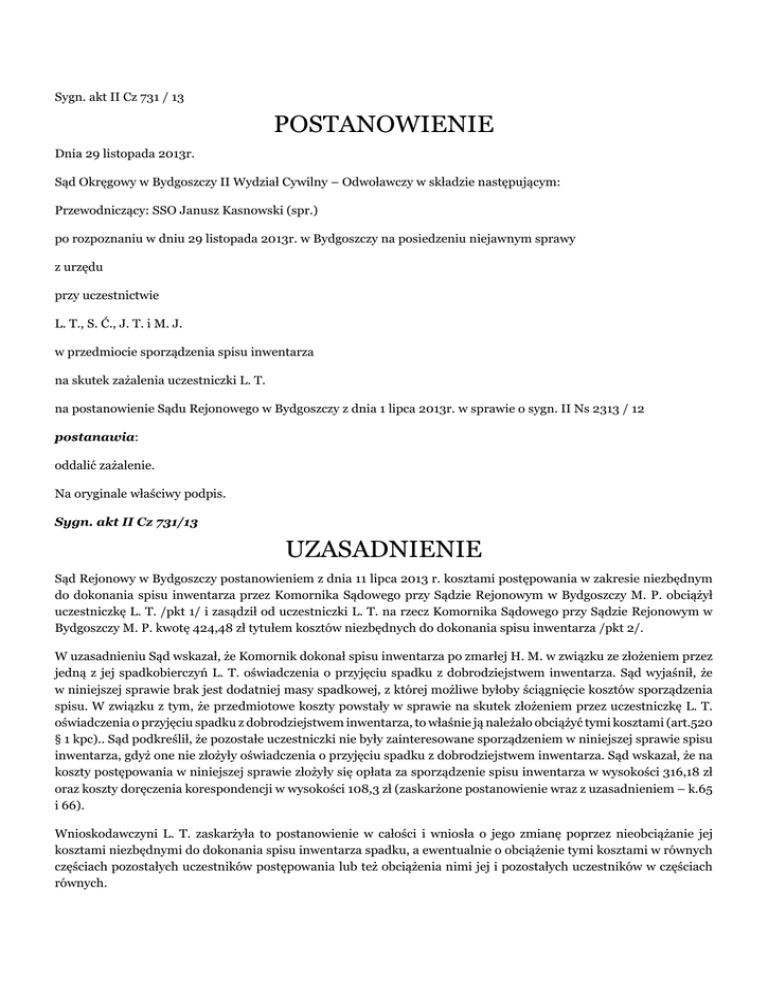 Sygn. akt II Cz 731 / 13 POSTANOWIENIE Dnia 29 listopada 2013r. Sąd Okręgowy w Bydgoszczy II Wydział Cywilny – Odwoławczy w składzie następującym: Przewodniczący: SSO Janusz Kasnowski (spr.) po rozpoznaniu w dniu 29 listopada 2013r. w Bydgoszczy na posiedzeniu niejawnym sprawy z urzędu przy uczestnictwie L. T., S. Ć., J. T. i M. J. w przedmiocie sporządzenia spisu inwentarza na skutek zażalenia uczestniczki L. T. na postanowienie Sądu Rejonowego w Bydgoszczy z dnia 1 lipca 2013r. w sprawie o sygn. II Ns 2313 / 12 postanawia: oddalić zażalenie. Na oryginale właściwy podpis. Sygn. akt II Cz 731/13 UZASADNIENIE Sąd Rejonowy w Bydgoszczy postanowieniem z dnia 11 lipca 2013 r. kosztami postępowania w zakresie niezbędnym do dokonania spisu inwentarza przez Komornika Sądowego przy Sądzie Rejonowym w Bydgoszczy M. P. obciążył uczestniczkę L. T. /pkt 1/ i zasądził od uczestniczki L. T. na rzecz Komornika Sądowego przy Sądzie Rejonowym w Bydgoszczy M. P. kwotę 424,48 zł tytułem kosztów niezbędnych do dokonania spisu inwentarza /pkt 2/. W uzasadnieniu Sąd wskazał, że Komornik dokonał spisu inwentarza po zmarłej H. M. w związku ze złożeniem przez jedną z jej spadkobierczyń L. T. oświadczenia o przyjęciu spadku z dobrodziejstwem inwentarza. Sąd wyjaśnił, że w niniejszej sprawie brak jest dodatniej masy spadkowej, z której możliwe byłoby ściągnięcie kosztów sporządzenia spisu. W związku z tym, że przedmiotowe koszty powstały w sprawie na skutek złożeniem przez uczestniczkę L. T. oświadczenia o przyjęciu spadku z dobrodziejstwem inwentarza, to właśnie ją należało obciążyć tymi kosztami (art.520 § 1 kpc).. Sąd podkreślił, że pozostałe uczestniczki nie były zainteresowane sporządzeniem w niniejszej sprawie spisu inwentarza, gdyż one nie złożyły oświadczenia o przyjęciu spadku z dobrodziejstwem inwentarza. Sąd wskazał, że na koszty postępowania w niniejszej sprawie złożyły się opłata za sporządzenie spisu inwentarza w wysokości 316,18 zł oraz koszty doręczenia korespondencji w wysokości 108,3 zł (zaskarżone postanowienie wraz z uzasadnieniem – k.65 i 66). Wnioskodawczyni L. T. zaskarżyła to postanowienie w całości i wniosła o jego zmianę poprzez nieobciążanie jej kosztami niezbędnymi do dokonania spisu inwentarza spadku, a ewentualnie o obciążenie tymi kosztami w równych częściach pozostałych uczestników postępowania lub też obciążenia nimi jej i pozostałych uczestników w częściach równych. W uzasadnieniu zażalenia skarżąca wskazała, że nie powinna ponosić kosztów sporządzenia spisu inwentarza, gdyż jako osoba przyjmująca spadek z dobrodziejstwem inwentarza nie odpowiada za długi spadkowe ponad wartość stanu czynnego spadku. Ponadto jej zdaniem Sąd winien zastosować w stosunku do niej zasadę słuszności z art. 102 kpc. Wskazała również, że jeszcze przed złożeniem wniosku o stwierdzenie nabycia spadku po swojej matce spłaciła zaciągniętą przez nią pożyczkę w (...) im. (...). Podała również, że jest osobą schorowaną – ma niedoczynność tarczycy oraz leczy się onkologicznie. Utrzymuje się z renty chorobowej i znaczną część pieniędzy uzyskiwanych z tego źródła przeznacza na zakup niezbędnych leków. Mieszka w miejscu pracy swojej córki, gdzie udostępniono jej mały pokoik bez okien (zażalenie – k. 74 do 97). Sąd Okręgowy zważył, co następuje: Zażalenie wnioskodawczyni nie znajduje uzasadnienia. Sąd I instancji prawidłowo wskazał, że art. 520 § 1 kpc przewiduje zasadę, że każdy uczestnik postępowania nieprocesowego ponosi koszty postępowania związane ze swoim udziałem w sprawie. Dotyczy to zarówno kosztów sądowych, jak również kosztów zastępstwa procesowego. W przypadku, gdy skład stanu czynnego spadku nie pozwala na pokrycie z masy spadkowej kosztów sporządzenia spisu inwentarza, to należy nimi obciążyć podmiot, którego działanie wywołało potrzebę sporządzenia tego spisu. Taka sytuacja zaistniała w niniejszej sprawie. Komornik w protokole spisu inwentarza z dnia 7 maja 2013r. stwierdził, że na aktywa pozostałe po H. M. składa się kwota 1,65 zł na rachunku w banku (...) S.A. w W. oraz rzeczy codziennego użytku bez wartości rynkowej. Natomiast spadek obciąża dług w (...) im. (...) na kwotę 5 327,34 zł. Nie miała racji skarżąca podnosząc, że ze względu na przyjęcie przez nią spadku po zmarłej matce z dobrodziejstwem inwentarza, nie powinna ona ponosić kosztów sporządzenia spisu inwentarza, które przekraczają wartość stanu czynnego spadku. Wskazać należy, że koszty sporządzenia spisu inwentarza spadkowego nie stanowią długów spadkowych wobec czego nie ma do nich zastosowanie ograniczenie odpowiedzialności spadkobiercy przewiedziane w art. 1031 § 2 kc. Nie mógł zostać uwzględniony zgłoszony przez skarżącą wniosek o obciążenie przedmiotowymi kosztami wyłącznie pozostałych uczestniczących w sprawie spadkobierczyń H. M. lub wszystkich uczestniczek postępowania łącznie z wnioskodawczynią. Jak słusznie wskazał Sąd Rejonowy, to na skutek złożenia przez L. T. oświadczenia o przyjęciu spadku z dobrodziejstwem inwentarza, wystąpiła konieczność sporządzenia spisu inwentarza spadkowego. Inne spadkobierczynie nie składały w tym zakresie żadnych oświadczeń woli. Z tego względu nie mogą zostać obciążone kosztami czynności Komornika. Zauważyć również trzeba, że do sytuacji istniejącej w niniejszej sprawie nie może mieć zastosowania przewidziany w art. 520 § 2 kpc wyjątek od zasady, że każdy z uczestników ponosi koszty postępowania związane ze swym udziałem w sprawie, bowiem każda ze spadkobierczyń jest w jednakowym stopniu zainteresowana wynikiem postępowania spadkowego (jako całości) i w tym sensie ich interesy nie są sprzeczne. Nie stanowi także podstawy do zwolnienia wnioskodawczyni od obowiązku uis