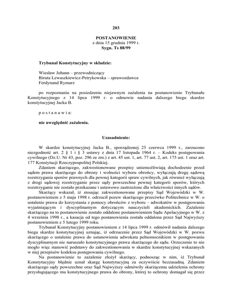 203 POSTANOWIENIE z dnia 15 grudnia 1999 r. Sygn. Ts 88/99