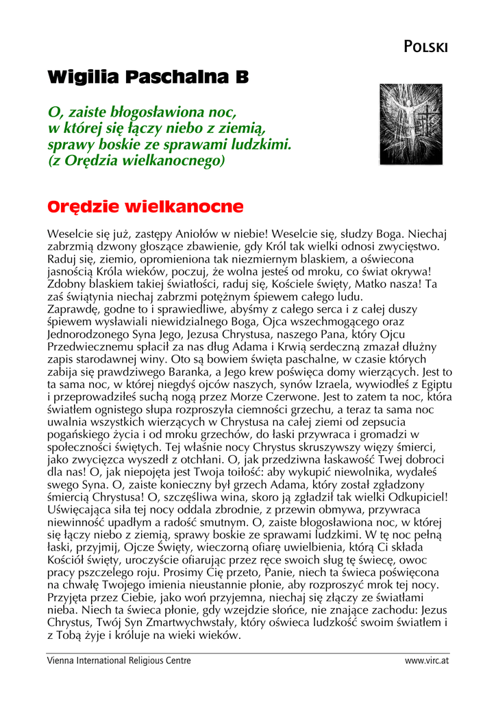 Polski O, zaiste błogosławiona noc, w której się łączy niebo z ziemią, sprawy boskie ze sprawami ludzkimi. (z Orędzia wielkanocnego) Weselcie się już, zastępy Aniołów w niebie! Weselcie się, słudzy Boga. Niechaj zabrzmią dzwony głoszące zbawienie, gdy Król tak wielki odnosi zwycięstwo. Raduj się, ziemio, opromieniona tak niezmiernym blaskiem, a oświecona jasnością Króla wieków, poczuj, że wolna jesteś od mroku, co świat okrywa! Zdobny blaskiem takiej światłości, raduj się, Kościele święty, Matko nasza! Ta zaś świątynia niechaj zabrzmi potężnym śpiewem całego ludu. Zaprawdę, godne to i sprawiedliwe, abyśmy z całego serca i z całej duszy śpiewem wysławiali niewidzialnego Boga, Ojca wszechmogącego oraz Jednorodzonego Syna Jego, Jezusa Chrystusa, naszego Pana, który Ojcu Przedwiecznemu spłacił za nas dług Adama i Krwią serdeczną zmazał dłużny zapis starodawnej winy. Oto są bowiem święta paschalne, w czasie których zabija się prawdziwego Baranka, a Jego krew poświęca domy wierzących. Jest to ta sama noc, w której niegdyś ojców naszych, synów Izraela, wywiodłeś z Egiptu i przeprowadziłeś suchą nogą przez Morze Czerwone. Jest to zatem ta noc, która światłem ognistego słupa rozproszyła ciemności grzechu, a teraz ta sama noc uwalnia wszystkich wierzących w Chrystusa na całej ziemi od zepsucia pogańskiego życia i od mroku grzechów, do łaski przywraca i gromadzi w społeczności świętych. Tej właśnie nocy Chrystus skruszywszy więzy śmierci, jako zwycięzca wyszedł z otchłani. O, jak przedziwna łaskawość Twej dobroci dla nas! O, jak niepojęta jest Twoja toiłość: aby wykupić niewolnika, wydałeś swego Syna. O, zaiste konieczny był grzech Adama, który został zgładzony śmiercią Chrystusa! O, szczęśliwa wina, skoro ją zgładził tak wielki Odkupiciel! Uświęcająca siła tej nocy oddala zbrodnie, z przewin obmywa, przywraca niewinność upadłym a radość smutnym. O, zaiste błogosławiona noc, w której się łączy niebo z ziemią, sprawy boskie ze sprawami ludzkimi. W tę noc pełną łaski, przyjmij, Ojcze Święty, wieczorną ofiarę uwielbienia, którą Ci składa Kościół święty, uroczyście ofiarując przez ręce swoich sług tę świecę, owoc pracy pszczelego roju. Prosimy Cię przeto, Panie, niech ta świeca poświęcona na chwałę Twojego imienia nieustannie płonie, aby rozproszyć mrok tej nocy. Przyjęta przez Ciebie, jako woń przyjemna, niechaj się złączy ze światłami nieba. Niech ta świeca płonie, gdy wzejdzie słońce, nie znające zachodu: Jezus Chrystus, Twój Syn Zmartwychwstały, który oświeca ludzkość swoim światłem i z Tobą żyje i króluje na wieki wieków. Vienna International Religious Centre www.virc.at Na początku Bóg stworzył niebo i ziemię. Ziemia zaś była bezładem i pustkowiem: ciemność była nad powierzchnią bezmiaru wód, a Duch Boży unosił się nad wodami. Wtedy Bóg rzekł: "Niechaj się stanie światłość!" I stała się światłość. Bóg widząc, że światłość jest dobra, oddzielił ją od ciemności. I nazwał Bóg światłość dniem, a ciemność nazwał nocą. I tak upłynął wieczór i poranek, dzień pierwszy. A potem Bóg rzekł: "Niechaj powstanie sklepienie w środku wód i niechaj ono oddzieli jedne wody od drugich!" Uczyniwszy to sklepienie, Bóg oddzielił wody pod sklepieniem od wód ponad sklepieniem; a gdy tak się stało, Bóg nazwał to sklepienie niebem. I tak upłynął wieczór, a po nim poranek, dzień drugi. A potem Bóg rzekł: "Niechaj zbiorą się wody spod nieba w jedno miejsce i niech się ukaże powierzchnia sucha!" A gdy tak się stało, Bóg nazwał tę suchą powierzchnię ziemią, a zbiorowisko wód nazwał morzem. Bóg widząc, że były dobre, rzekł: "Niechaj ziemia wyda rośliny zielone: trawy dające nasiona, drzewa owocowe rodzące na ziemi według swego gatunku owoce, w których są nasiona". I stało się tak. Ziemia wydała rośliny zielone: trawę dającą nasienie według swego gatunku i drzewa rodzące owoce, w których było nasienie według ich gatunków. A Bóg widział, że były dobre. I tak upłynął wieczór i poranek, dzień trzeci. A potem Bóg rzekł: "Niechaj powstaną ciała niebieskie, świecące na sklepieniu nieba, aby oddzielały dzień od nocy, aby wyznaczały pory roku, dni i lata; aby były ciałami jaśniejącymi na sklepieniu nieba i aby świeciły nad ziemią". I stało się tak. Bóg uczynił dwa duże ciała jaśniejące: większe, aby rządziło dniem, i mniejsze, aby rządziło nocą, oraz gwiazdy. I umieścił je Bóg na sklepieniu nieba, aby świeciły nad ziemią; aby rządziły dniem i nocą i oddzielały światłość od ciemności. A widział Bóg, że były dobre. I tak upłynął wieczór i poranek, dzień czwarty. Potem Bóg rzekł: "Niechaj się zaroją wody od roju istot żywych, a ptactwo niechaj lata nad ziemią, pod sklepieniem nieba!" Tak stworzył Bóg wielkie potwory morskie i wszelkiego rodzaju pływające istoty żywe, którymi zaroiły się wody, oraz wszelkie ptactwo skrzydlate różnego rodzaju. Bóg widząc, że były dobre, pobłogosławił je tymi słowami: "Bądźcie płodne i mnóżcie się, abyście zapełniały wody morskie, a ptactwo niechaj się rozmnaża na ziemi". I tak upłynął wieczór i poranek, dzień piąty. Potem Bóg rzekł: "Niechaj ziemia wyda istoty żywe różnego rodzaju: bydło, płazy i dzikie zwierzęta według ich rodzajów!" I stało się tak. Bóg uczynił różne rodzaje dzikich zwierząt, bydła i wszelkich płazów. I widział Bóg, że były dobre. Wreszcie Bóg rzekł: "Uczyńmy człowieka na Nasz obraz, podobnego Nam. Niech panuje nad rybami morskimi, nad ptactwem powietrznym, nad bydłem, nad cała ziemią i nad wszelkim płazem!" Stworzył więc Bóg człowieka na swój obraz, na obraz Boży go stworzył: stworzył mężczyznę i niewiastę. Po czym Bóg im błogosławił, mówiąc