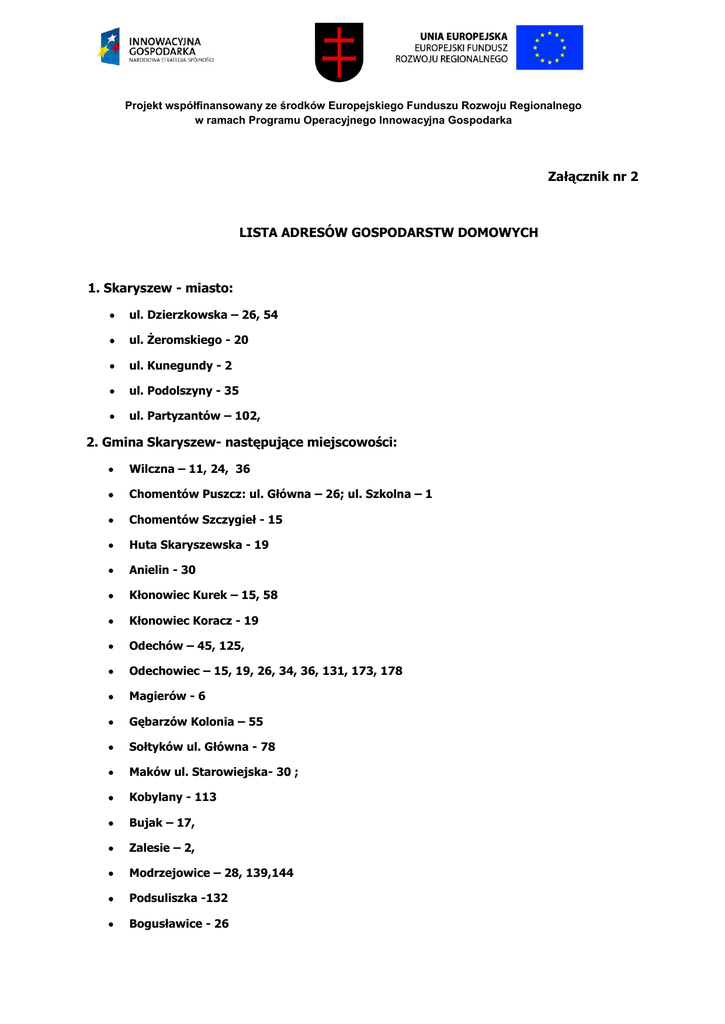 Projekt współfinansowany ze środków Europejskiego Funduszu Rozwoju Regionalnego w ramach Programu Operacyjnego Innowacyjna Gospodarka Załącznik nr 2 LISTA ADRESÓW GOSPODARSTW DOMOWYCH 1. Skaryszew - miasto: ul. Dzierzkowska – 26, 54 ul. Żeromskiego - 20 ul. Kunegundy - 2 ul. Podolszyny - 35 ul. Partyzantów – 102, 2. Gmina Skaryszew- następujące miejscowości: Wilczna – 11, 24, 36 Chomentów Puszcz: ul. Główna – 26; ul. Szkolna – 1 Chomentów Szczygieł - 15 Huta Skaryszewska - 19 Anielin - 30 Kłonowiec Kurek – 15, 58 Kłonowiec Koracz - 19 Odechów – 45, 125, Odechowiec – 15, 19, 26, 34, 36, 131, 173, 178 Magierów - 6 Gębarzów Kolonia – 55 Sołtyków ul. Główna - 78 Maków ul. Starowiejska- 30 ; Kobylany - 113 Bujak – 17, Zalesie – 2, Modrzejowice – 28, 139,144 Podsuliszka -132 Bogusławice - 26 Projekt współfinansowany ze środków Europejskiego Funduszu Rozwoju Regionalnego w ramach Programu Operacyjnego Innowacyjna Gospodarka Załącznik nr 3 LISTA JEDNOSTEK PODLEGLYCH GMINIE SKARYSZEW 1. Publiczne Gimnazjum w Skaryszewie ul. Kochanowskiego 16G 2. Publiczna Szkoła Podstawowa w Skaryszewie ul. Wojska Polskiego 5 3. Publiczna Szkoła Podstawowa w Sołtykowie ul. Mickiewicza 2 4. Publiczna Szkoła Podstawowa w Makowie ul. Szkolna 6 5. Publiczna Szkoła Podstawowa w Chomentowie Puszcz ul. Ogrodowa 1 6. Publiczna Szkoła Podstawowa w Odechowie, Odechów 77 7. + filia z oddziałami integracyjnymi w Wólce Twarogowej, Wólka Twarogowa 21