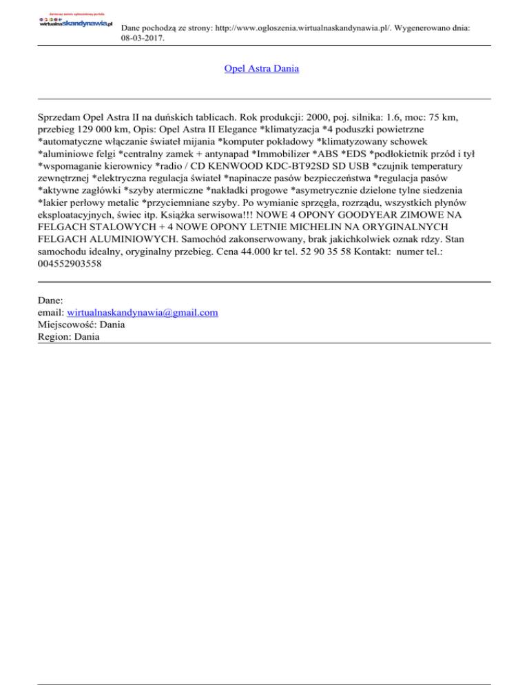 Dane pochodzą ze strony: http://www.ogloszenia.wirtualnaskandynawia.pl/. Wygenerowano dnia: 08-03-2017. Opel Astra Dania Sprzedam Opel Astra II na duńskich tablicach. Rok produkcji: 2000, poj. silnika: 1.6, moc: 75 km, przebieg 129 000 km, Opis: Opel Astra II Elegance *klimatyzacja *4 poduszki powietrzne *automatyczne włączanie świateł mijania *komputer pokładowy *klimatyzowany schowek *aluminiowe felgi *centralny zamek + antynapad *Immobilizer *ABS *EDS *podłokietnik przód i tył *wspomaganie kierownicy *radio / CD KENWOOD KDC-BT92SD SD USB *czujnik temperatury zewnętrznej *elektryczna regulacja świateł *napinacze pasów bezpieczeństwa *regulacja pasów *aktywne zagłówki *szyby atermiczne *nakładki progowe *asymetrycznie dzielone tylne siedzenia *lakier perłowy metalic *przyciemniane szyby. Po wymianie sprzęgła, rozrządu, wszystkich płynów eksploatacyjnych, świec itp. Książka serwisowa!!! NOWE 4 OPONY GOODYEAR ZIMOWE NA FELGACH STALOWYCH + 4 NOWE OPONY LETNIE MICHELIN NA ORYGINALNYCH FELGACH ALUMINIOWYCH. Samochód zakonserwowany, brak jakichkolwiek oznak rdzy. Stan samochodu idealny, oryginalny przebieg. Cena 44.000 kr tel. 52 90 35 58 Kontakt: numer tel.: 004552903558 Dane: email: [email protected] Miejscowość: Dania Region: Dania