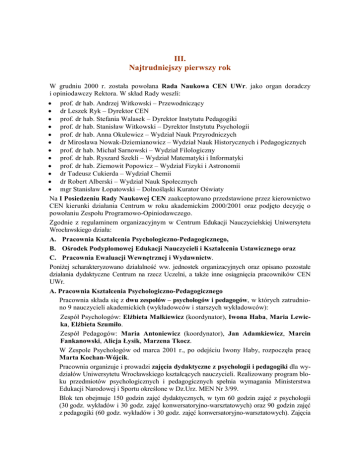 III. Najtrudniejszy pierwszy rok W grudniu 2000 r. została powołana Rada Naukowa CEN UWr. jako organ doradczy i opiniodawczy Rektora. W skład Rady weszli: • prof. dr hab. Andrzej Witkowski – Przewodniczący • dr Leszek Ryk – Dyrektor CEN • prof. dr hab. Stefania Walasek – Dyrektor Instytutu Pedagogiki • prof. dr hab. Stanisław Witkowski – Dyrektor Instytutu Psychologii • prof. dr hab. Anna Okulewicz – Wydział Nauk Przyrodniczych • dr Mirosława Nowak-Dziemianowicz – Wydział Nauk Historycznych i Pedagogicznych • prof. dr hab. Michał Sarnowski – Wydział Filologiczny • prof. dr hab. Ryszard Szekli – Wydział Matematyki i Informatyki • prof. dr hab. Ziemowit Popowicz – Wydział Fizyki i Astronomii • dr Tadeusz Cukierda – Wydział Chemii • dr Robert Alberski – Wydział Nauk Społecznych • mgr Stanisław Łopatowski – Dolnośląski Kurator Oświaty Na I Posiedzeniu Rady Naukowej CEN zaakceptowano przedstawione przez kierownictwo CEN kierunki działania Centrum w roku akademickim 2000/2001 oraz podjęto decyzję o powołaniu Zespołu Programowo-Opiniodawczego. Zgodnie z regulaminem organizacyjnym w Centrum Edukacji Nauczycielskiej Uniwersytetu Wrocławskiego działa: A. Pracownia Kształcenia Psychologiczno-Pedagogicznego, B. Ośrodek Podyplomowej Edukacji Nauczycieli i Kształcenia Ustawicznego oraz C. Pracownia Ewaluacji Wewnętrznej i Wydawnictw. PoniŜej scharakteryzowano działalność ww. jednostek organizacyjnych oraz opisano pozostałe działania dydaktyczne Centrum na rzecz Uczelni, a takŜe inne osiągnięcia pracowników CEN UWr. A. Pracownia Kształcenia Psychologiczno-Pedagogicznego Pracownia składa się z dwu zespołów – psychologów i pedagogów, w których zatrudniono 9 nauczycieli akademickich (wykładowców i starszych wykładowców): Zespół Psychologów: ElŜbieta Małkiewicz (koordynator), Iwona Haba, Maria Lewicka, ElŜbieta Szumiło. Zespół Pedagogów: Maria Antoniewicz (koordynator), Jan Adamkiewicz, Marcin Fankanowski, Alicja Łysik, Marzena Tkocz. W Zespole Psychologów od marca 2001 r., po odejściu Iwony Haby, rozpoczęła pracę Marta Kochan-Wójcik. Pracownia organizuje i prowadzi zajęcia dydaktyczne z psychologii i pedagogiki dla wydziałów Uniwersytetu Wrocławskiego kształcących nauczycieli. Realizowany program bloku przedmiotów psychologicznych i pedagogicznych spełnia wymagania Ministerstwa Edukacji Narodowej i Sportu określone w Dz.Urz. MEN Nr 3/99. Blok ten obejmuje 150 godzin zajęć dydaktycznych, w tym 60 godzin zajęć z psychologii (30 godz. wykładów i 30 godz. zajęć konwersatoryjno-warsztatowych) oraz 90 godzin zajęć z pedagogiki (60 godz. wykładów i 30 godz. zajęć konwersatoryjno-warsztatowych). Zajęcia trwają cały rok akademicki. W semestrze zimowym r. ak. 2000/2001 zostały zakończone wykłady z psychologii, w których wzięło udział 978 studentów z Wydziałów: Nauk Przyrodniczych, Filologicznego, Nauk Historycznych i Pedagogicznych, Fizyki i Astronomii, Matematyki i Informatyki. Natomiast z pedagogiki odbyły się wykłady, które będą kontynuowane w semestrze letnim, oraz konwersatoria. Udział w nich wzięło 967 studentów z Wydziałów: Filologicznego, Nauk Społecznych, Matematyki i Informatyki, Fizyki i Astronomii, Nauk Przyrodniczych, Nauk Historycznych i Pedagogicznych oraz Chemii. Celem zajęć z psychologii było wyposaŜenie studentów w podstawową wiedzę z psychologii oraz w umiejętności praktyczne z tego zakresu uŜyteczne w pracy dydaktyczno-wychowawczej, zaś zajęcia z pedagogiki przygotowywały przyszłego nauczyciela do realizacji zadań zreformowanej szkoły. Program opracowany przez zespoły psychologów i pedagogów zatrudnionych w Centrum był jednolity dla wszystkich studentów, ale przy zachowaniu wspólnych podstaw. Zajęcia konwersatoryjno-warsztatowe były modyfikowane i dostosowywane do zainteresowań studentów. Z początkiem roku akademickiego wszyscy studenci realizujący blok psychologicznopedagogiczny otrzymywali od prowadzących „Ramowy program zajęć”, zaś miesiąc przed ostatnimi zajęciach, kaŜda grupa otrzymała „Wypisy z lektur do wykładów z psychologii” oraz „Wypisy z lektur do wykładów z pedagogiki”. B. Ośrodek Podyplomowej Edukacji Nauczycieli i Kształcenia Ustawicznego zajmował się organizacją studiów podyplomowych, pozwalających nauczycielom uzyskać nowe kwalifikacje zawodowe niezbędne w reformującej się szkole oraz kursów doskonalących warsztat pracy nauczycieli. W semestrze zimowym kontynuowano rozpoczęte w marcu 2000r. dwa studia podyplomowe grantowe: − „Nauczyciel fizyki w gimnazjum” - 81 słuchaczy oraz − „Nauczyciel chemii w gimnazjum” - 79 słuchaczy, które kończą się w marcu 2001 r. W r. ak. 2000/2001 Ministerstwo Edukacji Narodowej przyznało Centrum Edukacji Nauczycielskiej fundusze na realizację 7 grantów edukacyjnych: 1. Kompetencje Wychowawcze i Dydaktyczne Nauczycieli Gimnazjum 2. Nauczyciel Przyrody - grupa wiejska 3. Nauczyciel Przyrody - grupa miejska 4. Nauczyciel Przedsiębiorczości w szkołach ponadgimnazjalnych 5. Nauczyciel-doradca metodyczny przedmiotów przyrodniczych w gimnazjum 6. Nauczyciel-doradca metodyczny historii i WOS w gimnazjum 7. Chemia z elementami informatyki w liceum C. Pracownia Ewaluacji Wewnętrznej i Wydawnictw Pracownia Ewaluacji Wewnętrznej i Wydawnictw przygotowała arkusze ewaluacyjne zajęć z psychologii i pedagogiki, które zostały rozdane studentom na ostatnich zajęciach. Ewaluacji (semestralnej) poddano program kształcenia oraz realizację procesu dydaktycznego. Pracownia Ewaluacji Wewnętrznej i Wydawnictw przeprowadziła dokładną analizę wyników ewaluacji. Pracownia przygotowała równieŜ do druku dwa zeszyty „Edukacja przyrodnicza w szkole podstawowej”, ogólnopolskiego kwartalnika metodycznego poświęconego edukacji przyrodniczej. Redakcja kwartalnika została decyzją MEN ulokowana w Centrum 