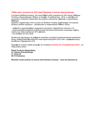 TRWA nabór wniosków do XXX edycji Śląskiego Funduszu Stypendialnego Z przyjemnością informujemy, że rozpoczął się nabór wniosków do XXX edycji Śląskiego Funduszu Stypendialnego. Będzie on trwał do 10 października 2015, a zakończy się uroczystym rozdaniem stypendiów dla wybitnie uzdolnionej młodzieży z województwa śląskiego. Zgodnie z regulaminem ŚFS o pomoc ze środków Fundacji mogą ubiegać się wszyscy studenci studiów wyższych – zameldowani w województwie śląskim, którzy: - osiągnęli w poprzedzającym stypendium semestrze, średnią ocen minimum 4,5; - udokumentują szczególnie trudną sytuację ekonomiczną (dochód na jednego członka rodziny nie może przekroczyć 870 zł brutto); - nie ukończyli 24 roku życia. Serdecznie zapraszamy do składania wniosków wszystkich zainteresowanych studentów, którzy mają już zakończoną letnią sesję egzaminacyjną w 2015 roku i spełniają wymogi określone w Regulaminie ŚFS. Wypełnione wnioski należy przesyłać do Fundacji w terminie do 10 października 2015 r. na niżej podany adres: Śląski Fundusz Stypendialny im. Adama Graczyńskiego ul. Cicha 20 40-116 Katowice Wniosek można pobrać ze strony internetowej Funduszu : www.sfs.katowice.pl