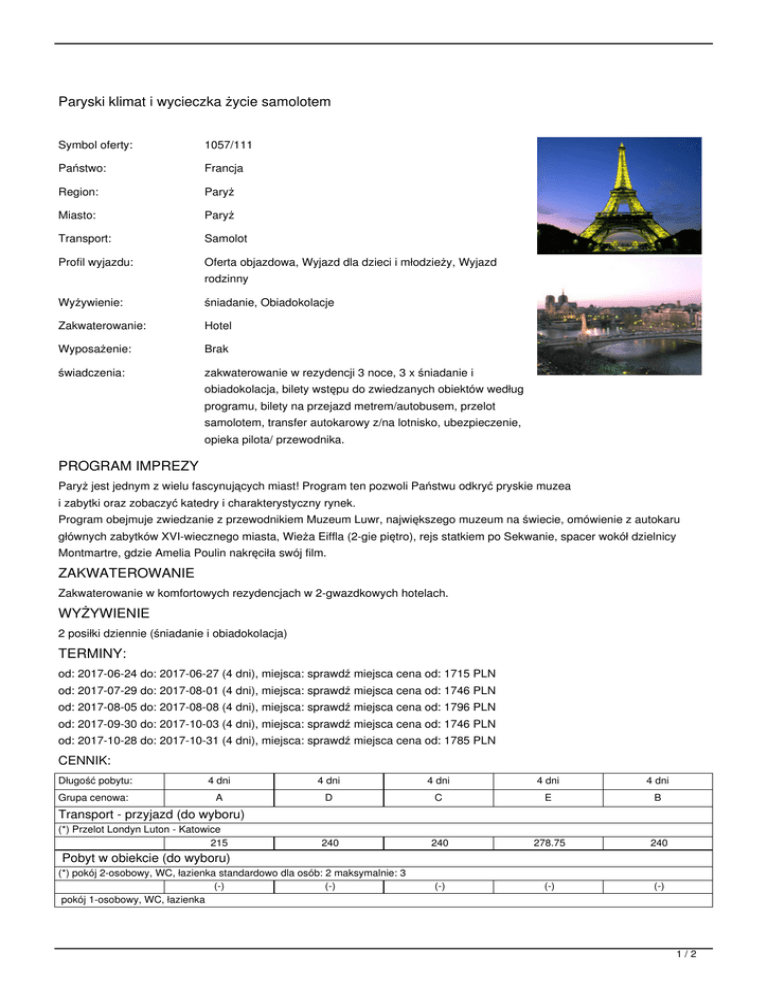 Paryski klimat i wycieczka życie samolotem Symbol oferty: 1057/111 Państwo: Francja Region: Paryż Miasto: Paryż Transport: Samolot Profil wyjazdu: Oferta objazdowa, Wyjazd dla dzieci i młodzieży, Wyjazd Wyżywienie: śniadanie, Obiadokolacje Zakwaterowanie: Hotel Wyposażenie: Brak świadczenia: zakwaterowanie w rezydencji 3 noce, 3 x śniadanie i rodzinny obiadokolacja, bilety wstępu do zwiedzanych obiektów według programu, bilety na przejazd metrem/autobusem, przelot samolotem, transfer autokarowy z/na lotnisko, ubezpieczenie, opieka pilota/ przewodnika. PROGRAM IMPREZY Paryż jest jednym z wielu fascynujących miast! Program ten pozwoli Państwu odkryć pryskie muzea i zabytki oraz zobaczyć katedry i charakterystyczny rynek. Program obejmuje zwiedzanie z przewodnikiem Muzeum Luwr, największego muzeum na świecie, omówienie z autokaru głównych zabytków XVI-wiecznego miasta, Wieża Eiffla (2-gie piętro), rejs statkiem po Sekwanie, spacer wokół dzielnicy Montmartre, gdzie Amelia Poulin nakręciła swój film. ZAKWATEROWANIE Zakwaterowanie w komfortowych rezydencjach w 2-gwazdkowych hotelach. WYŻYWIENIE 2 posiłki dziennie (śniadanie i obiadokolacja) TERMINY: od: 2017-06-24 do: 2017-06-27 (4 dni), miejsca: sprawdź miejsca cena od: 1715 PLN od: 2017-07-29 do: 2017-08-01 (4 dni), miejsca: sprawdź miejsca cena od: 1746 PLN od: 2017-08-05 do: 2017-08-08 (4 dni), miejsca: sprawdź miejsca cena od: 1796 PLN od: 2017-09-30 do: 2017-10-03 (4 dni), miejsca: sprawdź miejsca cena od: 1746 PLN od: 2017-10-28 do: 2017-10-31 (4 dni), miejsca: sprawdź miejsca cena od: 1785 PLN CENNIK: Długość pobytu: 4 dni 4 dni 4 dni 4 dni 4 dni Grupa cenowa: A D C E B 240 240 278.75 240 (-) (-) (-) Transport - przyjazd (do wyboru) (*) Przelot Londyn Luton - Katowice 215 Pobyt w obiekcie (do wyboru) (*) pokój 2-osobowy, WC, łazienka standardowo dla osób: 2 maksymalnie: 3 (-) (-) pokój 1-osobowy, WC, łazienka 1/2 208.38 208.38 208.38 208.38 208.38 1217.72 1217.72 1217.72 1217.72 1217.72 10 10 10 10 10 2.4 % 2.4 % 2.4 % 2.4 % 278.75 328.75 278.75 278.75 Rodzaj osoby (do wyboru) (*) uczestnik Ubezpieczenie (do wyboru) (*) ubezpieczenie NW KL Ubezpieczenie (opcjonalne) ubezpieczenie - od kosztów rezygnacji 2.4 % Transport - wyjazd (do wyboru) (*) PAR-KTW 272.5 Waluta: PLN Aktualne ceny z systemu S.A.R.T. (-) - cena usługi, podatku kalkulowana przy osobie lub gratis (*) - kwota wliczona w cenę standardową 2/2