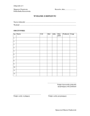 Zał cznik nr 4 Magazyn Chemiczny Politechnika Rzeszowska Rzeszów, dnia........................... WYDANIE Z DEPOZYTU Nazwa Jednostki: ......................................................................................................................... Wydział: ....................................................................................................................................... ODCZYNNIKI: Lp. Nazwa CAS Ilo Jedn. Data prod. Producent Uwagi 1. 2. 3. 4. 5. 6. 7. 8. 9. 10. 11. 12 ..................................................................... Podpis kierownika jednostki dysponuj cej odczynnikami .................................................................. Podpis osoby wydaj cej ................................................................... Podpis osoby przyjmuj cej Opracował Marcin Chutkowski