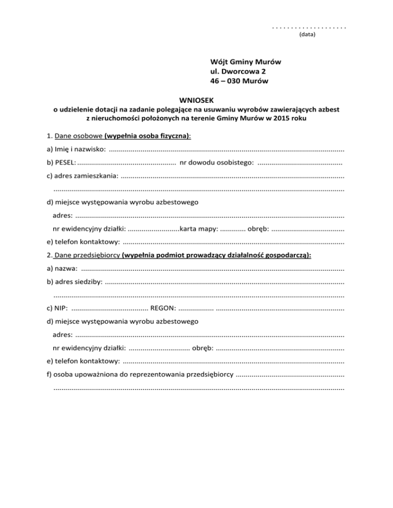 .................... (data) Wójt Gminy Murów ul. Dworcowa 2 46 – 030 Murów WNIOSEK o udzielenie dotacji na zadanie polegające na usuwaniu wyrobów zawierających azbest z nieruchomości położonych na terenie Gminy Murów w 2015 roku 1. Dane osobowe (wypełnia osoba fizyczna): a) Imię i nazwisko: ....................................................................................................................... b) PESEL: .................................................. nr dowodu osobistego: ........................................... c) adres zamieszkania: ................................................................................................................. ................................................................................................................................................... d) miejsce występowania wyrobu azbestowego adres: ........................................................................................................................................ nr ewidencyjny działki: ..........................karta mapy: ............. obręb: ..................................... e) telefon kontaktowy: ................................................................................................................ 2. Dane przedsiębiorcy (wypełnia podmiot prowadzący działalność gospodarczą): a) nazwa: ..................................................................................................................................... b) adres siedziby: ......................................................................................................................... ................................................................................................................................................... c) NIP: ....................................... REGON: .................. ................................................................. d) miejsce występowania wyrobu azbestowego adres: ........................................................................................................................................ nr ewidencyjny działki: ............................... obręb: ................................................................. e) telefon kontaktowy: ................................................................................................................ f) osoba upoważniona do reprezentowania przedsiębiorcy ....................................................... ................................................................................................................................................... 3. Informacje o wyrobach zawierających azbest Rodzaj wyrobów azbestowych (podkreślić właściwe): - płyty azbestowo – cementowe faliste (eternit), - płyty azbestowo cementowe płaskie. Lokalizacja wyrobów azbestowych na terenie nieruchomości (podkreślić właściwe): dach – elewacja – złożone na stosie . Rodzaj budynku, na którym znajdują się wyroby azbestowe (podkreślić właściwe): - budynek gospodarczy (np.: garaż, obora), - budynek mieszkalny, - budynek przemysłowy, - budynek mieszkalno – gospodarczy, - Inny....................................................................................................................................... Łączna powierzchnia płyt w m2 : ........................................................................................... 4. Zakres prac objętych wnioskiem (podkreślić właściwe): a) demontaż, zbieranie, transport i unieszkodliwianie wyrobów zawierających azbest, (płyty azbestowe znajdują się na budynku) b) zbieranie, transport i unieszkodliwianie wyrobów zawierających azbest (płyty azbestowe leżą na terenie posesji) Wyrażam zgodę na przetwarzanie moich danych osobowych na podstawie ustawy z dnia 29 sierpnia 1997 r. o ochronie danych osobowych (Dz. U. z 2002 r. Nr 101, poz. 926 ze zmianami) w zakresie realizacji niniejszego wniosku ....................................................... Data i czytelny podpis Załączniki: 1. 2. 3. Oświadczenie, wg załącznika nr 1. Ocena stanu wyrobu wg załącznika nr 2. Dokument potwierdzający tytuł prawny do obiektu (np.: odpis księgi wieczystej lub kserokopia aktu notarialnego). W przypadku nieruchomości, do której tytuł prawny posiada kilka osób, należy dołączyć zgody pozostałych współwłaścicieli na realizację zadania. Jeżeli płyty azbestowe znajdują się na budynku to dodatkowo: 4. 5. Mapa geodezyjna działki w skali 1:500 (lub 1:1000 jeżeli są widoczne obiekty budowlane) z zaznaczonym obiektem zawierającym azbest.. Oświadczenie, wg załącznika nr 3. Załącznik Nr 1 do wniosku o udzielenie dotacji na zadanie „Unieszkodliwienie wyrobów zawierających azbest z terenu Gminy Murów – VI nabór” Dane osobowe (wypełnia osoba fizyczna): a) Imię i nazwisko: ....................................................................................................................... b) adres zamieszkania: ................................................................................................................ ................................................................................................................................................... Dane przedsiębiorcy (wypełnia podmiot prowadzący działalność gospodarczą): a) nazwa: ..................................................................................................................................... b) adres siedziby: ......................................................................................................................... ................................................................................................................................................... c) NIP: ....................................... REGON: .................. ................................................................. d) osoba upoważniona do repr
