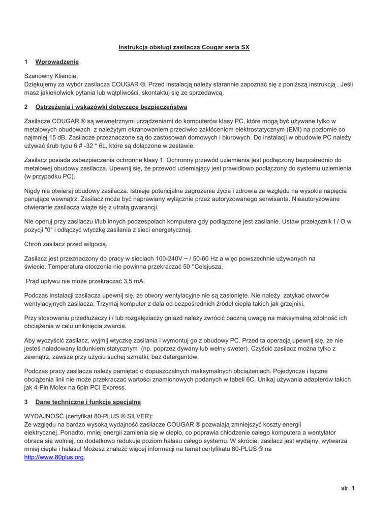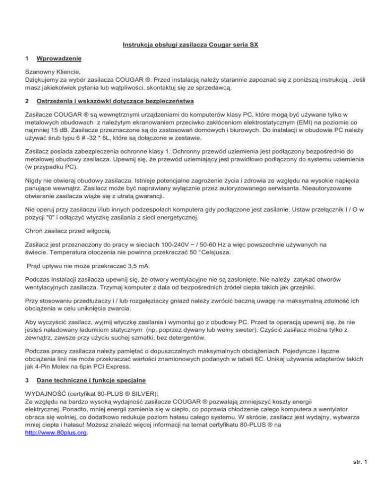 Instrukcja obsługi zasilacza Cougar seria SX 1 Wprowadzenie Szanowny Kliencie, Dziękujemy za wybór zasilacza COUGAR ®. Przed instalacją naleŜy starannie zapoznać się z poniŜszą instrukcją . Jeśli masz jakiekolwiek pytania lub wątpliwości, skontaktuj się ze sprzedawcą. 2 OstrzeŜenia i wskazówki dotyczące bezpieczeństwa Zasilacze COUGAR ® są wewnętrznymi urządzeniami do komputerów klasy PC, które mogą być uŜywane tylko w metalowych obudowach z naleŜytym ekranowaniem przeciwko zakłóceniom elektrostatycznym (EMI) na poziomie co najmniej 15 dB. Zasilacze przeznaczone są do zastosowań domowych i biurowych. Do instalacji w obudowie PC naleŜy uŜywać śrub typu 6 # -32 * 6L, które są dołączone w zestawie. Zasilacz posiada zabezpieczenia ochronne klasy 1. Ochronny przewód uziemienia jest podłączony bezpośrednio do metalowej obudowy zasilacza. Upewnij się, Ŝe przewód uziemiający jest prawidłowo podłączony do systemu uziemienia (w przypadku PC). Nigdy nie otwieraj obudowy zasilacza. Istnieje potencjalne zagroŜenie Ŝycia i zdrowia ze względu na wysokie napięcia panujące wewnątrz. Zasilacz moŜe być naprawiany wyłącznie przez autoryzowanego serwisanta. Nieautoryzowane otwieranie zasilacza wiąŜe się z utratą gwarancji. Nie operuj przy zasilaczu i/lub innych podzespołach komputera gdy podłączone jest zasilanie. Ustaw przełącznik I / O w pozycji "0" i odłączyć wtyczkę zasilania z sieci energetycznej. Chroń zasilacz przed wilgocią. Zasilacz jest przeznaczony do pracy w sieciach 100-240V ~ / 50-60 Hz a więc powszechnie uŜywanych na świecie. Temperatura otoczenia nie powinna przekraczać 50 ° Celsjusza. Prąd upływu nie moŜe przekraczać 3,5 mA. Podczas instalacji zasilacza upewnij się, Ŝe otwory wentylacyjne nie są zasłonięte. Nie naleŜy zatykać otworów wentylacyjnych zasilacza. Trzymaj komputer z dala od bezpośrednich źródeł ciepła takich jak grzejniki. Przy stosowaniu przedłuŜaczy i / lub rozgałęziaczy gniazd naleŜy zwrócić baczną uwagę na maksymalną zdolność ich obciąŜenia w celu uniknięcia zwarcia. Aby wyczyścić zasilacz, wyjmij wtyczkę zasilania i wymontuj go z obudowy PC. Przed ta operacją upewnij się, Ŝe nie jesteś naładowany ładunkiem statycznym (np. poprzez dywany lub wełny sweter). Czyścić zasilacz moŜna tylko z zewnątrz, zawsze przy uŜyciu suchej szmatki, bez detergentów. Podczas pracy zasilacza naleŜy pamiętać o dopuszczalnych maksymalnych obciąŜeniach. Pojedyncze i łączne obciąŜenia linii nie moŜe przekraczać wartości znamionowych podanych w tabeli 6C. Unikaj uŜywania adapterów takich jak 4-Pin Molex na 6pin PCI Express. 3 Dane techniczne i funkcje specjalne WYDAJNOŚĆ (certyfikat 80-PLUS ® SILVER): Ze względu na bardzo wysoką wydajność zasilacze COUGAR ® pozwalają zmniejszyć koszty energii elektrycznej. Ponadto, mniej energii zamienia się w ciepło, co poprawia chłodzenie całego komputera a wentylator obraca się wolniej, co dodatkowo redukuje poziom hałasu całego systemu. W skrócie, zasilacz jest wydajny, wytwarza mniej ciepła i hałasu! MoŜesz znaleźć więcej informacji na temat certyfikatu 80-PLUS ® na http://www.80plus.org. str. 1 Modularne okablowanie: Przewody dla dysków i / lub kart graficznych zawsze jeden strony zakończone 8-pinowym wtykiem, podłączanym bezpośrednio do zasilacza. Upewnij się, Ŝe wtyk który wpinasz pasuje kolorem do gniazda: czerwony z czerwonym, czarny z czarnym. Drugi koniec kabla zakończony jest wtykami do odpowiednich komponentów. Aby uzyskać więcej informacji na temat prawidłowej instalacji poszczególnych podzespołów, przeczytaj instrukcje obsługi dostarczone przez ich producentów. Zgodny z najnowszą, europejską dyrektywą 2005/32/WE (PWE) dotyczącą produktów elektrycznych oraz nowym standardem ENERGY STAR ®: ZuŜycie energii w trybie gotowości poniŜej 0,3 W. Zasilacze COUGAR ® obsługują najnowsze standardy Energy Star. Tak więc mogą być wykorzystywane przy budowie systemów kompatybilnych z Energy Star ®. Wentylator 140mm z łoŜyskiem HDB DuŜy, 140mm wentylator z łoŜyskiem wykonanym w technologii HDB (HYDRO-Dynamic Bearing) dostosowuje prędkości obrotową do temperatury zasilacza. Jednak nawet na najwyŜszym poziomie obrotów, wentylator pracuje na tyle spokojnie by być ledwo słyszalnym. Wentylatory HDB cechuje znacznie wydłuŜony cykl Ŝycia. 4 Instalacja / akcesoria Zanim zaczniesz instalację, przeczytaj sekcję "OstrzeŜenia i uwagi dotyczące bezpieczeństwa." Przy montaŜu naleŜy korzystać tylko z dostarczonych śrub, poniewaŜ posiadają one odpowiedni gwint. Do przeprowadzenia montaŜu będziesz potrzebny śrubokręt. Zawartość zestawu: - Śruby do montaŜu zasilacza - Naklejka Cougar - Przewód zasilający (Prosimy uŜywać tylko dołączonego przewodu zasilającego, niskiej jakości kabel moŜe spowodować uszkodzenie zasilacza i reszty systemu.) - Instrukcja z informacją na temat gwarancji. - Zestaw kabli modularnych - Zestaw z wysokiej jakości opasek do kabli Instalacja zasilacza COUGAR ®: - Umieścić zasilacz w przeznaczonym do tego miejscu w obudowie PC i zamocować go za pomocą dostarczonych śrub. - Najpierw podłącz wtyki zasilania płyty głównej (20/24 pin, 4 pin i 8 pin jeśli wymagane - zgodnie z układ płyty głównej) do odpowiednich gniazd. - Podłącz dyski twarde, napędy optyczne i jeśli zachodzi taka potrzeba karty graficzne do zasilacza. - Zamknij obudowę PC i upewnij się, Ŝe przycisk włączający zasilacz jest ustawiony na pozycji "0". - Podłączyć zasilacz do sieci elektrycznej przy uŜyciu dołączonego w zestawie kabla zasilającego. Prosimy uŜywać tylko dołączonego przewodu zasilającego, niskiej jakości kabel moŜe spowodować uszkodzenie zasilacza i reszty systemu. - Włączyć zasilacz i uruchom komputer. 5 Funkcje bezpieczeństwa - UVP (Zabezpieczenie podnapięciowe) - Jeśli napięcia spadnie poniŜej 