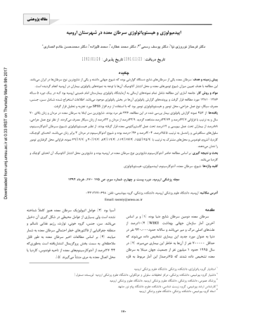 * Downloaded from umj.umsu.ac.ir at 0:33 IRST on Thursday March 9th 2017 1392/01/28 : 1391/11/23 : . : . : . . SPSS . : . / . / / . . / (% / ) (% / ) (% / ) (% / ) / / (% / ) . : . : : : Email: [email protected] .( ) ( ) / . (WHO) .( ) .( ) .( ) ( ) . , . (% ) .( ) ( ) / Downloaded from umj.umsu.ac.ir at 0:33 IRST on Thursday March 9th 2017 . . ( ) (% / (% / . (% / ) (% / ) . . / (% (% ) - . . . (% / ) . (% / (% / ) . . . SPSS (% / ) (% / ) (% / ) (% / ) (% / ) (% . (% ) . / .( ) 180 155 160 140 120 100 80 60 40 114 84 40 39 20 0 :( ) / ... :( ) Downloaded from umj.umsu.ac.ir at 0:33 IRST on Thursday March 9th 2017 ) ) ) ( / %) ( / %) < ( / %) ( / %) - ( / %) ( / %) - ( / %) ( - / %) ( / %) ( / %) ( %) ( %) > / .( ) (% ) ( ) ( ) .( ) ( ) ( ) ( ) . / (% / ) . .( ) (% / ) . .( ) / . . .( ) / .( ) .( ) / . . . . . ( ) . . ) Downloaded from umj.umsu.ac.ir at 0:33 IRST on Thursday March 9th 2017 . References: 1. 2005, differences by autonomous region and Fuchs CS, Mayer RJ. Gastric carcinoma. N Engl J Med 1995;333(1): 32-41. 2. 3. 9. 5. Cassetti T, Romagnoli C, et al. Cancer cancer statistics, 2002. CA Cancer J Clin mortality trends in the Umbria region of Italy 2005;55(2): 74-108. 1978-2004: a joinpoint regression analysis. Wong BC, Ching CK, Lam SK. Helicobacter BMC Cancer 2007;7: 10. Kim SW, et al. Changing prevalence of upper Stewart BW, Kleihues P. International Agency gastrointestinal disease in 28 893 Koreans from for Research on Cancer. World cancer report. 1995 to 2005. Eur J Gastroenterol Hepatol Lyon: IARC Press; 2003. 2009 Jul;21(7): 787-93. Walther C, Zilling T, Perfekt R, Moller T. 11. Abdirad A, Ghaderi-Sohi S, Shuyama K, Increasing prevalence of adenocarcinoma of Koriyama C, Nadimi-Barforoosh H, Emami S, the gastro-oesophageal et al. Epstein-Barr virus associated gastric junction: a study of the Swedish population carcinoma: a report from Iran in the last four between decades. Diagn Pathol 2007;2: 25. oesophagus 1970 and and 1997. Eur J Surg Matos E, Parkin DM. Cancer incidence and Z. Gastric cancer in Iran: epidemiology and mortality risk factors. Arch Iran Med 2009;12(6): 576- 2003;39(17): 2507-20. in Portugal. Eur J Cancer 13. Rahimi F, Heidari M. Time Trend Analysis of DavoodAbadi AH, Sharifi H, Erfan N, Dianati Stomach Cancer Incidence in the West of Iran. M, AbdolRahim Kashi E. An epidemiologic J Health Dev 2012;1(2): 100-11. and clinical survey on gastric cancer patients 8. 12. Pinheiro PS, Tyczynski JE, Bray F, Amado J, Malekzadeh R, Derakhshan MH, Malekzadeh 83. 7. 10. Kim JI, Kim SG, Kim N, Kim JG, Shin SJ, Med J 1999;5(2): 175-9. 2001;167(10): 748-57. 6. Stracci F, Canosa A, Minelli L, Petrinelli AM, Parkin DM, Bray F, Ferlay J, Pisani P. Global pylori infection and gastric cancer. Hong Kong 4. sex. BMC Cancer 2009;9: 346. 14. Hashemi SM, Hagh-Azali M, Bagheri M, refferd to Shahid Beheshti Hospital of Kashan Kabir (1994-2001). Razi J Med Sci 2004;10(34): Correlation of Primary Gastric Cancers. Razi J 319-26. Med Sci 2005;11(40): 319-26. Garcia-Esquinas E, Perez-Gomez B, Pollan M, 15. Kelley A. Histopathologic JR, Duggan Anatomic JM. Gastric cancer Boldo E, Fernandez-Navarro P, Lope V, et al. epidemiology Gastric cancer mortality trends in Spain, 1976- Epidemiol 2003;56(1): 1-9. and and risk factors. J Clin ... 16. Sadighi S, Raafat J, Mohagheghi M, Meemary F. Gastric carcinoma: 5 year experience of a single institute. Asian Pac J Cancer Prev. Downloaded from umj.umsu.ac.ir at 0:33 IRST on Thursday March 9th 2017 2005;6(2): 195-6. in Iran: a sub site analysis of 761 cases. World J Gastroenterol 2007;13(40): 5367-70. 18. 1Derakhshan MH, Liptrot S, Paul J, Brown IL, Morrison D, McColl KE. Oesophageal and 17. Taghavi N, Nasrollahzadeh D, Merat S, gastric intestinal-type adenocarcinomas show Yazdanbod A, Hormazdi M, Sotoudeh M, et al. the same male predominance due to a 17 year Epidemiology of upper gastrointestinal cancers delayed development 2009;58(1): 16-23. in females. Gut EPIDEMIOLOGY AND HISTOPATHOLOGY OF GASTRIC CANCER IN URMIA Farahnaz Nourozinia1, Yousef Rasmi2*, Mohammad Otarod3, Mohammad Golizadeh4, MohammadHassan Khadem-Ansari5 Downloaded from umj.umsu.ac.ir at 0:33 IRST on Thursday March 9th 2017 Received: 10 Feb, 2013; Accepted: 25 March, 2013 Abstract Background & Aims: Gastric cancer is one of the common gastrointestinal cancers with global incidence and one of the most common cancers in the northwestern of Iran. This study aimed to determine the prevalence of gastric tumors and their anatomical location using the pathologic specimens of patients have been conducted in Urmia. Materials & Methods: The study population comprised all samples sent to Pathology Laboratory of Imam Khomeini Hospital, Urmia; in a 5- years period during 2002-2007 were studied, and their documents are available. Information extracted included: age, sex, smoking habit, type of surgery, tumor location and histopathology of tumor type. data were analyzed by using SPSS software. Results: Of 452 patient samples in this study, 336 were men. The most common age of stomach cancer observed in both men and women over 70 years with prevalence 42.7% and 34.74%, respectively. 33.9% of men and 23.0% of women were smoker. Regarding to type of surgery, 88.0% of patients undergoing biopsy and 12.0% gasrtoctomy. Histophatologically, incidence of adenocarcinoma, squamous cell carcinoma and Round cell was 95.5%, 4.04% and 0.46%, respectively. Incidences of adenocarcinoma in men were three-fold greater than women. Lasser sace, cardia, antrum, fondus and other overlapped locations showed tumor involved (with number of samples prevalence of) 155(35.9%), 114 (26.4%), 84(19.4%), 40(9.3%) and 39 (9.1%), respectively. Conclusion: According to this study, adenocarcinoma is most common cancer in Urmia. Most common anatomical distributions locations are Lasser sace and Cardia. Keywords: prevalence, gastric cancer, adenocarcinoma, epidemiology and histopathology, Address: Department of Biochemistry, Faculty of 