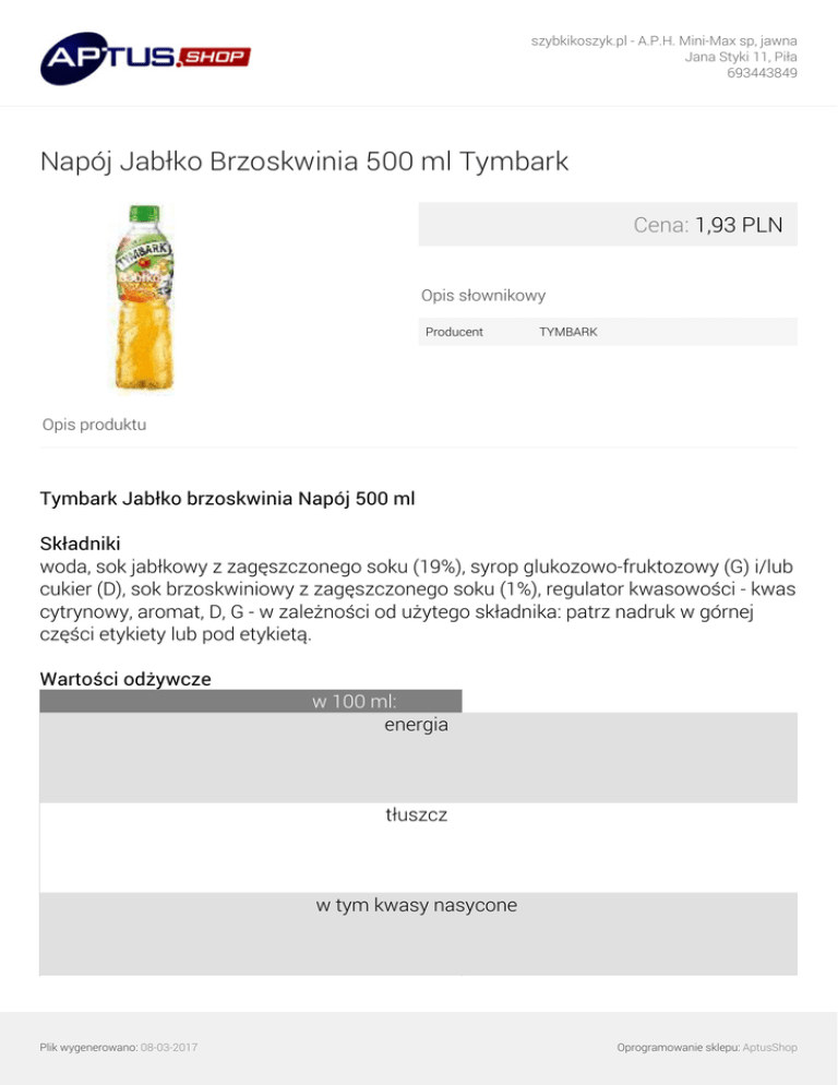 szybkikoszyk.pl - A.P.H. Mini-Max sp, jawna Jana Styki 11, Piła 693443849 Napój Jabłko Brzoskwinia 500 ml Tymbark Cena: 1,93 PLN Opis słownikowy Producent TYMBARK Opis produktu Tymbark Jabłko brzoskwinia Napój 500 ml Składniki woda, sok jabłkowy z zagęszczonego soku (19%), syrop glukozowo-fruktozowy (G) i/lub cukier (D), sok brzoskwiniowy z zagęszczonego soku (1%), regulator kwasowości - kwas cytrynowy, aromat, D, G - w zależności od użytego składnika: patrz nadruk w górnej części etykiety lub pod etykietą. Wartości odżywcze w 100 ml: energia tłuszcz w tym kwasy nasycone Plik wygenerowano: 08-03-2017 Oprogramowanie sklepu: AptusShop szybkikoszyk.pl - A.P.H. Mini-Max sp, jawna Jana Styki 11, Piła 693443849 węglowodany w tym cukry białko sól Nazwa produktu uregulowana prawnie Napój owocowy. Wyprodukowany z soków zagęszczonych. Niegazowany, pasteryzowany. Marka Tymbark Cechy bez konserwantów i sztucznych słodzików Marka standaryzowana Marka: Tymbark Adres firmy ul. Strefowa 13 43-100 Tychy Opis produktu W Tymbarku łączenie soczystych smaków to pestka. Unikalne połączenia i orzeźwiający klimat, to nasza specjalność. I właśnie dlatego jabłko-brzoskwinia zmiesza każdego, kto szuka nietypowych wrażeń. Wyrazisty smak owoców połączony z krystaliczną wodą orzeźwi każdego! Plik wygenerowano: 08-03-2017 Oprogramowanie sklepu: AptusShop szybkikoszyk.pl - A.P.H. Mini-Max sp, jawna Jana Styki 11, Piła 693443849 O marce Tymbark jest obecny na polskim rynku od 1936 r. Za nami już blisko 80 lat tradycji bezkonkurencyjnego smaku i najwyższej jakości. Obecnie Tymbark to zdecydowany lider rynkowy w kategorii soków, nektarów i napojów w Polsce, którego produkty trafiają do prawie 30 krajów na całym świecie. Jest marką, którą polscy konsumenci darzą wyjątkowym zaufaniem i najchętniej polecają swoim bliskim. Dodatkowe informacje Bądź sobą! Od 80 lat w Tymbarku owoce pozostają sobą - jabłko ma zawsze świeże podejście, a brzoskwinia zachwyca dojrzałością. Company Name MWS Sp. z o.o. Sp. k. Dodatki Słodziki sztuczne: Nie zawiera konserwanty: Nie zawiera Przechowywanie Chronić przed światłem. Po otwarciu przechowywać w lodówce nie dłużej niż 48 godz. Rodzaj przechowywania Typ: Przechowywać w temperaturze otoczenia Rozmiar opakowania 500 Jednostka (tekst opisowy) ml Recykling - pozostały tekst wyrzucaj bez etykiety Średnia miara Średnia miara (e) Jednostka (specyficzna) Jednostka (specyficzna): Mililitrów Plik wygenerowano: 08-03-2017 Oprogramowanie sklepu: AptusShop szybkikoszyk.pl - A.P.H. Mini-Max sp, jawna Jana Styki 11, Piła 693443849 Rodzaj opakowania Typ: Butelka plastikowa Wymiar liczbowy Wymiar liczbowy: 500 Wymiar Wymagana wysokość na półce: 220 Wymagana szerokość na półce: 65 Wymagana głębokość na półce: 65 Waga Waga brutto: 537 Sprzedaż jednostkowa Wysokość: 220 Szerokość: 65 Głębokość: 65 Opakowanie logistyczne GTIN: 05900334126061 Adres zwrotny MWS Sp. z o.o. Sp. k. ul. Strefowa 13 43-100 Tychy Adres dystrybutora MWS Sp. z o.o. Sp. k. ul. Strefowa 13 43-100 Tychy Języki na opakowaniu polski Język produktu Główny język opisu: polski Język danych: polski Podzielony opis produktu Nazwa funkcjonalna: Napój Plik wygenerowano: 08-03-2017 Oprogramowanie sklepu: AptusShop szybkikoszyk.pl - A.P.H. Mini-Max sp, jawna Jana Styki 11, Piła 693443849 Wariant: Jabłko brzoskwinia Plik wygenerowano: 08-03-2017 Powered by TCPDF (www.tcpdf.org) Oprogramowanie sklepu: AptusShop