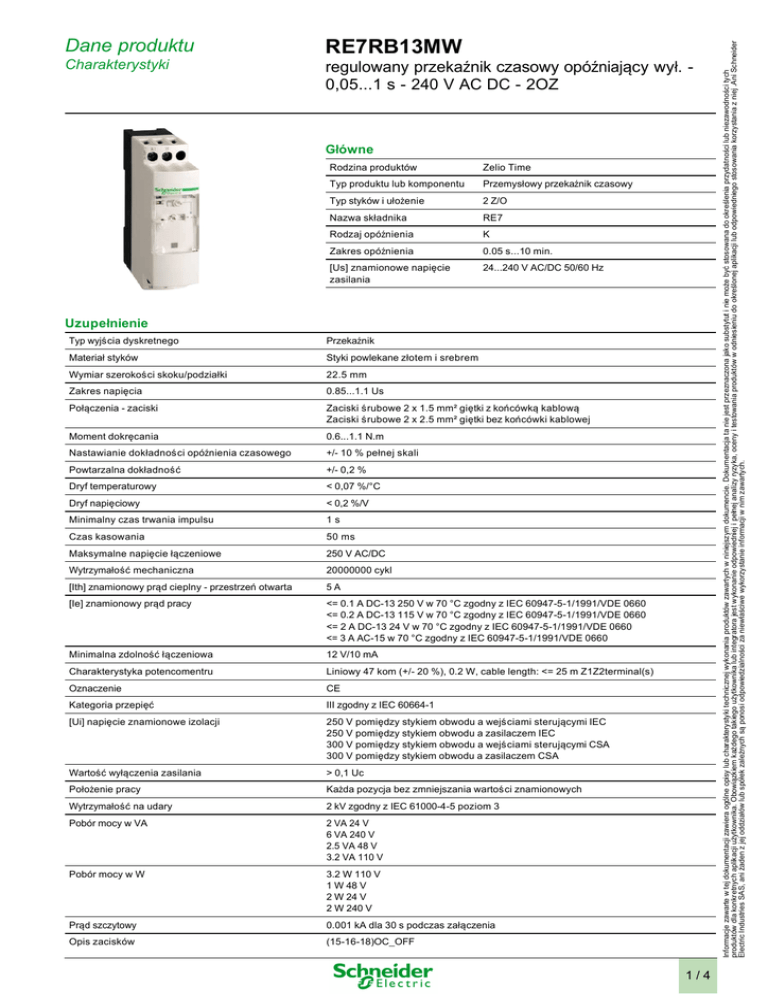 RE7RB13MW Charakterystyki regulowany przekaźnik czasowy opóźniający wył. 0,05...1 s - 240 V AC DC - 2OZ Główne Rodzina produktów Zelio Time Typ produktu lub komponentu Przemysłowy przekaźnik czasowy Typ styków i ułożenie 2 Z/O Nazwa składnika RE7 Rodzaj opóźnienia K Zakres opóźnienia 0.05 s...10 min. [Us] znamionowe napięcie zasilania 24...240 V AC/DC 50/60 Hz Uzupełnienie Typ wyjścia dyskretnego Przekaźnik Materiał styków Styki powlekane złotem i srebrem Wymiar szerokości skoku/podziałki 22.5 mm Zakres napięcia 0.85...1.1 Us Połączenia - zaciski Zaciski śrubowe 2 x 1.5 mm² giętki z końcówką kablową Zaciski śrubowe 2 x 2.5 mm² giętki bez końcówki kablowej Moment dokręcania 0.6...1.1 N.m Nastawianie dokładności opóźnienia czasowego +/- 10 % pełnej skali Powtarzalna dokładność +/- 0,2 % Dryf temperaturowy < 0,07 %/°C Dryf napięciowy < 0,2 %/V Minimalny czas trwania impulsu 1s Czas kasowania 50 ms Maksymalne napięcie łączeniowe 250 V AC/DC Wytrzymałość mechaniczna 20000000 cykl [Ith] znamionowy prąd cieplny - przestrzeń otwarta 5A [Ie] znamionowy prąd pracy <= 0.1 A DC-13 250 V w 70 °C zgodny z IEC 60947-5-1/1991/VDE 0660 <= 0.2 A DC-13 115 V w 70 °C zgodny z IEC 60947-5-1/1991/VDE 0660 <= 2 A DC-13 24 V w 70 °C zgodny z IEC 60947-5-1/1991/VDE 0660 <= 3 A AC-15 w 70 °C zgodny z IEC 60947-5-1/1991/VDE 0660 Minimalna zdolność łączeniowa 12 V/10 mA Charakterystyka potencomentru Liniowy 47 kom (+/- 20 %), 0.2 W, cable length: <= 25 m Z1Z2terminal(s) Oznaczenie CE Kategoria przepięć III zgodny z IEC 60664-1 [Ui] napięcie znamionowe izolacji 250 V pomiędzy stykiem obwodu a wejściami sterującymi IEC 250 V pomiędzy stykiem obwodu a zasilaczem IEC 300 V pomiędzy stykiem obwodu a wejściami sterującymi CSA 300 V pomiędzy stykiem obwodu a zasilaczem CSA Wartość wyłączenia zasilania > 0,1 Uc Położenie pracy Każda pozycja bez zmniejszania wartości znamionowych Wytrzymałość na udary 2 kV zgodny z IEC 61000-4-5 poziom 3 Pobór mocy w VA 2 VA 24 V 6 VA 240 V 2.5 VA 48 V 3.2 VA 110 V Pobór mocy w W 3.2 W 110 V 1 W 48 V 2 W 24 V 2 W 240 V Prąd szczytowy 0.001 kA dla 30 s podczas załączenia Opis zacisków (15-16-18)OC_OFF 1/4 Informacje zawarte w tej dokumentacji zawiera ogólne opisy lub charakterystyki technicznej wykonania produktów zawartych w niniejszym dokumencie. Dokumentacja ta nie jest przeznaczona jako substytut i nie może być stosowana do określenia przydatności lub niezawodności tych produktów dla konkretnych aplikacji użytkownika. Obowiązkiem każdego takiego użytkownika lub integratora jest wykonanie odpowiedniej i pełnej analizy ryzyka, oceny i testowania produktów w odniesieniu do określonej aplikacji lub odpowiedniego stosowania korzystania z niej .Ani Schneider Electric Industries SAS, ani żaden z jej oddziałów lub spółek zależnych są ponosi odpowiedzialności za niewłaściwe wykorzystanie informacji w nim zawartych. Dane produktu (25-26-28)OC_OFF (A1-A2)CO (Z1)UNUSED (Z2)UNUSED Wysokość 78 mm Szerokość 22.5 mm Głębokość 80 mm Masa produktu 0.15 kg Środowisko Odporność na krótkie zaniki zasilania 3 ms Normy EN/IEC 61812-1 Certyfikacja produktu CSA GL UL Temepratura otoczenia dla przechowywania -40...85 °C Temepratura otoczenia dla pracy -20...60 °C Wilgotność względna 15...85 % (3K3) zgodny z IEC 60721-3-3 Odporność na wibracje 0,35 mm (f = 10...55 Hz) zgodny z IEC 60068-2-6 Odporność na wstrząsy 15 gn 15 gn dla 11 ms dla 11 ms zgodny z IEC 60068-2-27 zgodny z IEC 60068-2-27 Stopień ochrony IP IP20 (zaciski) IP50 (obudowa) Stopień zanieczyszczenia 3 zgodny z IEC 60664-1 Siła dielektryka 2.5 kV Nierozpraszający fali uderzeniowej 4.8 kV Odporność na wyładowania elektrostatyczne 6 kV (w styku) zgodny z IEC 61000-4-2 poziom 3 8 kV (w powietrzu) zgodny z IEC 61000-4-2 poziom 3 Odporność na pola elektromagnetyczne 10 V/m zgodny z IEC 61000-4-3 poziom 3 Odporność na szybkozmienne stany przejściowe 2 kV level 3 conforming to IEC 61000-4-4 Zakłócenie radiacji/przewodzenia CISPR11 grupa 1- klasa A CISPR22 - klasa A Function K: Delay on De-Energisation (Without Auxiliary Supply) Description On energisation, the output(s) R close(s). On de-energisation, timing period T starts and, at the end of this period, the output(s) R revert (s) to its/their initial state. 2 If the device has been stored, de-energised, for more than a month, it must be energised for about 15 seconds in order to activate it. Subsequently, it only takes 1 second to start the time delay. WARNING UNEXPECTED EQUIPMENT OPERATION If the time is not complied with, the relay remains energised indefinitely. Failure to follow these instructions can result in death, serious injury, or equipment damage. Legend Relay de-energised Relay energised Output open Output closed C Control contact 2/4 G Gate R Relay or solid state output R1/R22 timed outputs R2 The second output is instantaneous if the right position is selected inst. T Timing period Ta Adjustable On-delay Tr Adjustable Off-delay U Supply Width 22.5 mm Rail Mounting Screw Fixing Internal Wiring Diagram Recommended Application Wiring Diagram Performance Curves A.C. Load Curve 1 Electrical durability of contacts on resistive loading millions of operating cycles 3/4 X Current broken in A Y Millions of operating cycles A.C. Load Curve 2 Reduction factor k for inductive loads (applies to values taken from durability curve 1). X Power factor on breaking (cos ϕ) Y Reduction factor k Example: An LC1-F185 contactor supplied with 115 V/50 Hz for a consumption of 55 VA or a current consumption equal to 0.1 A and cos ϕ = 0.3. For 0.1 A, curve 1 indicates a durability of approximately 1.5 million operating cycles. As the load is inductive, it is necessary to apply a reduction coefficient k to this number of cycles as indicated by curve 2. For cos ϕ = 0.3: k = 0.6 The electrical durability therefore becomes:1.5 106 operating cycles x 0.6 = 900 000 o