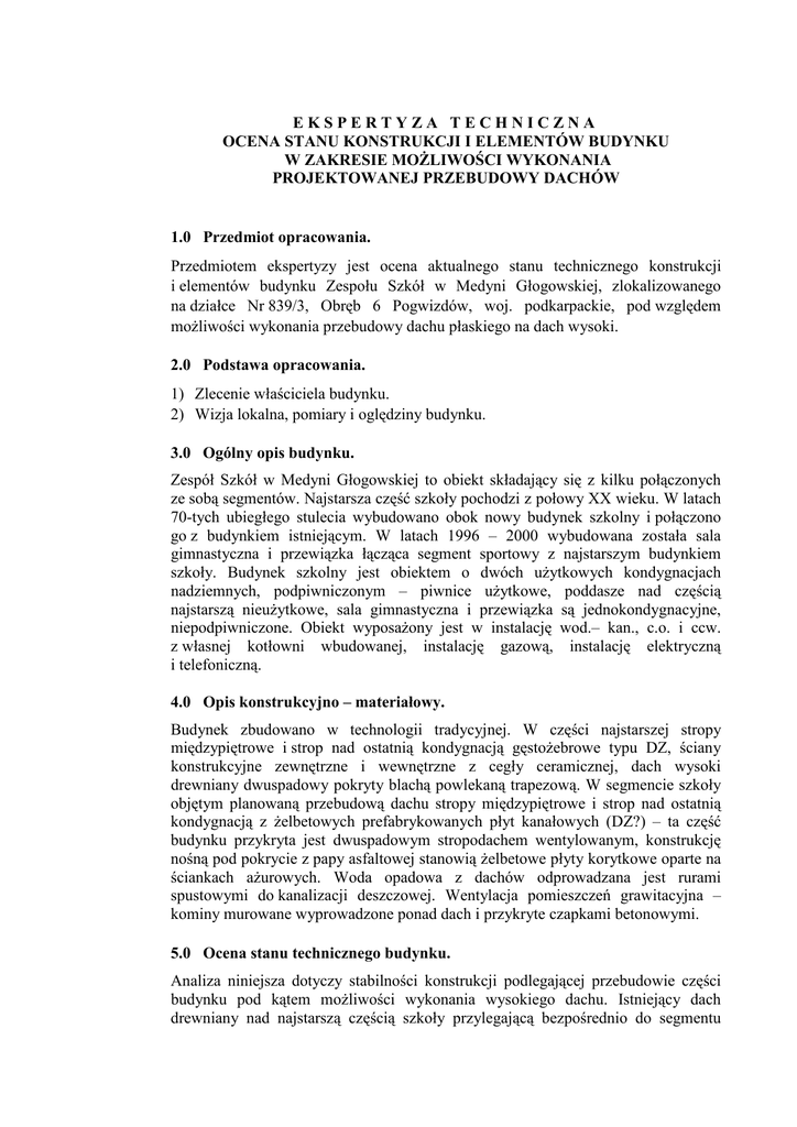 EKSPERTYZA TECHNICZNA OCENA STANU KONSTRUKCJI I ELEMENTÓW BUDYNKU W ZAKRESIE MOśLIWOŚCI WYKONANIA PROJEKTOWANEJ PRZEBUDOWY DACHÓW 1.0 Przedmiot opracowania. Przedmiotem ekspertyzy jest ocena aktualnego stanu technicznego konstrukcji i elementów budynku Zespołu Szkół w Medyni Głogowskiej, zlokalizowanego na działce Nr 839/3, Obręb 6 Pogwizdów, woj. podkarpackie, pod względem moŜliwości wykonania przebudowy dachu płaskiego na dach wysoki. 2.0 Podstawa opracowania. 1) Zlecenie właściciela budynku. 2) Wizja lokalna, pomiary i oględziny budynku. 3.0 Ogólny opis budynku. Zespół Szkół w Medyni Głogowskiej to obiekt składający się z kilku połączonych ze sobą segmentów. Najstarsza część szkoły pochodzi z połowy XX wieku. W latach 70-tych ubiegłego stulecia wybudowano obok nowy budynek szkolny i połączono go z budynkiem istniejącym. W latach 1996 – 2000 wybudowana została sala gimnastyczna i przewiązka łącząca segment sportowy z najstarszym budynkiem szkoły. Budynek szkolny jest obiektem o dwóch uŜytkowych kondygnacjach nadziemnych, podpiwniczonym – piwnice uŜytkowe, poddasze nad częścią najstarszą nieuŜytkowe, sala gimnastyczna i przewiązka są jednokondygnacyjne, niepodpiwniczone. Obiekt wyposaŜony jest w instalację wod.– kan., c.o. i ccw. z własnej kotłowni wbudowanej, instalację gazową, instalację elektryczną i telefoniczną. 4.0 Opis konstrukcyjno – materiałowy. Budynek zbudowano w technologii tradycyjnej. W części najstarszej stropy międzypiętrowe i strop nad ostatnią kondygnacją gęstoŜebrowe typu DZ, ściany konstrukcyjne zewnętrzne i wewnętrzne z cegły ceramicznej, dach wysoki drewniany dwuspadowy pokryty blachą powlekaną trapezową. W segmencie szkoły objętym planowaną przebudową dachu stropy międzypiętrowe i strop nad ostatnią kondygnacją z Ŝelbetowych prefabrykowanych płyt kanałowych (DZ?) – ta część budynku przykryta jest dwuspadowym stropodachem wentylowanym, konstrukcję nośną pod pokrycie z papy asfaltowej stanowią Ŝelbetowe płyty korytkowe oparte na ściankach aŜurowych. Woda opadowa z dachów odprowadzana jest rurami spustowymi do kanalizacji deszczowej. Wentylacja pomieszczeń grawitacyjna – kominy murowane wyprowadzone ponad dach i przykryte czapkami betonowymi. 5.0 Ocena stanu technicznego budynku. Analiza niniejsza dotyczy stabilności konstrukcji podlegającej przebudowie części budynku pod kątem moŜliwości wykonania wysokiego dachu. Istniejący dach drewniany nad najstarszą częścią szkoły przylegającą bezpośrednio do segmentu 2 objętego planowaną przebudową dachów, był w ostatnim okresie poddany znacznemu remontowi ze względu na niestabilność konstrukcji. Konstrukcja dachu została wzmocniona i obecnie znajduje się w dobrym stanie technicznym. W trakcie oględzin budynku objętego planowaną przebudową dachu nie stwierdzono widocznych pęknięć ani rys zagraŜających stabilności ścian konstrukcyjnych. Nie stwierdzono równieŜ widocznych uszkodzeń konstrukcji stropów Ŝelbetowych. Ogólny stan konstrukcji budynku, na których planuje się przebudowę dachu określa się jako dobry. Konstrukcja budynku, w tym równieŜ stropodachu, nie zagraŜa bezpieczeństwu uŜytkowników - stropodach wymaga wykonania bieŜącego remontu pokrycia dachowego i obróbek blacharskich oraz wykonania docieplenia, poniewaŜ jako przegroda zewnętrzna nie spełnia aktualnych normowych wymogów cieplnowilgotnościowych. Zaplanowana przebudowa dachu podyktowana jest względami uŜytkowymi – wymiana pokrycia dachowego z papy na pokrycie z blachodachówki zapewni skuteczną ochronę przez opadami atmosferycznymi a docieplenie stropodachu wełną mineralną poprawi komfort cieplny w obiekcie. 6.0 Wnioski końcowe. Przed wykonaniem przebudowy dachu na segmencie szkoły przykrytym stropodachem wentylowanym rozebrać naleŜy pokrycie z papy asfaltowej oraz zdemontować płyty korytkowe i ścianki aŜurowe – dla odciąŜenia konstrukcji stropu nad ostatnią kondygnacją. Lekką konstrukcję drewnianą pod pokrycie dachu wykonać z drewna impregnowanego ciśnieniowo preparatem ogniochronnym np. Fobos M4 dla uzyskania niepalności drewna i NRO – zgodnie z instrukcją producenta preparatu i na konstrukcji tej wykonać lekkie pokrycie z blachy dachówkowej o grubości min. 0,5mm oraz nową instalację odgromową dachu z podłączeniem do istniejących zwodów pionowych. W budynku zamontować wyłaz dachowy. Izolację cieplną stropu nad ostatnią kondygnacją wykonać płytami z lekkiej wełny mineralnej, obciąŜenie charakterystyczne cięŜarem własnym nie powinno przekraczać 0,40 kN/m3. Planowana przebudowa stropodachu oraz docieplenie stropu wełną mineralną nie spowoduje wzrostu obciąŜeń ponad nośność konstrukcji ani nie pogorszy warunków zdrowotnych, bezpieczeństwa poŜarowego, powodziowego i ochrony środowiska. Pozytywny wpływ na warunki uŜytkowania obiektu będzie mieć docieplenie stropodachu wełną mineralną tak aby spełniony był warunek wymaganej izolacyjności cieplnej przegrody – co zapewni ponadto wymierną oszczędność energii cieplnej. Po spełnieniu powyŜszych zaleceń planowane docieplenie stropu nad ostatnią kondygnacją i przebudowa stropodachu jest moŜliwa do wykonania.
