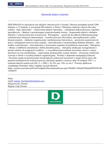 Dane pochodzą ze strony: http://www.jarocin.org/. Wygenerowano dnia: 08-03-2017. Kierownik sklepu w Jarocinie DEICHMANN to największa sieć sklepów obuwniczych w Europie. Obecnie posiadamy ponad 3200 sklepów w 23 krajach, w tym ponad 200 salonów w Polsce. Oferujemy markowe obuwie dla całej rodziny. Opis stanowiska: - realizowanie planów sprzedaży, - zarządzanie kilkuosobowym zespołem sprzedawców, - dbałość o przestrzeganie zasad prezentacji towaru, - bezpośredni udział w obsłudze klientów i wykonywaniu prac towarowych. Wymagania: - gotowość do odbycia kilkumiesięcznego szkolenia poza miejscem zamieszkania, - wysokie poczucie obowiązku, zdyscyplinowanie i pełna dyspozycyjność, - zdolności organizacyjne i predyspozycje kierownicze, - pozytywne nastawienie do pracy i umiejętność motywowania zespołu, - doświadczenie w bezpośredniej obsłudze klientów, - min. średnie wykształcenie, - doświadczenie w kierowaniu zespołem na podobnym stanowisku. Oferujemy: - dbamy o stabilność zatrudnienia i dobrą atmosferę pracy, - oferujemy atrakcyjne wynagrodzenie i premie zależne od osiąganych wyników, - z wszystkimi pracownikami zawieramy umowy o pracę, docelowo na czas nieokreślony, - zapewniamy profesjonalny system szkoleń, - stwarzamy możliwość rozwoju w firmie o wysokiej kulturze organizacyjnej. Prosimy o dopisanie następującej klauzuli: „Wyrażam zgodę na przetwarzanie moich danych osobowych zawartych w mojej ofercie pracy dla potrzeb niezbędnych do realizacji procesu rekrutacji zgodnie z ustawą z dnia 29 sierpnia 1997 r. o ochronie danych osobowych (Dz. U. z 2002 r. Nr 101, poz. 926, ze zm.)” Prosimy aplikować wypełniając formularz, który znajduje się pod adresem: https://system.erecruiter.pl/FormTemplates/RecruitmentForm.aspx?WebID=244a4fc95b6a4f05907823f4 7a56067f Dane: email: [email protected] Miejscowość: Jarocin Region: Cały Powiat