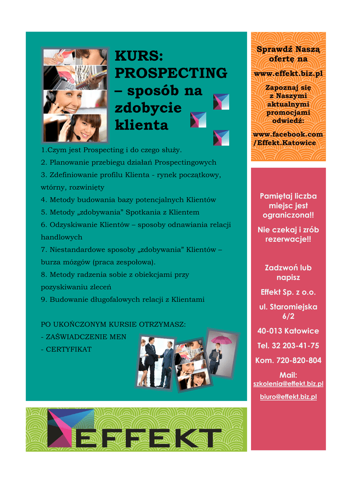 KURS: PROSPECTING – sposób na zdobycie klienta 1.Czym jest Prospecting i do czego słu y. Sprawd Nasz ofert na www.effekt.biz.pl Zapoznaj si z Naszymi aktualnymi promocjami odwied : www.facebook.com /Effekt.Katowice 2. Planowanie przebiegu działa Prospectingowych 3. Zdefiniowanie profilu Klienta - rynek pocz tkowy, wtórny, rozwini ty 4. Metody budowania bazy potencjalnych Klientów Ń. Metody „zdobywania” Spotkania z Klientem 6. Odzyskiwanie Klientów – sposoby odnawiania relacji handlowych Pami taj liczba miejsc jest ograniczona!! Nie czekaj i zrób rezerwacje!! 7. Niestandardowe sposoby „zdobywania” Klientów – burza mózgów (praca zespołowa). 8. Metody radzenia sobie z obiekcjami przy pozyskiwaniu zlece 9. Budowanie długofalowych relacji z Klientami PO UKO CZONYM KURSIE OTRZYMASZ: - ZA WIADCZENIE MEN - CERTYFIKAT Zadzwo lub napisz Effekt Sp. z o.o. ul. Staromiejska 6/2 40-013 Katowice Tel. 32 203-41-75 Kom. 720-820-804 Mail: [email protected] [email protected]