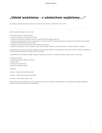 Gmina Dobrcz „Udział weźmiemy – z uśmiechem wyjdziemy....” 29 listopada został zorganizowany konkurs recytatorski dla uczniów ZS Kotomierz klas 1-3 SP. Celem zorganizowanego konkursu, było: ● poznanie twórczości różnych poetów, ● rozwijanie zdolności recytatorskich uczniów, ● rozwijanie umiejętności poprawnej wymowy, właściwej modulacji głosu, jego siły, ● ● ● budzenie zainteresowania teatrem, wyzwalanie w uczniach możliwości kreacyjnych poprzez uczestnictwo w krótkich inscenizacjach, ćwiczenia zmysłów (słuchu, koncentracji), pobudzenie uczniów do aktywnego uczestnictwa w życiu szkoły, rozwijanie pozytywnych cech charakteru, takich jak życzliwość, otwartość, szacunek dla pracy, wysiłku koleżanek i kolegów. Uczniowie biorący udział w konkursie, wygłaszali wiersze znanych poetów – Jana Brzechwy oraz Juliana Tuwima. Usłyszeć mogliśmy też wiersze Stanisława Jachowicza i poetki Marii Konopnickiej. Trzyosobowe jury jednogłośnie podjęło decyzję o zwycięzcach konkursu – biorąc pod uwagę przyjęte kryteria, jakimi były: ● znajomość wiersza, ● interpretacja utworu (tempo, intonacja), ● kultura słowa, ● ogólny wyraz artystyczny, ● elementy dodatkowe (strój). Zwycięzcy: I miejsce – Oskar Kamiński (klasa 2a SP) II miejsce – Sebastian Dombek (klasa 2b SP) III miejsce – Milena Witek (klasa 1 SP) Gratulujemy również pozostałym, licznym uczestnikom konkursu za okazałe zaangażowanie w przygotowanie swojego wystąpienia. Wszyscy uczestnicy konkursu zostali nagrodzeni. 1