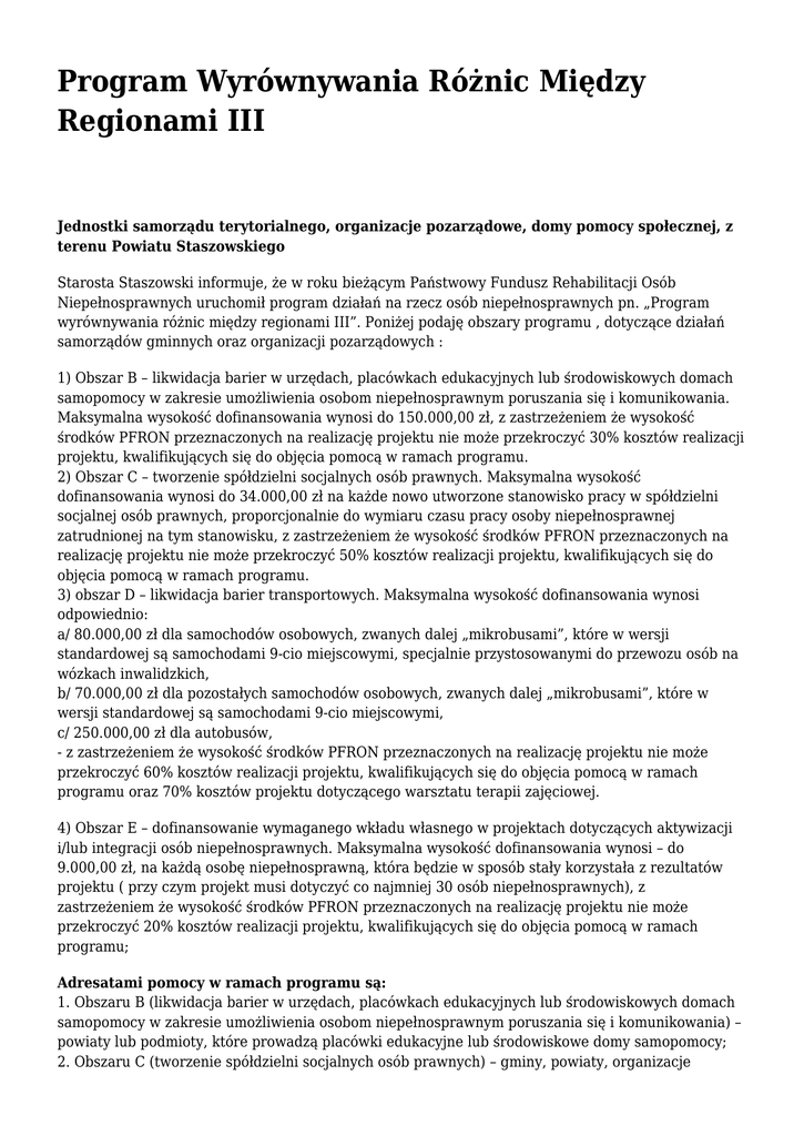Program Wyrównywania Różnic Między Regionami III Jednostki samorządu terytorialnego, organizacje pozarządowe, domy pomocy społecznej, z terenu Powiatu Staszowskiego Starosta Staszowski informuje, że w roku bieżącym Państwowy Fundusz Rehabilitacji Osób Niepełnosprawnych uruchomił program działań na rzecz osób niepełnosprawnych pn. „Program wyrównywania różnic między regionami III”. Poniżej podaję obszary programu , dotyczące działań samorządów gminnych oraz organizacji pozarządowych : 1) Obszar B – likwidacja barier w urzędach, placówkach edukacyjnych lub środowiskowych domach samopomocy w zakresie umożliwienia osobom niepełnosprawnym poruszania się i komunikowania. Maksymalna wysokość dofinansowania wynosi do 150.000,00 zł, z zastrzeżeniem że wysokość środków PFRON przeznaczonych na realizację projektu nie może przekroczyć 30% kosztów realizacji projektu, kwalifikujących się do objęcia pomocą w ramach programu. 2) Obszar C – tworzenie spółdzielni socjalnych osób prawnych. Maksymalna wysokość dofinansowania wynosi do 34.000,00 zł na każde nowo utworzone stanowisko pracy w spółdzielni socjalnej osób prawnych, proporcjonalnie do wymiaru czasu pracy osoby niepełnosprawnej zatrudnionej na tym stanowisku, z zastrzeżeniem że wysokość środków PFRON przeznaczonych na realizację projektu nie może przekroczyć 50% kosztów realizacji projektu, kwalifikujących się do objęcia pomocą w ramach programu. 3) obszar D – likwidacja barier transportowych. Maksymalna wysokość dofinansowania wynosi odpowiednio: a/ 80.000,00 zł dla samochodów osobowych, zwanych dalej „mikrobusami”, które w wersji standardowej są samochodami 9-cio miejscowymi, specjalnie przystosowanymi do przewozu osób na wózkach inwalidzkich, b/ 70.000,00 zł dla pozostałych samochodów osobowych, zwanych dalej „mikrobusami”, które w wersji standardowej są samochodami 9-cio miejscowymi, c/ 250.000,00 zł dla autobusów, - z zastrzeżeniem że wysokość środków PFRON przeznaczonych na realizację projektu nie może przekroczyć 60% kosztów realizacji projektu, kwalifikujących się do objęcia pomocą w ramach programu oraz 70% kosztów projektu dotyczącego warsztatu terapii zajęciowej. 4) Obszar E – dofinansowanie wymaganego wkładu własnego w projektach dotyczących aktywizacji i/lub integracji osób niepełnosprawnych. Maksymalna wysokość dofinansowania wynosi – do 9.000,00 zł, na każdą osobę niepełnosprawną, która będzie w sposób stały korzystała z rezultatów projektu ( przy czym projekt musi dotyczyć co najmniej 30 osób niepełnosprawnych), z zastrzeżeniem że wysokość środków PFRON przeznaczonych na realizację projektu nie może przekroczyć 20% kosztów realizacji projektu, kwalifikujących się do objęcia pomocą w ramach programu; Adresatami pomocy w ramach programu są: 1. Obszaru B (likwidacja barier w urzędach, placówkach edukacyjnych lub środowiskowych domach samopomocy w zakresie umożliwienia osobom niepełnosprawnym poruszania się i komunikowania) – powiaty lub podmioty, które prowadzą placówki edukacyjne lub środowiskowe domy samopomocy; 2. Obszaru C (tworzenie spółdzielni socjalnych osób prawnych) – gminy, powiaty, organizacje pozarządowe; 3.Obszaru D (likwidacja barier transportowych): a. placówki służące rehabilitacji osób niepełnosprawnych prowadzone przez: organizacje pozarządowe, gminy lub powiaty, b. jednostki prowadzące warsztaty terapii zajęciowej; 4.Obszaru E (dofinansowanie wymaganego wkładu własnego w projektach dotyczących aktywizacji i/lub integracji osób niepełnosprawnych) – gminy, powiaty oraz organizacje pozarządowe; W przypadku obszarów programu: B, C, D, projektodawca składa wniosek o przyznanie środków finansowych na realizację projektu do samorządu powiatowego, właściwego dla miejsca realizacji projektu, zawierający projekt sporządzony zgodnie z Zasadami dotyczącymi wyboru, dofinansowania i rozliczania projektów dotyczących obszarów B, C, D, F i G, stanowiącymi załącznik nr 1 do procedur programu. W przypadku obszaru E programu, projektodawca składa wniosek o przyznanie środków finansowych na realizację projektu bezpośrednio do Oddziału PFRON, właściwego dla miejsca realizacji projektu, zawierający projekt sporządzony zgodnie z Zasadami dotyczącymi wyboru, dofinansowania i rozliczania projektów dotyczących obszaru E programu. Termin składania wniosków do Oddziału Świętokrzyskiego PFRON, w Obszarze E programu, upływa z dniem 30.11.2016r. Termin składania projektów do Powiatu Staszowskiego, w ramach obszarów B,C,D programu, upływa z dniem 15.04.2016r. Nadmieniam, że od dnia 08.03.2016r. w Biuletynie Informacji Publicznej Starostwa Powiatowego w Staszowie w zakładce osoby niepełnosprawne/Program Wyrównywania Różnic Miedzy Regionami III, będą dostępne druki wniosków o dofinansowanie projektów oraz druki do opracowania projektów w Obszarze B i D programu. Druk projektu w Obszarze C programu zostanie opracowany i udostępniony na w/w witrynie internetowej po zgłoszeniu przez projektodawcę, na skrzynkę e-mailową: [email protected], planu utworzenia spółdzielni socjalnej osób prawnych i zamiaru ubiegania się o dofinansowanie ze środków PFRON na realizację takiego przedsięwzięcia. Szczegółowe procedury programu są dostępne na stronie internetowej www.pfron.org.pl, zakładka: programy i zadania PFRON. Dodatkowe informacje można otrzymać w Wydziale Spraw Obywatelskich i Zarządzania Kryzysowego (tel. 15-864-68-12, osoba odpowiedzialna Radosław Chynek) Starosta Staszowski Michał Skotnicki Program finansowany ze środków PFRON Realizator programu: Powiat Staszowski Staszów dnia 04.03.2016r. SO.8312.4.2.2016.IIIA Gmina Rytwiany - www.rytwiany.com.pl