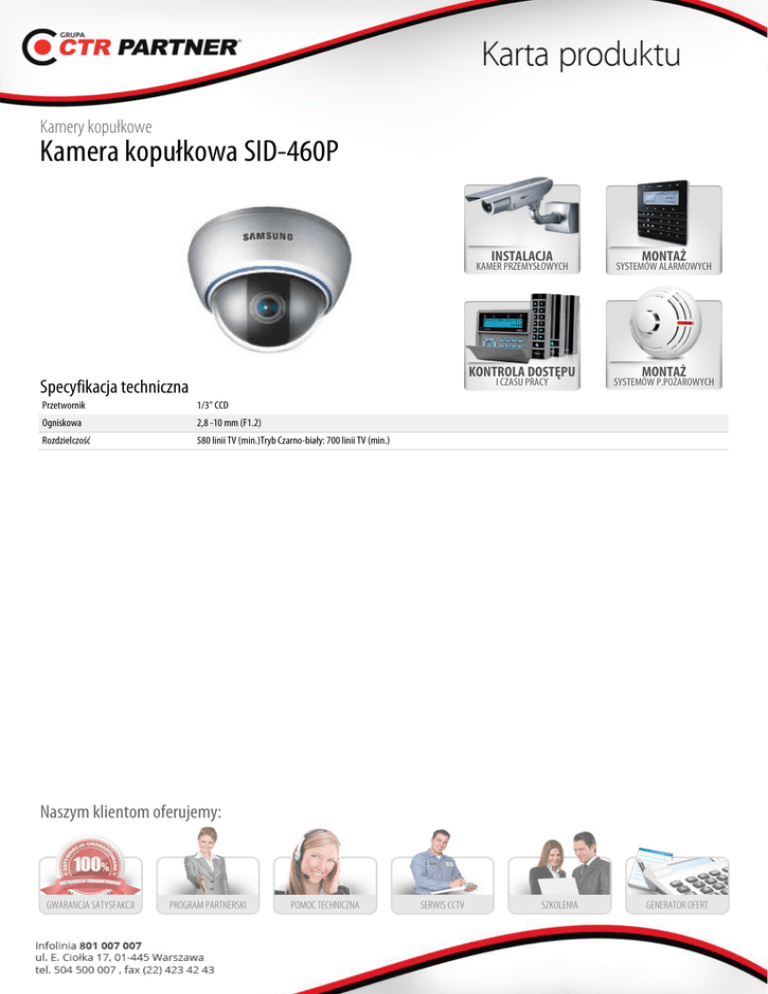 Kamery kopułkowe Kamera kopułkowa SID-460P INSTALACJA KAMER PRZEMYSŁOWYCH KONTROLA DOSTĘPU I CZASU PRACY Specyfikacja techniczna Przetwornik 1/3" CCD Ogniskowa 2,8 -10 mm (F1.2) Rozdzielczość 580 linii TV (min.)Tryb Czarno-biały: 700 linii TV (min.) MONTAŻ SYSTEMÓW ALARMOWYCH MONTAŻ SYSTEMÓW P.POŻAROWYCH Naszym klientom oferujemy: GWARANCJA SATYSFAKCJI PROGRAM PARTNERSKI POMOC TECHNICZNA SERWIS CCTV SZKOLENIA GENERATOR OFERT