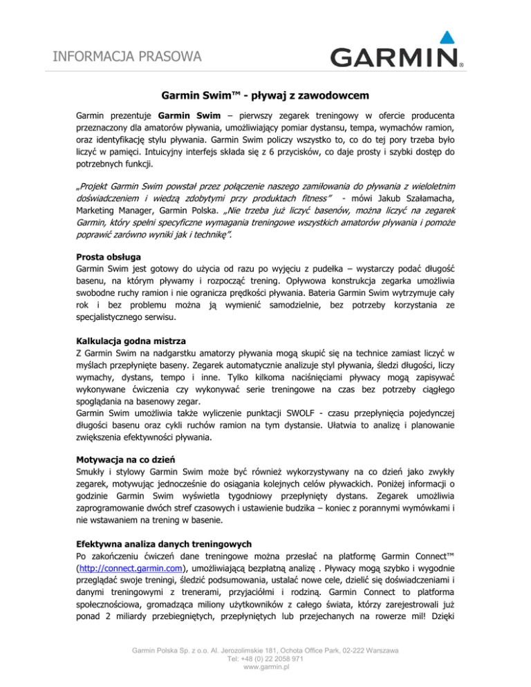 INFORMACJA PRASOWA Garmin Swim™ - pływaj z zawodowcem Garmin prezentuje Garmin Swim – pierwszy zegarek treningowy w ofercie producenta przeznaczony dla amatorów pływania, umożliwiający pomiar dystansu, tempa, wymachów ramion, oraz identyfikację stylu pływania. Garmin Swim policzy wszystko to, co do tej pory trzeba było liczyć w pamięci. Intuicyjny interfejs składa się z 6 przycisków, co daje prosty i szybki dostęp do potrzebnych funkcji. „Projekt Garmin Swim powstał przez połączenie naszego zamiłowania do pływania z wieloletnim doświadczeniem i wiedzą zdobytymi przy produktach fitness” - mówi Jakub Szałamacha, Marketing Manager, Garmin Polska. „Nie trzeba już liczyć basenów, można liczyć na zegarek Garmin, który spełni specyficzne wymagania treningowe wszystkich amatorów pływania i pomoże poprawić zarówno wyniki jak i technikę”. Prosta obsługa Garmin Swim jest gotowy do użycia od razu po wyjęciu z pudełka – wystarczy podać długość basenu, na którym pływamy i rozpocząć trening. Opływowa konstrukcja zegarka umożliwia swobodne ruchy ramion i nie ogranicza prędkości pływania. Bateria Garmin Swim wytrzymuje cały rok i bez problemu można ją wymienić samodzielnie, bez potrzeby korzystania ze specjalistycznego serwisu. Kalkulacja godna mistrza Z Garmin Swim na nadgarstku amatorzy pływania mogą skupić się na technice zamiast liczyć w myślach przepłynięte baseny. Zegarek automatycznie analizuje styl pływania, śledzi długości, liczy wymachy, dystans, tempo i inne. Tylko kilkoma naciśnięciami pływacy mogą zapisywać wykonywane ćwiczenia czy wykonywać serie treningowe na czas bez potrzeby ciągłego spoglądania na basenowy zegar. Garmin Swim umożliwia także wyliczenie punktacji SWOLF - czasu przepłynięcia pojedynczej długości basenu oraz cykli ruchów ramion na tym dystansie. Ułatwia to analizę i planowanie zwiększenia efektywności pływania. Motywacja na co dzień Smukły i stylowy Garmin Swim może być również wykorzystywany na co dzień jako zwykły zegarek, motywując jednocześnie do osiągania kolejnych celów pływackich. Poniżej informacji o godzinie Garmin Swim wyświetla tygodniowy przepłynięty dystans. Zegarek umożliwia zaprogramowanie dwóch stref czasowych i ustawienie budzika – koniec z porannymi wymówkami i nie wstawaniem na trening w basenie. Efektywna analiza danych treningowych Po zakończeniu ćwiczeń dane treningowe można przesłać na platformę Garmin Connect™ (http://connect.garmin.com), umożliwiającą bezpłatną analizę . Pływacy mogą szybko i wygodnie przeglądać swoje treningi, śledzić podsumowania, ustalać nowe cele, dzielić się doświadczeniami i danymi treningowymi z trenerami, przyjaciółmi i rodziną. Garmin Connect to platforma społecznościowa, gromadząca miliony użytkowników z całego świata, którzy zarejestrowali już ponad 2 miliardy przebiegniętych, przepłyniętych lub przejechanych na rowerze mil! Dzięki Garmin Polska Sp. z o.o. Al. Jerozolimskie 181, Ochota Office Park, 02-222 Warszawa Tel: +48 (0) 22 2058 971 www.garmin.pl INFORMACJA PRASOWA bezprzewodowej technologii ANT+™ i wtyczki USB dołączanej do Garmin Swim, dane treningowe są automatycznie przesyłane do komputera, gdy znajdą się w jego zasięgu. Garmin Connect jest kompatybilny z komputerami Mac® oraz z systemem Windows®. Specyfikacja techniczna Wymiary urządzenia (szer. x wys. x dł.): 4,8 x 1,3 x 4,4 cm (1,9 x 0,5 x 1,7 cala) Masa: 40,0 g (1,4 uncji) Rozdzielczość wyświetlacza (szer. x wys.): 55 x 31 pikseli Bateria: CR2032 (wymieniana przez użytkownika) Czas działania baterii: 1 rok Wodoszczelność: tak (50 m) Obsługa GPS: nie Funkcje Obliczanie długości/liczby okrążeń: tak Wyświetlanie dystansu: tak Obliczanie liczby ruchów: tak Wyświetlanie tempa: tak Kalorie: tak Tętno: nie Wynik SWOLF: tak Identyfikacja stylu pływackiego: tak Szybkie treningi na czas: tak Konfigurowalne strony treningów: tak Automatyczne wykrywanie czasu odpoczynku: tak Wprowadzanie programu ćwiczeń: tak (wymagane wprowadzenie danych przez użytkownika) Zgodność z Garmin Connect™: tak Automatyczna synchronizacja (automatyczne przesyłanie danych do komputera): tak Przechowywanie danych: tak (co najmniej 30 treningów) Zegarek sportowy: tak Dodatkowe funkcje zegarka: aktualny czas (format 12-/24-godzinny), dwie strefy czasowe, kalendarz (dzień/data) i codzienne budzenie. Aby zobaczyć Garmin Swim w akcji, wejdź na: www.garmin.com/swim. Zegarek dostępny będzie w sprzedaży w lipcu 2012 w sugerowanej cenie detalicznej 149 euro. Więcej informacji można znaleźć na: https://buy.garmin.com/shop/shop.do?cID=425&pID=97287 Garmin Swim to najnowszy produkt firmy Garmin, która od ponad 20 lat jest niekwestionowanym liderem w każdym z najważniejszych sektorów rynku urządzeń GPS, poczynając od motoryzacji, poprzez lotnictwo i żeglugę, a na fitness, rekreacji na świeżym powietrzu czy narzędziach służących do śledzenia i aplikacjach dla systemów bezprzewodowych kończąc. Więcej informacji na temat oferty, cen oraz dostępności produktów i ok. 3,22 mld km usług firmy Garmin można znaleźć na stronie www.garmin.com, www.garmin.blogs.com i http://twitter.com/garmin. Szczegółowe instrukcje, poradniki wideo oraz specyfikacje produktów Garmin udostępnione są w specjalnym serwisie www.garmin.com/learningcenter. Garmin Polska Sp. z o.o. Al. Jerozolimskie 181, Ochota Office Park, 02-222 Warszawa Tel: +48 (0) 22 2058 971 www.garmin.pl INFORMACJA PRASOWA Informacje o firmie Garmin International Garmin International Inc. jest spółką zależną Garmin Ltd. (Nasdaq: GRMN), globalnego lidera nawigacji satelitarnej. Począwszy od 1989 r. firmy wchodzące w skład tej grupy projektują, produkują, wprowadzają na rynek, sprzedają urządzenia i aplikacje nawigacyjne, komunikacyjne oraz informacyjne, z których większość bazuje na technologii GPS. Produ