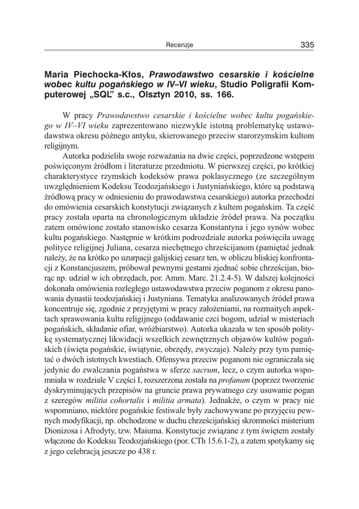 Recenzje 335 Maria Piechocka-Kłos, Prawodawstwo cesarskie i kościelne wobec kultu pogańskiego w IV–VI wieku, Studio Poligrafii Komputerowej „SQL” s.c., Olsztyn 2010, ss. 166. W pracy Prawodawstwo cesarskie i kocielne wobec kultu pogañskiego w IVVI wieku zaprezentowano niezwykle istotn¹ problematykê ustawodawstwa okresu pónego antyku, skierowanego przeciw starorzymskim kultom religijnym. Autorka podzieli³a swoje rozwa¿ania na dwie czêci, poprzedzone wstêpem powiêconym ród³om i literaturze przedmiotu. W pierwszej czêci, po krótkiej charakterystyce rzymskich kodeksów prawa poklasycznego (ze szczególnym uwzglêdnieniem Kodeksu Teodozjañskiego i Justyniañskiego, które s¹ podstaw¹ ród³ow¹ pracy w odniesieniu do prawodawstwa cesarskiego) autorka przechodzi do omówienia cesarskich konstytucji zwi¹zanych z kultem pogañskim. Ta czêæ pracy zosta³a oparta na chronologicznym uk³adzie róde³ prawa. Na pocz¹tku zatem omówione zosta³o stanowisko cesarza Konstantyna i jego synów wobec kultu pogañskiego. Nastêpnie w krótkim podrozdziale autorka powiêci³a uwagê polityce religijnej Juliana, cesarza niechêtnego chrzecijanom (pamiêtaæ jednak nale¿y, ¿e na krótko po uzurpacji galijskiej cesarz ten, w obliczu bliskiej konfrontacji z Konstancjuszem, próbowa³ pewnymi gestami zjednaæ sobie chrzecijan, bior¹c np. udzia³ w ich obrzêdach, por. Amm. Marc. 21.2.4-5). W dalszej kolejnoci dokona³a omówienia rozleg³ego ustawodawstwa przeciw poganom z okresu panowania dynastii teodozjañskiej i Justyniana. Tematyka analizowanych róde³ prawa koncentruje siê, zgodnie z przyjêtymi w pracy za³o¿eniami, na rozmaitych aspektach sprawowania kultu religijnego (oddawanie czci bogom, udzia³ w misteriach pogañskich, sk³adanie ofiar, wró¿biarstwo). Autorka ukaza³a w ten sposób politykê systematycznej likwidacji wszelkich zewnêtrznych objawów kultów pogañskich (wiêta pogañskie, wi¹tynie, obrzêdy, zwyczaje). Nale¿y przy tym pamiêtaæ o dwóch istotnych kwestiach. Ofensywa przeciw poganom nie ogranicza³a siê jedynie do zwalczania pogañstwa w sferze sacrum, lecz, o czym autorka wspomnia³a w rozdziale V czêci I, rozszerzona zosta³a na profanum (poprzez tworzenie dyskryminuj¹cych przepisów na gruncie prawa prywatnego czy usuwanie pogan z szeregów militia cohortalis i militia armata). Jednak¿e, o czym w pracy nie wspomniano, niektóre pogañskie festiwale by³y zachowywane po przyjêciu pewnych modyfikacji, np. obchodzone w duchu chrzecijañskiej skromnoci misterium Dionizosa i Afrodyty, tzw. Maiuma. Konstytucje zwi¹zane z tym wiêtem zosta³y w³¹czone do Kodeksu Teodozjañskiego (por. CTh 15.6.1-2), a zatem spotykamy siê z jego celebracj¹ jeszcze po 438 r. 336 Recenzje Druga czêæ pracy powiêcona zosta³a stanowisku w³adz chrzecijañskiej wspólnoty wobec kultu pogañskiego w pónym antyku. Rozwa¿ania rozpoczynaj¹ siê od przybli¿enia pogl¹dów chrzecijañskich apologetów na kwestiê udzia³u chrzecijan w ¿yciu religijnym i publicznym Rzymian, co (z uwagi na przenikanie siê sacrum i profanum) grozi³o grzechem ba³wochwalstwa (idolatria). Koncentruj¹c siê na rozwa¿aniach Tertuliana (De spectaculis, De idolatria) autorka wprowadza czytelnika w zagadnienie stosunku do ba³wochwalstwa synodów kocielnych, których ustawodawstwu powiêca miejsce w dalszej czêci pracy, omawia tak¿e krótk¹ genezê synodów oraz ich znaczenie jako czynnika prawotwórczego. Przytacza decyzje trzech synodów, podjête przeciw kultowi pogañskiemu w IV w. (synod w Elwirze 306 r., Ancyrze 314 r., Valentia [Valence dAgen] 374 r.) i decyzje synodów, które obradowa³y wiekach VVI. Uwaga powiêcona zosta³a tak¿e Konstytucjom apostolskim uznawanym przez prawo kocielne za tekst normatywny. Praca jest dobrze udokumentowana pod wzglêdem ród³owym, jej niezaprzeczalne walory wzbogaci³oby jednak uzupe³nienie prowadzonych przez autorkê rozwa¿añ o kilka aspektów. Analizê róde³ jurydycznych ilustruje wartociowy materia³ pozajurydyczny, ze szczególnym uwzglêdnieniem autorów chrzecijañskich b¹d chrzecijañstwu sprzyjaj¹cych (m.in. Euzebiusz z Cezarei, Sokrates Scholastyk, Sozomen, Laktancjusz, Tertulian). Zabrak³o, moim zdaniem, równowa¿nego g³osu ze strony autorów reprezentuj¹cych tradycyjne wartoci religijne Rzymian. Autorka nawi¹zuje, co prawda, do relatio Symmachusa, z³o¿onej w sprawie sporu o o³tarz Wiktorii, jednak¿e nie siêga do bardzo wa¿nego wiadectwa epoki przeladowañ pogan, jakim jest mowa Libaniusza skierowana do Teodozjusza I w obronie pogañskich miejsc kultu (Or. XXX., dostêpna polskiemu czytelnikowi w przek³adzie L. Ma³unowiczówny). Stanowi ona doskona³¹ ilustracjê efektów wywo³anych przez wspomniane w pracy edykty Teodozjusza. Ponadto wartoæ pracy podnios³aby zapewne analiza prawnoporównawcza przytoczonych przez autorkê, powiêconych problemowi pogañstwa, aktów prawnych w³adzy cesarskiej i w³adz kocielnych. Pozwoli³oby to na szersze przyjrzenie siê problemowi wzajemnego wp³ywu prawotwórczej dzia³alnoci cesarskich kwestorów pa³acowych i synodów kocielnych. W omawianej przez autorkê dziedzinie cesarskiego i kocielnego prawodawstwa widoczna jest zbie¿noæ w zainteresowaniu w³adz problemami zwi¹zanymi z kultem pogañskim (nie tylko sk³adanie ofiar czy ba³wochwalstwo, ale tak¿e inne przejawy starorzymskich tradycji sakralno-magicznych, np. wró¿biarstwo). Ciekawie wygl¹da³aby próba udzielenia odpowiedzi na pytanie, do jakiego stopnia dzia³alnoæ synodów wp³ywa³a na kszta³t cesarskiego prawa i vice versa. Interakcja taka z pewnoci¹ istnia³a, o czym wiadczy chocia¿by zachowana epistola ad episcopos post Arelatense Recenzje 337 concilium Konstantyna z 314 r. (Testi Costantiniani nelle fonti letterarie, pod red. P. Silli, Mediolan 1987, s. 20). Odnonie do zajêtego przez autorkê stanowiska w pewnych kwestiach, nie jestem sk³onny uznaæ konstytucji Konstantyna w sprawie ustano