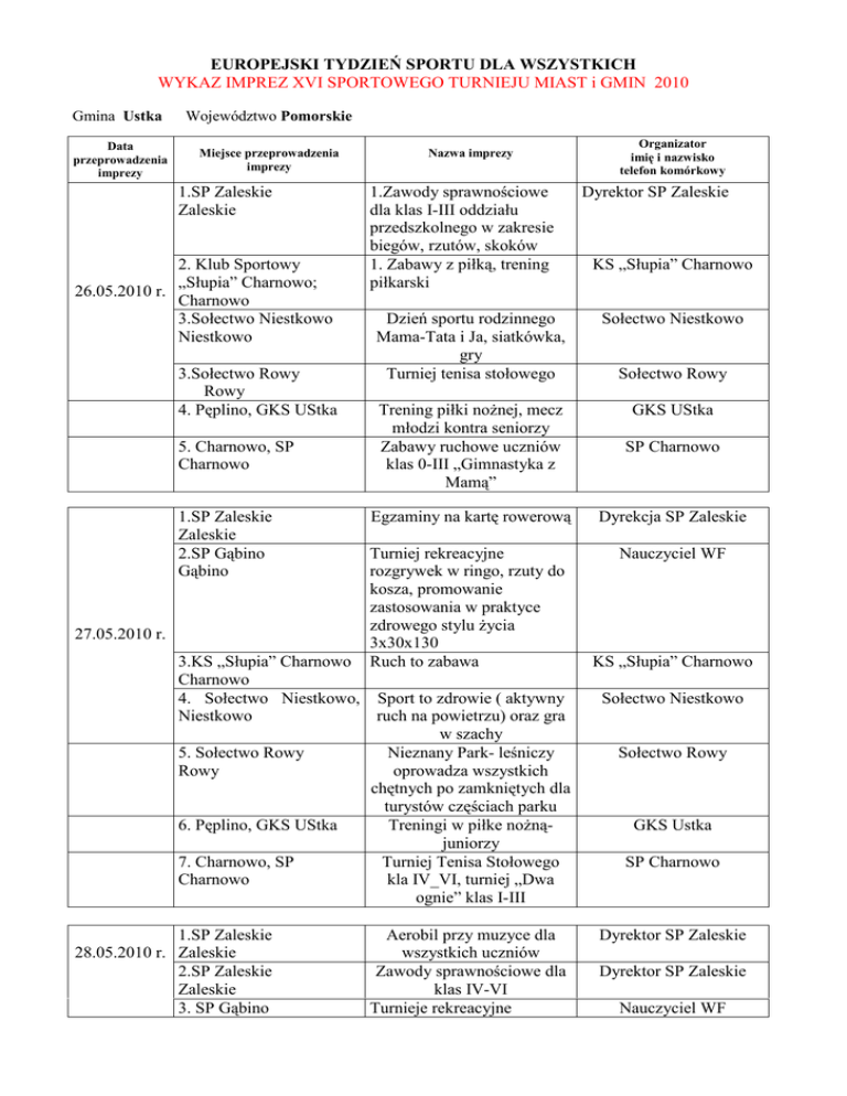 EUROPEJSKI TYDZIEŃ SPORTU DLA WSZYSTKICH WYKAZ IMPREZ XVI SPORTOWEGO TURNIEJU MIAST i GMIN 2010 Gmina Ustka Województwo Pomorskie Data przeprowadzenia imprezy Miejsce przeprowadzenia imprezy 1.SP Zaleskie Zaleskie 2. Klub Sportowy „Słupia” Charnowo; 26.05.2010 r. Charnowo 3.Sołectwo Niestkowo Niestkowo 3.Sołectwo Rowy Rowy 4. Pęplino, GKS UStka 5. Charnowo, SP Charnowo 1.SP Zaleskie Zaleskie 2.SP Gąbino Gąbino 27.05.2010 r. Nazwa imprezy 1.Zawody sprawnościowe dla klas I-III oddziału przedszkolnego w zakresie biegów, rzutów, skoków 1. Zabawy z piłką, trening piłkarski Dyrektor SP Zaleskie KS „Słupia” Charnowo Dzień sportu rodzinnego Mama-Tata i Ja, siatkówka, gry Turniej tenisa stołowego Sołectwo Niestkowo Trening piłki noŜnej, mecz młodzi kontra seniorzy Zabawy ruchowe uczniów klas 0-III „Gimnastyka z Mamą” GKS UStka SP Charnowo Egzaminy na kartę rowerową Dyrekcja SP Zaleskie Turniej rekreacyjne rozgrywek w ringo, rzuty do kosza, promowanie zastosowania w praktyce zdrowego stylu Ŝycia 3x30x130 Ruch to zabawa Nauczyciel WF 3.KS „Słupia” Charnowo Charnowo 4. Sołectwo Niestkowo, Sport to zdrowie ( aktywny Niestkowo ruch na powietrzu) oraz gra w szachy 5. Sołectwo Rowy Nieznany Park- leśniczy Rowy oprowadza wszystkich chętnych po zamkniętych dla turystów częściach parku 6. Pęplino, GKS UStka Treningi w piłke noŜnąjuniorzy 7. Charnowo, SP Turniej Tenisa Stołowego Charnowo kla IV_VI, turniej „Dwa ognie” klas I-III 1.SP Zaleskie 28.05.2010 r. Zaleskie 2.SP Zaleskie Zaleskie 3. SP Gąbino Organizator imię i nazwisko telefon komórkowy Aerobil przy muzyce dla wszystkich uczniów Zawody sprawnościowe dla klas IV-VI Turnieje rekreacyjne Sołectwo Rowy KS „Słupia” Charnowo Sołectwo Niestkowo Sołectwo Rowy GKS Ustka SP Charnowo Dyrektor SP Zaleskie Dyrektor SP Zaleskie Nauczyciel WF Gąbino rozgrywek w ringo, rzuty do kosza, promowanie zastosowania w praktyce zdrowego stylu Ŝycia 3x30x130 4. Sołectwo Niestkowo, Gramy w tenisa ziemnego Niestkowo oraz w tenisa stołowego 5. Sołectwo Rowy Mecz Piłki noŜnej oldboje Rowy kontra małolaci 6. Pęplino, GKS UStka Mecz w piłkę noŜną Sołectwo Niestkowo, Niestkowo Sołectwo Rowy GKS Ustka 1.SP Gąbino; Gąbino Treningi indywidualne wg Nauczyciel WF zasady 3x30x130( spacer, jazda na rowerze, biegi) 2.ZSS w Objeździe; Turniej Piłki NoŜnej o Dyrekcja ZSS Objazda Objazda Puchar Dyrektora ZSS w Objeździe Koło Gospodyń 3.KGW Wodnica; Festyn Rodzinny z okazji Wodnica Dnia Matki, Dnia Dziecka w Wiejskich Wodnica 29.05.2010 r. tym bieganie, skakanie na skakance, zbawa w sznura, zawody sprawnościowe 4.Sołectwo Niestkowo, KaŜdy umie pływać, Sołectwo Niestkowo, Niestkowo Pływajmy razem ( basen) Niestkowo 5. Sołectwo Rowy Zawody wędkarskie o tytuł Sołectwo Rowy Rowy mistrza portu w Rowach 6. Pęplino, GKS Ustka Mecz w piłkę noŜną GKS Ustka 1.SP Gąbino; Gąbino Treningi indywidualne wg zasady 3x30x130( spacer, jazda na rowerze, biegi) 2.KS „Słupia” Charnowo; Piłka noŜna 30.05.2010 r. Charnowo 3. Sołectwo Niestkowo, Gry rekreacyjne Niestkowo 4. Sołectwo Rowy Turniej szachowy Rowy 1.SP Gąbino; Gąbino Rajd pieszy w okolice Komina, wspólne grillowanie i integracja uczestników 2. Sołectwo Niestkowo, Łączy nas piłka, Niestkowo doskonalimy i ćiwczymy swoje umiejętności; piłka noŜna, siatkówka, 31.05.2010 r. koszykówka 3. Sołectwo Rowy Wycieczka rowerowa na Rowy Objejskie Łąki 4. Pęplino, GKS UStka Treningi sprawnościowe 5. Charnowo, SP Zabawy sportowe z Charnowo elementami współzawodnictwa Klas 0- Nauczyciel WF KS „Słupia” Charnowo Sołectwo Niestkowo, Niestkowo Sołectwo Rowy Nauczyciel WF Sołectwo Niestkowo, Niestkowo GKS Ustka SP Charnowo III, Sprawnie, szybko, zdrowo 1.SP Zaleskie; Zaleskie 2.SP Gąbino; Gąbino 01.06.2010 r. 3. ZSS Objazda; Objazda 4. KS „Słupia” Charnowo; Charnowo 5. Sołectwo Niestkowo, Niestkowo 6. Sołectwo Rowy Rowy 7. Pęplino, GKS Ustka 8. SP Charnowo, Charnowo 9. KS Bistal Machowino Machowino Turniej wiedzy o sporcie dla Dyrekcja SP Zaleskie klas I-III Turniej piłki koszykowej Mecze piłki siatkowej: uczniowei kontra nauczyciele i pracownicy szkoły, rodzice kontra goście Obchodu Dnia Dziecka: SP Gąbino we współpracy rzuty do kosza, rzuty do celu z nauczycielem WF woreczkiem , skok w dal, rzut piłeczką p., skoki na skakance, taniec na gazecie, biegi indywidualne dla poszczególnych grup wiekowych, rzut lotką do tarczy Piesze wycieczki turystyczne Zespół Szkół po najbliŜszej okolicy Samorządowych Objazda połączone z rekreacją Dzień sportu rodzinnego: KS „Słupia „Charnowo” konkurencje, gry i zabawy Dzień sportu ( gry i zabawy) Sołectwo Niestkowo, Niestkowo Dzień Dziecka-turniej Sołectwo Rowy piłkarski, zawody bieg w workach, przeciąganie liny GKS Ustka Mecz pomiędzy juniorami, mecz w piłkę noŜną dzieci kontra rodzice Szkolny turniej piłki noŜnej SP Charnowo klas IV-VI Mecze piłki noŜnej z okazji KS Bistal Machowino Dnia Dziecka ................................ ____________________________________________________________________________________________________ URZĄD GMINY USTKA - CERTYFIKAT ISO 9001:2008 Tel. 059/814 60 44 fax 059/814 42 57 www.ustka.ug.gov.pl e-mail: [email protected] Sporządziła: Anna śupnik Telefon:059/ 815 24 22