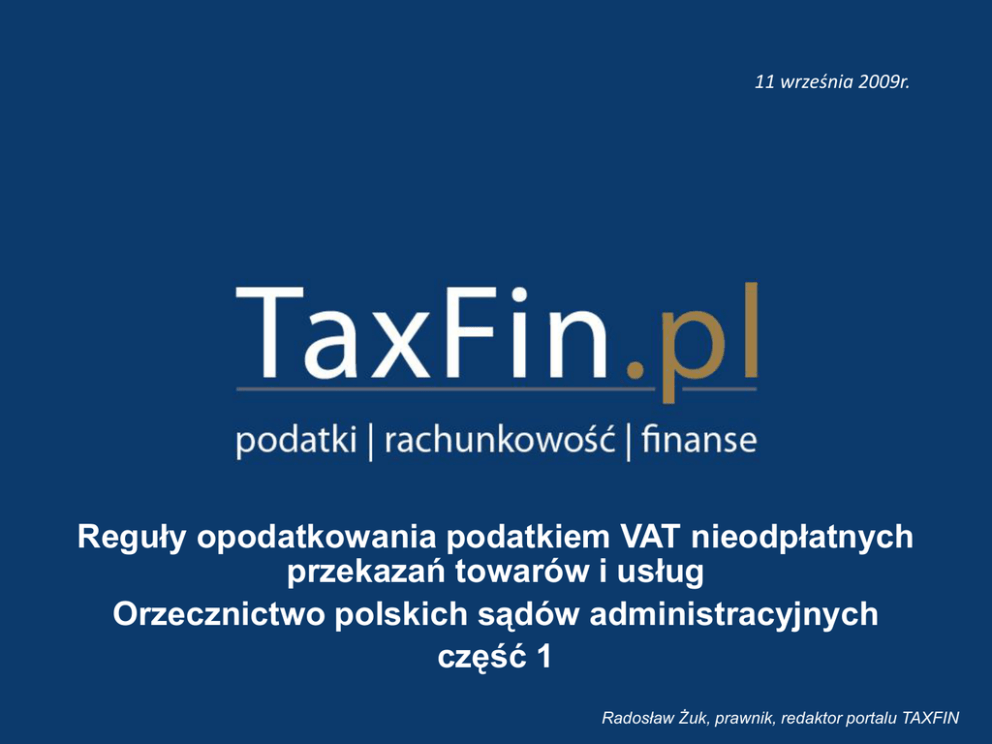 11 września 2009r. Reguły opodatkowania podatkiem VAT nieodpłatnych przekazań towarów i usług Orzecznictwo polskich sądów administracyjnych część 1 Radosław Żuk, prawnik, redaktor portalu TAXFIN Orzeczenie w składzie 7 sędziów NSA z dnia 23 marca 2009 r. sygn. akt I FPS 6/08 Czynności podlegające opodatkowaniu podatkiem VAT Art. 5 ust. 1 - Opodatkowaniu podatkiem od towarów i usług, zwanym dalej „podatkiem”, podlegają: 1) odpłatna dostawa towarów i odpłatne świadczenie usług na terytorium kraju; 2) eksport towarów; 3) import towarów; 4) wewnątrzwspólnotowe nabycie towarów za wynagrodzeniem na terytorium kraju; 5) wewnątrzwspólnotowa dostawa towarów. Nieodpłatne przekazanie towarów w ustawie o podatku VAT Art. 7 ust. 2 - Przez dostawę towarów (...) rozumie się również przekazanie przez podatnika towarów należących do jego przedsiębiorstwa na cele inne niż związane z prowadzonym przez niego przedsiębiorstwem, w szczególności: 1) przekazanie lub zużycie towarów na cele osobiste podatnika lub jego pracowników, w tym byłych pracowników, wspólników, udziałowców, akcjonariuszy, członków spółdzielni i ich domowników, członków organów stanowiących osób prawnych, członków stowarzyszenia; 2) wszelkie inne przekazanie towarów bez wynagrodzenia, w szczególności darowizny - jeżeli podatnikowi przysługiwało prawo do obniżenia kwoty podatku należnego o kwotę podatku naliczonego od tych czynności, w całości lub w części. Nieodpłatne świadczenie usług w ustawie o podatku VAT Art. 8 ust. 2 - Nieodpłatne świadczenie usług niebędące dostawą towarów na cele osobiste podatnika lub jego pracowników, w tym byłych pracowników, wspólników, udziałowców, akcjonariuszy, członków spółdzielni i ich domowników, członków organów stanowiących osób prawnych, członków stowarzyszenia, oraz wszelkie inne nieodpłatne świadczenie usług, jeżeli nie są one związane z prowadzeniem przedsiębiorstwa, a podatnikowi przysługiwało prawo do obniżenia kwoty podatku należnego o kwotę podatku naliczonego przy nabyciu towarów i usług związanych z tymi usługami, w całości lub w części, traktuje się jak odpłatne świadczenie usług. Orzeczenie NSA z dnia 23 marca 2009 r. Teza: Przekazanie przez podatnika bez wynagrodzenia towarów należących do jego przedsiębiorstwa na cele związane z tym przedsiębiorstwem w świetle art. 7 ust. 2 i 3 ustawy z dnia 11 marca 2004 r.o podatku od towarów i usług (Dz.U. nr 54, poz. 535 ze zm.), w brzmieniu obowiązującym od 1 czerwca 2005 r., nie stanowi dostawy towarów, nawet jeżeli podatnikowi przysługiwało prawo do obniżenia podatku należnego o kwotę podatku naliczonego w związku z nabyciem tych towarów. Opodatkowanie nieodpłatnych przekazao Nieodpłatne przekazania podlegają opodatkowaniu, jeżeli spełniono kumulatywnie dwie przesłanki: - nieodpłatne przekazanie towaru lub usługi nie było związane z prowadzonym przez podatnika przedsiębiorstwem, - podatnikowi przysługiwało prawo do odliczenia podatku naliczonego przy nabyciu bądź wytworzeniu towaru lub usługi Prawo do odliczenia Dla prawa do odliczenia podatku od towarów i usług nie jest istotne czy podatnik faktycznie skorzystał z odliczenia, a jedynie czy posiadał obiektywną możliwośd odliczenia podatku naliczonego w świetle art. 86 ust. 1 ustawy o VAT Darowizna Kodeks cywilny: Art. 888. § 1. Przez umowę darowizny darczyoca zobowiązuje się do bezpłatnego świadczenia na rzecz obdarowanego kosztem swego majątku. Darowizna na gruncie VAT: - zawsze brak związku z prowadzonym przedsiębiorstwem, - prawo do odliczenia podatku naliczonego, o ile podatnik nie nabył lub nie wytworzył towaru, czy też usługi z zamiarem przekazania w ramach umowy darowizny. Darowizna po spełnieniu tych przesłanek będzie podlegała opodatkowaniu podatkiem VAT. Reprezentacja i reklama Reprezentacja i reklama: - posiadają związek z prowadzonym przedsiębiorstwem, gdyż polegają na szeroko pojętej promocji, - przysługuje prawo do odliczenia podatku naliczonego. Reprezentacja i reklama nie podlegają opodatkowaniu podatkiem VAT Towary i usługi nabywane ze środków ZFŚS Przekazania towarów lub usług w ramach działalności Zakładowego Funduszu Świadczeo Socjalnych nie stanowią działalności gospodarczej w rozumieniu art. 15 ust. 2 ustawy o VAT. Przekazania towarów lub usług zakupionych ze środków ZFŚS nie podlegają opodatkowaniu podatkiem VAT Posiłki profilaktyczne Posiłki profilaktyczne: - związane z prowadzonym przedsiębiorstwem, gdyż w świetle przepisów prawa pracy stanowią obowiązek pracodawcy wobec pracowników pracujących w szczególnych warunkach pracy, - przysługuje prawo do odliczenia podatku VAT Przekazania posiłków profilaktycznych nie podlegają opodatkowaniu podatkiem VAT Napoje dla pracowników Napoje dla pracowników: - związane z prowadzonym przedsiębiorstwem, gdyż w świetle przepisów prawa pracy stanowią obowiązek pracodawcy wobec pracowników pracujących w szczególnych warunkach pracy, - przysługuje prawo do odliczenia podatku VAT w związku z ich nabyciem. Przekazania napojów na rzecz pracowników nie podlegają opodatkowaniu podatkiem VA Nagrody dla pracowników Nagrody dla pracowników: - związane z prowadzonym przedsiębiorstwem, gdyż wpływają na proces motywacji pracownika, a tym samym zwiększają jego efektywnośd, - prawo do odliczenia podatku naliczonego przy ich nabyciu bądź wytworzeniu. Przekazanie nagrody rzeczowej na rzecz pracownika nie podlega opodatkowaniu podatkiem VAT Narzędzia oraz ubrania robocze Narzędzia oraz ubrania robocze: - przekazania związane z prowadzonym przedsiębiorstwem, gdyż stanowią obowiązek ciążący na pracodawcy, - przysługuje prawo do odliczenia podatku naliczonego. Przekazanie narzędzi lub ubrao roboczych na rzecz pracowników nie podlega opodatkowaniu podatkiem VAT Nieodpłatne udost