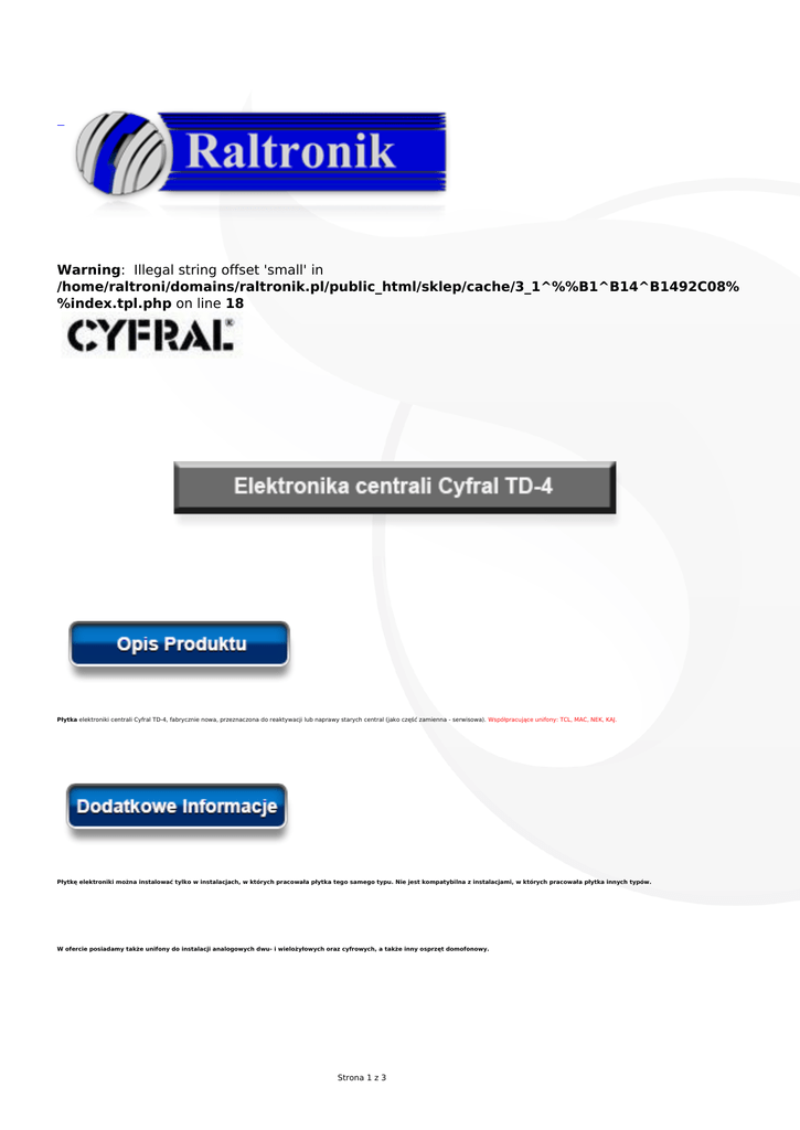 Warning: Illegal string offset 'small' in /home/raltroni/domains/raltronik.pl/public_html/sklep/cache/3_1^%%B1^B14^B1492C08% %index.tpl.php on line 18 Płytka elektroniki centrali Cyfral TD-4, fabrycznie nowa, przeznaczona do reaktywacji lub naprawy starych central (jako część zamienna - serwisowa). Współpracujące unifony: TCL, MAC, NEK, KAJ. Płytkę elektroniki można instalować tylko w instalacjach, w których pracowała płytka tego samego typu. Nie jest kompatybilna z instalacjami, w których pracowała płytka innych typów. W ofercie posiadamy także unifony do instalacji analogowych dwu- i wielożyłowych oraz cyfrowych, a także inny osprzęt domofonowy. Strona 1 z 3 Strona 2 z 3 Strona 3 z 3