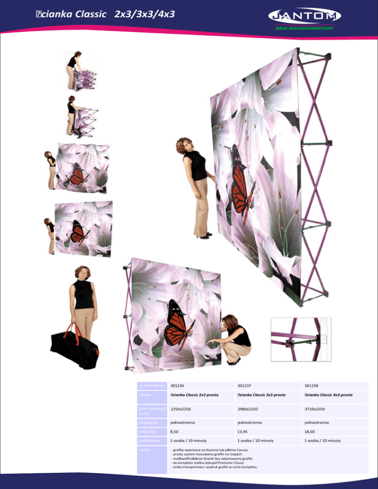 Ścianka Classic 2x3/3x3/4x3 nr katalogowy 301236 301237 301238 nazwa Ścianka Classic 2x3 prosta Ścianka Classic 3x3 prosta Ścianka Classic 4x3 prosta pole ekspozycji [mm] 2250x2250 2980x2250 3710x2250 ekspozycja jednostronna jednostronna jednostronna waga [kg] 8,50 13,95 18,60 rozkładanie 1 osoba / 10 minuty 1 osoba / 10 minuty 1 osoba / 10 minuty cechy - grafika wykonana na tkaninie lub płótnie Canvas. - prosty system mocowania grafiki na rzepach. - możliwość złożenie ścianki bez zdejmowania grafiki. - do kompletu można dokupić Promotor Classic - torba transportowa i wydruk grafiki w cenie kompletu.