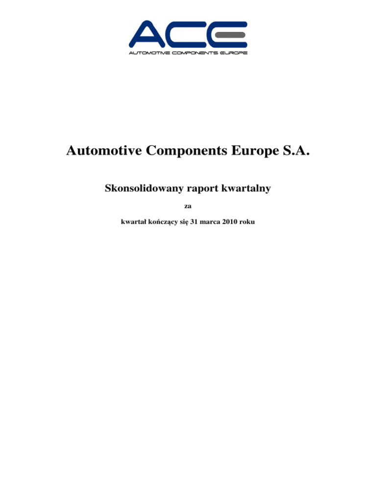 Automotive Components Europe S.A. Skonsolidowany raport kwartalny za kwartał kończący się 31 marca 2010 roku Automotive Components Europe S.A. Skrócony skonsolidowany raport kwartalny za I kwartał 2010 roku Spis treści: A. Sprawozdanie Zarządu 3 B. Skrócone skonsolidowane sprawozdanie finansowe na dzień 31 marca 2010 17 Skonsolidowany bilans 17 Skonsolidowany rachunek wyników 19 Skonsolidowane zestawienie zmian w kapitale własnym 19 Skonsolidowany rachunek przepływów pieniężnych 20 Noty do skróconego skonsolidowanego sprawozdania finansowego 21 2 Automotive Components Europe S.A. Skrócony skonsolidowany raport kwartalny za I kwartał 2010 roku A. Sprawozdanie Zarządu 1. Wprowadzenie ACE („Spółka”) jest spółką publiczną o ograniczonej odpowiedzialności (société anonyme) utworzoną i zarządzaną według prawa Luxemburskiego pod prawną i komercyjną nazwą Automotive Components Europe S.A. (w skróconej formie ACE S.A.). ACE jest zarejestrowany w rejestrze przedsiębiorców pod numerem B 118130 i posiada swoją siedzibę pod adresem 82 Route d’Arlon, L-1150 Luksemburg, Wielkie Księstwo Luksemburga. ACE jako spółka holdingowa posiada trzy spółki produkcyjne (Grupa): odlewnie żeliwa Fuchosa w Hiszpanii i Feramo (w którego skład wchodzą Feramo International oraz Feramo Trans) w Czechach oraz odlewnię aluminium EBCC w Polsce. ACE jest wyspecjalizowanym dostawcą dla europejskiego przemysłu motoryzacyjnego jako lider produkujący podzespoły układu hamulcowego i specjalizujący się w produkcji żeliwnych jarzm (element układu hamulcowego mocujący kompletny hamulec do korpusu) oraz zacisków aluminiowych (element układu hamulcowego, w którym montowane są klocki hamulcowe i cylinderki; w czasie hamowania odpowiedzialny za zamianę ciśnienia hydraulicznego na siłę hamowania). Podczas pierwszej oferty publiczne akcji (IPO), która miała miejsce w maju 2007 roku Spółka podwyższyła swój kapitał akcyjny z 20 050 100 akcji do 22 115 260 akcji. Na podstawie tego samego prospektu trzej dotychczasowi akcjonariusze ACE – Casting Brake, EB Holding oraz Halberg Holding sprzedali łącznie 10 423 316 akcji Spółki (minus akcje skupione w ramach opcji dodatkowego przydziału 319 389 czyli spółki te sprzedały 10 103 927 akcji Spółki). Pierwsze notowanie ACE na Warszawskiej Giełdzie Papierów Wartościowych odbyło się 1 czerwca 2007 roku. Uchwałą Nadzwyczajnego Walnego Zgromadzenia Akcjonariuszy w dniu 17 czerwca 2009 roku została podjęta decyzja w sprawie obniżenia kapitału akcyjnego Spółki o kwotę 132 711.75 euro, zmniejszając tym samym obecną kwotę 3 317 289 euro do kwoty 3 184 577.25 euro poprzez umorzenie 884 745 akcji o nominale 0,15 euro każda, w których posiadanie Spółka weszła w wyniku zakończonego programu skupu akcji zatwierdzonego przez Walne Zgromadzenie Akcjonariuszy Spółki, które odbyło się w dniu 17 czerwca 2008 roku. W wyniku powzięcia tej uchwały łączna liczba akcji pozostających w obrocie zmniejszyła się do 21 230 515. ACE jest zarządzane przez Radę Dyrektorów oraz Prezesa, któremu Rada powierzyła bieżące zarządzanie Spółką poza zagadnieniami które należą do kompetencji Rady. Prezes w swojej działalności jest wspierany przez Zarząd, w którego skład wchodzą menadżerowie wyższego szczebla, wybrani przez Radę. Skład organów zarządzających ACE na dzień 31 marca 2010 roku był następujący: Zarząd: Jose Manuel Corrales Raul Serrano Carlos Caba CEO Członek Zarządu, CFO Członek Zarządu, Dyrektor ds. Rozwoju Rada Dyrektorów Marek Adamiak Jose Manuel Corrales Raul Serrano Carlos Caba Oliver Schmeer Jerzy Szymczak Paweł Szymański Dyrektor klasy A Dyrektor klasy B Dyrektor klasy B Dyrektor Dyrektor Dyrektor Niezależny Dyrektor Niezależny Skrócone skonsolidowane sprawozdanie finansowe za pierwszy kwartał 2010 roku zostało przygotowane według Międzynarodowych Standardów Rachunkowości. 3 Automotive Components Europe S.A. Skrócony skonsolidowany raport kwartalny za I kwartał 2010 roku 2. Wybrane dane finansowe w tys. Euro Wybrane dane finansowe Przychody ze sprzedaży Zysk operacyjny Zysk przed opodatkowaniem Zysk Netto Zysk netto przypisany akcjonariuszom Spółki Przepływy pieniężne z działalności operacyjnej Przepływy pieniężne z działalności inwestycyjnej Przepływy pieniężne z działalności finansowej Przepływy pieniężne netto Aktywa bieżące Aktywa trwałe Aktywa ogółem Zobowiązania Zobowiązania długoterminowe Zobowiązania krótkoterminowe Kapitały własne Kapitały własne przypisane akcjonariuszom Spółki Kapitał akcyjny Liczba wyemitowanych akcji Zysk netto na akcję Wartość księgowa na akcję Za pierwszy kwartał od 1 stycznia do 31 marca 2010 roku 22 124 1 712 2 207 1 665 1 665 Za pierwszy kwartał od 1 stycznia do 31 marca 2009 roku 16 376 - 617 -4 244 -4 049 -4 049 1 051 -1 137 - 555 - 181 -1 308 -2 860 - 826 36 683 42 000 78 683 39 889 16 489 23 400 38 795 38 795 -4 178 27 330 46 552 73 882 43 291 20 957 22 335 30 591 30 591 3 185 21 230 515 0.08 1.83 3 317 22 115 260 -0.18 1.38 Za pierwszy kwartał od 1 stycznia do 31 marca 2010 roku 22 124 -17 161 4 962 Za pierwszy kwartał od 1 stycznia do 31 marca 2009 roku 16 376 -14 218 2 159 3. Wyniki finansowe Skonsolidowany rachunek wyników w tys. Euro Przychody ze sprzedaży Koszty wytworzenia Zysk na sprzedaży Rentowność na sprzedaży Koszty ogólne i admin. Zysk operacyjny Rentowność operacyjna Amortyzacja Zysk EBITDA Rentowność EBITDA Przychody finansowe Koszty finansowe Zysk przed opodatkowaniem Podatek Zysk netto Rentowność netto 4 22.4% 13.2% -3 251 1 712 -2 776 - 617 7.7% -3.8% -1 596 3 307 -1 443 825 14.9% 5.0% 778 - 282 2 207 - 542 1 665 105 -3 732 -4 244 195 -4 049 7.5% -24.7% Automotive Components Europe S.A. Skrócony skonsolidowany raport kwartalny za I kwartał 2010 roku Źródła przychodów ze sprzedaży Głównym źródłem przychodów ze sprzeda