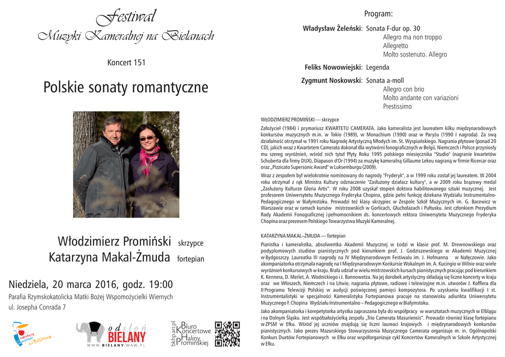 Festiwal Program: Muzyki Kameralnej na Bielanach Koncert 151 Władysław Żeleński: Sonata F-dur op. 30 Allegro ma non troppo Allegretto Molto sostenuto. Allegro Feliks Nowowiejski: Legenda Polskie sonaty romantyczne Zygmunt Noskowski: Sonata a-moll Allegro con brio Molto andante con variazioni Prestissimo WŁODZIMIERZ PROMIŃSKI — skrzypce Założyciel (1984) i prymariusz KWARTETU CAMERATA. Jako kameralista jest laureatem kilku międzynarodowych konkursów muzycznych m.in. w Tokio (1989), w Monachium (1990) oraz w Paryżu (1990 I nagroda). Za swą działalność otrzymał w 1991 roku Nagrodę Artystyczną Młodych im. St. Wyspiańskiego. Nagrania płytowe (ponad 20 CD), jakich wraz z Kwartetem Camerata dokonał dla wytwórni fonograficznych w Belgii, Niemczech i Polsce przyniosły mu szereg wyróżnień, wśród nich tytuł Płyty Roku 1995 polskiego miesięcznika "Studio" (nagranie kwartetów Schuberta dla firmy DUX), Diapason d'Or (1994) za muzykę kameralną Gillaume Lekeu nagraną w firmie Ricercar oraz oraz „Pizzicato Supersonic Award" w Luksemburgu (2009). Wraz z zespołem był wielokrotnie nominowany do nagrody "Fryderyk", a w 1999 roku został jej laureatem. W 2004 roku otrzymał z rąk Ministra Kultury odznaczenie "Zasłużony działacz kultury", a w 2009 roku brązowy medal „Zasłużony Kulturze Gloria Artis”. W roku 2008 uzyskał stopień doktora habilitowanego sztuki muzycznej. Jest profesorem Uniwersytetu Muzycznego Fryderyka Chopina, gdzie pełni funkcję dziekana Wydziału InstrumentalnoPedagogicznego w Białymstoku. Prowadzi też klasy skrzypiec w Zespole Szkół Muzycznych im. G. Bacewicz w Warszawie oraz w ramach kursów mistrzowskich w Gorlicach, Głuchołazach i Pułtusku. Jest członkiem Prezydium Rady Akademii Fonograficznej i pełnomocnikiem ds. koncertowych rektora Uniwersytetu Muzycznego Fryderyka Chopina oraz prezesem Polskiego Towarzystwa Muzyki Kameralnej. Włodzimierz Promiński Katarzyna Makal-Żmuda KATARZYNA MAKAL–ŻMUDA — fortepian skrzypce fortepian Niedziela, 20 marca 2016, godz. 19:00 bkhp.art.pl Parafia Rzymskokatolicka Matki Bożej Wspomożycielki Wiernych ul. Josepha Conrada 7 Pianistka i kameralistka, absolwentka Akademii Muzycznej w Łodzi w klasie prof. M. Drewnowskiego oraz podyplomowych studiów pianistycznych pod kierunkiem prof. J. Godziszewskiego w Akademii Muzycznej w Bydgoszczy. Laureatka III nagrody na IV Międzynarodowym Festiwalu im. J. Hofmanna w Nałęczowie. Jako akompaniatorka otrzymała nagrodę na I Międzynarodowym Konkursie Wokalnym im. A. Kucingio w Wilnie oraz wiele wyróżnień konkursowych w kraju. Brała udział w wielu mistrzowskich kursach pianistycznych pracując pod kierunkiem K. Kennera, D. Merlet, A. Wodnickiego i J. Bannowetza. Na jej dorobek artystyczny składają się liczne koncerty w kraju oraz we Włoszech, Niemczech i na Litwie, nagrania płytowe, radiowe i telewizyjne m.in. utworów J. Kofflera dla II Programu Telewizji Polskiej w audycji poświęconej pamięci kompozytora. Po uzyskaniu kwalifikacji I st. Instrumentalistyki w specjalności Kameralistyka Fortepianowa pracuje na stanowisku adiunkta Uniwersytetu Muzycznego F. Chopina Wydziału Instrumentalno – Pedagogicznego w Białymstoku. Jako akompaniatorka i korepetytorka artystka zapraszana była do współpracy w warsztatach muzycznych w Elblągu i na Dolnym Śląsku. Jest współzałożycielką zespołu „Trio Camerata Masuriensis”. Prowadzi również klasę fortepianu w ZPSM w Ełku. Wśród jej uczniów znajdują się liczni laureaci krajowych i międzynarodowych konkursów pianistycznych. Jako prezes Mazurskiego Stowarzyszenia Muzycznego Camerata organizuje m. in. Ogólnopolski Konkurs Duetów Fortepianowych w Ełku oraz współorganizuje cykl Koncertów Kameralnych w Szkole Artystycznej w Ełku.