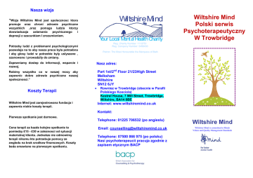 Nasza wizja Wiltshire Mind “Wizja Wiltshire Mind jest spolecznosc ktora promuje oraz chroni zdrowie psychiczne wszystkich ,oraz pomaga ludzia ktorzy doswiadczaja zalamania psychicznego i depresji z szacunkiem I zrozumieniem. Your Local Mental Health Charity Reg. Charity Number: 1113751 Reg. Company Number: 5498430 Potrzeby ludzi z problemami psychologicznymi pozwalaja na to aby nasza praca byla potrzebna i aby glosy ludzi w potrzebie byly uslyszane , szanowane i prowadzily do zmiany. Patron: The Most Honourable the Marquess of Bath Zapewniamy dostep do informacji, wsparcie i rozwoj. Nasz adres: Robimy wszystko co w naszej mocy aby zapewnic dobre zdrowie psychiczne naszej spolecznosci.” Koszty Terapii Wiltshire Mind jest zarejestrowana fundacja i zapewnia niskie koszty terapii. Wiltshire Mind Polski serwis Psychoterapeutyczny W Trowbridge Part 1st/2nd Floor 21/23High Street Melksham Wiltshire SN12 6JY Rowniez w Trowbridge (obecnie w Parafii Polskiego Kosciola) Kestrel House, 7 Mill Street, Trowbridge, Wiltshire, BA14 8BE Internet: www.wiltshiremind.co.uk Kontakt: Pierwsze spotkanie jest darmowe. Cena terapii za kazde kolejne spotkanie to pomiedzy £15 - £30 w zaleznosci od sytuacji materialnej klienta. Jednakze nie odmowimy terapii nikomu kto potrzebuje pomocy ze zwgledu na brak srodkow finansowych. Koszty beda omawiane na pierwszym spotkaniu. Telephone: 01225 706532 (po angieslu) Wiltshire Mind Email: [email protected] Wiltshire Mind is committed to Minds Values and Quality Management Standards Telephone: 07500 866 975 (po polsku) Nasi psychoterapeucii pracuja zgodnie z zapisem etycznym BACP Terapia pomaga w szerokim zakresie sytuacji zyciowych, tych z przeszlosci oraz tych terazniejszych.Terapia pomaga w zaglebieniu sie w emocje I uczucia aby pomodz zrozumiec zachowanie Twoich bliskich oraz Twoje wlasne. Wspolnie z Psychoterapeuta w zaufaniu bedziesz mogl/mogla przeanalizowac swoje strategie ktore pomagaja Ci przetrwac trudne sytuacje zyciowe, stres oraz: Zaloba Zlosc Zwiazki Brak motywacji Depresja Niepokoj/Strach Stres Brak wiary w siebie Emocje WILTSHIRE MIND Psychoterapia Zapewnia efektywna wspolprace ktora pomoze Ci w Twoich problemach ,zwlaszcza w trudnych chwilach Daje szanse na zebranie sil do znalezienia najlepszych rozwiazan zyciowych dla Ciebie Psychoterapia oferuje poufne spotkania , rozmowy w twarza w twarz Someone to listen to you in a non judgemental way Help to gain a new perspective on your difficulties Co dalej? Skontaktoj sie z naszym biurem: Biuro: 01225 706532 distress TwojaEmotional terapia moze skupic sie na “ Tu I Teraz” lub moze pomodz Ci zmierzyc sie z demonami Twojej przeszlosci lub dziecinstwa. Wszystko zalezy od Ciebie. Psychoterapeuta bedzie Cie wspieral we wszystkim z czym przyjdzie Ci sie zmierzyc. What we offer In confidentiality… Email: [email protected] lub 07500 866 975 (po polsku) A safe place to talk and express your feelings, confront change