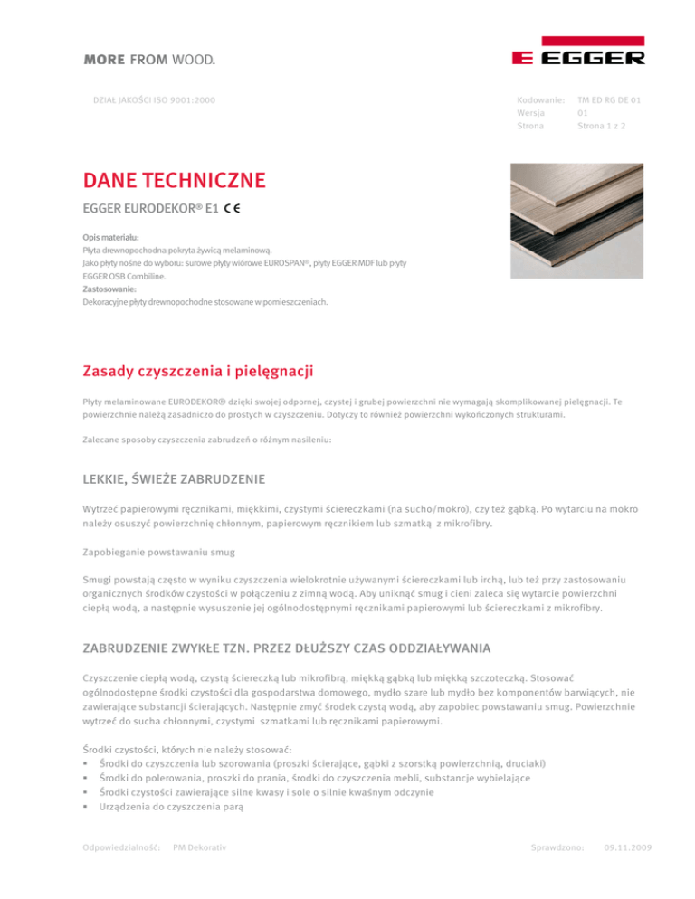 DZIAŁ JAKOŚCI ISO 9001:2000 Kodowanie: Wersja Strona TM ED RG DE 01 01 Strona 1 z 2 DANE TECHNICZNE EGGER EURODEKOR® E1 Opis materiału: Płyta drewnopochodna pokryta żywicą melaminową. Jako płyty nośne do wyboru: surowe płyty wiórowe EUROSPAN®, płyty EGGER MDF lub płyty EGGER OSB Combiline. Zastosowanie: Dekoracyjne płyty drewnopochodne stosowane w pomieszczeniach. Zasady czyszczenia i pielęgnacji Płyty melaminowane EURODEKOR® dzięki swojej odpornej, czystej i grubej powierzchni nie wymagają skomplikowanej pielęgnacji. Te powierzchnie należą zasadniczo do prostych w czyszczeniu. Dotyczy to również powierzchni wykończonych strukturami. Zalecane sposoby czyszczenia zabrudzeń o różnym nasileniu: LEKKIE, ŚWIEŻE ZABRUDZENIE Wytrzeć papierowymi ręcznikami, miękkimi, czystymi ściereczkami (na sucho/mokro), czy też gąbką. Po wytarciu na mokro należy osuszyć powierzchnię chłonnym, papierowym ręcznikiem lub szmatką z mikrofibry. Zapobieganie powstawaniu smug Smugi powstają często w wyniku czyszczenia wielokrotnie używanymi ściereczkami lub irchą, lub też przy zastosowaniu organicznych środków czystości w połączeniu z zimną wodą. Aby uniknąć smug i cieni zaleca się wytarcie powierzchni ciepłą wodą, a następnie wysuszenie jej ogólnodostępnymi ręcznikami papierowymi lub ściereczkami z mikrofibry. ZABRUDZENIE ZWYKŁE TZN. PRZEZ DŁUŻSZY CZAS ODDZIAŁYWANIA Czyszczenie ciepłą wodą, czystą ściereczką lub mikrofibrą, miękką gąbką lub miękką szczoteczką. Stosować ogólnodostępne środki czystości dla gospodarstwa domowego, mydło szare lub mydło bez komponentów barwiących, nie zawierające substancji ścierających. Następnie zmyć środek czystą wodą, aby zapobiec powstawaniu smug. Powierzchnie wytrzeć do sucha chłonnymi, czystymi szmatkami lub ręcznikami papierowymi. Środki czystości, których nie należy stosować: Środki do czyszczenia lub szorowania (proszki ścierające, gąbki z szorstką powierzchnią, druciaki) Środki do polerowania, proszki do prania, środki do czyszczenia mebli, substancje wybielające Środki czystości zawierające silne kwasy i sole o silnie kwaśnym odczynie Urządzenia do czyszczenia parą Odpowiedzialność: PM Dekorativ Sprawdzono: 09.11.2009 DZIAŁ JAKOŚCI ISO 9001:2000 Kodowanie: Wersja Strona TM ED RG DE 01 01 Strona 2 z 2 ZASADY PIELĘGNACJI I UŻYTKOWANIA POWIERZCHNI MATOWYCH ST9 Powierzchnie o matowych strukturach odwzorowują naturalne wrażenia wzrokowe i dotykowe. Powierzchnia przyjmuje tym samym charakter wzorca, drewnianej powierzchni zabezpieczonej olejem lub matowym lakierem. Podobnie, jak np.: przy powierzchniach w wysokim połysku bądź w przypadku powierzchni drewnianych, także przy powierzchniach matowych należy podczas użytkowania i zabiegów pielęgnacyjnych respektować kilka zasad. Praktycznie tak, jak w przypadku innych powierzchni z tworzywa, zwykłe zabrudzenia można usunąć bez większych problemów. Ważne jest przy tym, aby zawsze do czyszczenia stosować wyłącznie miękką ściereczkę, względnie w miarę możliwości wilgotną szmatkę. Absolutnie nie można używać silnych środków i proszków do czyszczenia, druciaków, środków do polerowania, proszków do prania, środków do czyszczenia mebli, substancji wybielających, środków czystości zawierających silne kwasy oraz urządzeń parowych! Zarówno te wyżej wymienione, jak i szorstkie ściereczki, czy też gąbki z chropowatą powierzchnią powodują w wyniku silnego tarcia lub ścierania nieodwracalne uszkodzenia powierzchni: ślady ścierania lub wybarwienia. Analogicznie należy możliwie szybko usunąć tłuste plamy, najpóźniej po 48 godzinach. Zbyt długi czas oddziaływania na powierzchnię może doprowadzić do jej uszkodzenia. ZASADY PIELĘGNACJI I UŻYTKOWANIA GŁĘBOKICH STRUKTUR ST22 Struktury o większej głębi jak np. ST22 sprawiają często wrażenie bardziej delikatnych i pracochłonnych w czyszczeniu. Jednakże, badania laboratoryjne wykazały, iż właściwości tej struktury odpowiadają parametrom innych powierzchni płyt melaminowanych EURODEKOR®. W szczególności odporność na zarysowania w przypadku struktury ST22 jest wyraźnie lepsza aniżeli innych struktur obecnych na rynku. Czyszczenie powinno być wykonywane zgodnie z kierunkiem struktury powierzchni. Wszystkie wcześniej wymienione wskazówki można również zastosować dla struktury ST22. Przytoczone wyżej wyniki testów laboratoryjnych potwierdzają ponadto pozytywne doświadczenia w zakresie zastosowania struktury ST22 na frontach kuchennych. Także w kombinacji z jasnymi dekorami czyszczenie przy zachowaniu wymienionych zaleceń jest bezproblemowe. INFORMACJA O TYMCZASOWOŚCI Powyższe dane techniczne zostały przygotowane w oparciu o najlepszą wiedzę i ze szczególną starannością. Nie bierzemy odpowiedzialności za błędy w druku, błędy w normach i pomyłki. Ponadto wskutek ciągłego rozwoju produktu EGGER EURODEKOR®, oraz zmian w normach i dokumentach prawa publicznego mogą wynikać techniczne zmiany. Z tego względu treść niniejszego dokumentu nie może służyć jako instrukcja obsługi ani prawnie wiążący dokument. Odpowiedzialność: PM Dekorativ Sprawdzono: 09.11.2009