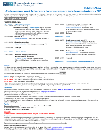 KONFERENCJA „Postępowanie przed Trybunałem Konstytucyjnym w świetle nowej ustawy o TK” Komisja Doskonalenia Zawodowego Okręgowej Izby Radców Prawnych w Warszawie zaprasza do udziału w ODPŁATNEJ KONFERENCJI, która odbędzie się w Centrum Konferencyjno-Szkoleniowym OIRP w Warszawie przy ul. Żytniej 15 lok.16, I piętro, w dniu 17 listopada 2015 r. PROGRAM SZKOLENIA: 9:30 – 10:00 10:00 – 10:10 Rejestracja uczestników Otwarcie konferencji Moderator konferencji - Jerzy Stępień - Sędzia Trybunału Konstytucyjnego w stanie spoczynku, Prezes Trybunału Konstytucyjnego w latach 2006–2008, autor licznych publikacji z zakresu administracji publicznej, prawa wyborczego, prawa konstytucyjnego 10:10 – 10:45 Wniosek do TK dr Marcin Stębelski - WPiA UW, asystent sędziego TK 12:35 – 13:10 13:10 – 13:30 Pytanie prawne sądu. Wniosek strony o skierowanie pytania prawnego dr hab. Marcin Wiącek - WPiA UW, Biuro orzecznictwa NSA, członek Rady Legislacyjnej przy Prezesie Rady Ministrów Dyskusja 13:30 – 14.00 Lunch 14:00 – 14:35 Zasady postępowania przed TK dr Marzena Laskowska - Naczelnik Wydziału Postępowań przed Trybunałem Konstytucyjnym Biura Analiz Sejmowych, Instytut Nauk Prawnych Polskiej Akademii Nauk 10:45 – 11:20 Skarga konstytucyjna dr Jan Podkowik - WPiA UJ, asystent sędziego TK 11:20 – 11:40 Dyskusja 11:40 – 12:00 Przerwa kawowa 14:35 – 15.10 12:00 – 12:35 Procedura wstępnej kontroli skarg konstytucyjnych i wniosków dr Witold Płowiec - WPiA Uniwersytetu im. Adama Mickiewicza w Poznaniu, asystent sędziego TK Skutki prawne wyroków TK Michał Ziółkowski - Instytut Nauk Prawnych Polskiej Akademii Nauk, asystent sędziego TK 15:10 - 15.30 Dyskusja 15:30 – 16.00 Podsumowanie i zakończenie Konferencji UWAGA: Powyższy program stanowi średniozaawansowany poziom wykładu – uczestnicy znają w podstawowym zakresie przepisy prawa oraz instytucje prawne, znają również podstawową praktykę, jednakże mogą mieć wątpliwości i wymagają potwierdzenia swojej wiedzy; nie znają orzecznictwa sądowego w dziedzinie szkolenia Ilość punktów przyznawanych w zakresie obowiązku doskonalenia radców prawnych: 13 pkt. Opłaty: Opłata za uczestnictwo w konferencji wynosi: 290,-zł netto* - dla radców prawnych i aplikantów z OIRP w Warszawie 490,-zł netto* - dla radców prawnych i aplikantów spoza OIRP w Warszawie 599,-zł netto* - dla pozostałych uczestników *- jeżeli uczestnikiem szkolenia jest osoba nie wpisana na listę radców prawnych OIRP - usługa jest opodatkowana podatkiem VAT w wysokości 23% - jeżeli uczestnikiem szkolenia jest radca prawny wpisany na listę OIRP - usługa podlega zwolnieniu z podatku VAT Zgłoszenia Zgłoszenia dokonują Państwo poprzez zapis elektroniczny dostępny na stronie www.oirpwarszawa.pl w zakładce „Doskonalenie zawodowe” / ”Szkolenia stacjonarne” lub bezpośrednio pod adresem https://ro.oirp.waw.pl W powyższej zakładce znajdą Państwo również program szkolenia. Zgłoszenie uznane jest za skuteczne, jeśli: 1) zostanie złożone poprzez formularz elektroniczny zamieszczony na stronie (pomarańczowy przycisk "zarejestruj się") 2) załączona jest do niego kopia przelewu o wymaganym tytule wpłaty 3) w przypadku podmiotów korzystających ze zwolnienia od podatku od towarów i usług, jeśli zostanie załączone oświadczenie o finansowaniu ze środków publicznych. Wpłaty Wymagany tytuł wpłaty : imię i nazwisko oraz data szkolenia 17-11-2015 r. Nr rachunku bankowego: Deutsche Bank PBC S.A. nr: 58 1910 1048 2788 0250 0267 0005 UWAGA! Uczestnictwo w szkoleniu jest możliwe jedynie po opłaceniu szkolenia. Rezygnacja Rezygnacja z udziału w szkoleniu (potwierdzona na piśmie) jest możliwa najpóźniej 14 dni przed jego rozpoczęciem. Rezygnacja późniejsza, ale nie później niż 7 dni przed szkoleniem powoduje konieczność wpłaty 15% kosztów udziału tytułem kosztów organizacyjnych. Rezygnacja po tym terminie, bez względu na jej przyczynę, powoduje powstanie zobowiązania pokrycia pełnych kosztów udziału. Organizator zastrzega sobie prawo zamknięcia listy uczestników w momencie wyczerpania miejsc. Informacji o konferencji udzielają: Krystyna Ostrowska, pod numerem telefonu 862 41 69 wew. 136, e-mail: [email protected] Paulina Zając, pod numerem telefonu 862 41 69 wew. 116, e-mail: [email protected]