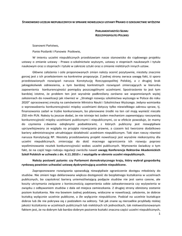 STANOWISKO UCZELNI NIEPUBLICZNYCH W SPRAWIE NOWELIZACJI USTAWY PRAWO O SZKOLNICTWIE WYŻSZYM PARLAMENTARZYŚCI SEJMU RZECZYPOSPOLITEJ POLSKIEJ Szanowni Państwo, Panie Posłanki i Panowie Posłowie, W imieniu uczelni niepublicznych przedstawiam nasze stanowisko do rządowego projektu ustawy o zmianie ustawy - Prawo o szkolnictwie wyższym, ustawy o stopniach naukowych i tytule naukowym oraz o stopniach i tytule w zakresie sztuki oraz o zmianie niektórych innych ustaw. Główne założenia i cele proponowanych zmian należy ocenić pozytywnie, niestety znacznie gorzej jest z ich przełożeniem na konkretne propozycje. Z jednej strony zwraca uwagę fakt, iż sporo przedstawionych rozwiązań narusza Konstytucję Rzeczypospolitej Polskiej, a z drugiej brak jakiegokolwiek odniesienia, a tym bardziej konkretnych rozwiązań zmierzających w kierunku zapewnienia konkurencyjności pomiędzy poszczególnymi uczelniami. Spostrzeżenie to jest tym bardziej istotne, że problem ten jest wyraźnie podkreślany zarówno we wspomnianych wyżej założeniach do nowelizacji jak również w „Strategii rozwoju szkolnictwa wyższego w Polsce do roku 2020” opracowanej zresztą na zamówienie Ministra Nauki i Szkolnictwa Wyższego. Jedyna wzmianka o wprowadzeniu konkurencyjności między uczelniami dotyczy tylko niewielkiego zakresu spraw, tj. finansowania zadań w trybie konkursowym, bo planowane środki na ten cel mają wynieść niecałe 250 mln PLN. Należy tu jeszcze dodać, że nie istnieje też żaden mechanizm zapewniający rzeczywistą konkurencyjność między uczelniami publicznymi i niepublicznymi, co w efekcie powoduje, że mamy do czynienia z dwoma odrębnymi podsektorami, z których publiczny jest niewątpliwie uprzywilejowany ze względu na przyjęte rozwiązania prawne, a czasem też tworzone dodatkowo bariery administracyjne utrudniające działalność uczelniom niepublicznym. Taki stan rzeczy również narusza Konstytucję RP. Niestety przedstawiony projekt nowelizacji jest wyraźnie niekorzystny dla uczelni niepublicznych, zmierzając do dość mocnego ograniczenia ich rozwoju poprzez wyeliminowanie resztek konkurencyjności wobec uczelni publicznych. Wymownie świadczy o tym fakt, że na część tego rodzaju regulacji zwróciła nawet uwagę Konferencja Rektorów Akademickich Szkół Polskich w uchwale z dn. 4.11.2010 r. i wystąpiła w obronie uczelni niepublicznych. Należy postawić pytanie: czy Parlament demokratycznego kraju, który wybrał gospodarkę rynkową powinien uchwalać ustawę dyskryminującą uczelnie niepubliczne. Zaproponowane rozwiązania spowodują niewątpliwie ograniczenie dostępu młodzieży do studiów. Nie zmieni tego deklarowana większa dostępność do bezpłatnego kształcenia w uczelniach publicznych, bo częstokroć barierą uniemożliwiającą podjęcie studiów nie jest samo czesne, ale koszty utrzymania związane z koniecznością zapewnienia sobie zakwaterowania czy wyżywienia w związku z odbywaniem studiów z dala od miejsca zamieszkania. Z drugiej strony obniżony zostanie poziom kształcenia. Nie ma bowiem żadnej podstawy, widoczne w nowelizacji, założenie, że dobrze kształcą wyłącznie uczelnie publiczne, a źle wyłącznie niepubliczne. Podział na uczelnie kształcące dobrze lub źle nie pokrywa się z podziałem na sektory. Tak jak znane są nierzadkie przykłady niskiej jakości kształcenia w uczelniach publicznych lub niektórych ich jednostkach, tak niekwestionowanym faktem jest, że na dobrym lub bardzo dobrym poziomie kształci znaczna części uczelni niepublicznych, 1 co potwierdzają zarówno oceny PKA jak i ogólnopolskie rankingi szkół wyższych. To właśnie uczelnie kształcące dobrze lub bardzo dobrze powinny być wspierane przez władze publiczne bez względu na to, do którego sektora należą. Wszystkie te stwierdzenia dają podstawy do wniosku, iż przedstawiona nowelizacja wymaga gruntownej korekty. Zakres koniecznych zmian: Prawo do nauki, zaliczane jest do grupy praw socjalnych i ekonomicznych. Zagwarantowane jest wprost m.in. w Powszechnej Deklaracji Praw Człowieka, Deklaracji Podstawowych Praw i Wolności oraz w Międzynarodowym Pakcie Praw Gospodarczych, Społecznych i Kulturalnych. W Polsce prawo do nauki gwarantuje art. 70 Konstytucji RP. Z przepisu tego wynika przede wszystkim, że władza publiczna ma zapewnić obywatelom powszechny i równy dostęp do wykształcenia. Zasada ta obowiązuje przy tym w jednakowym kształcie na wszystkich szczeblach kształcenia od podstawowego do wyższego. W samej Konstytucji przewidziano kilka mechanizmów, które mają te wymagania realizować. Wymienić tu należy system indywidualnej pomocy finansowej i organizacyjnej dla uczniów i studentów, czy bezpłatną naukę w uczelniach publicznych. Kolejnym elementem realizacji prawa do nauki jest możliwość wyboru przez dzieci i młodzież (do osiągnięcia pełnoletniości - przez ich rodziców) nauki w szkołach niepublicznych. Kształcenie prowadzone przez szkoły niepubliczne nie jest więc prowadzeniem działalności gospodarczej, ale specyficznym sposobem realizowania zadania publicznego polegającego na umożliwieniu korzystania z prawa do nauki. Konsekwencją wyboru modelu realizacji prawa do nauki jest nałożenie na władze publiczne obowiązku udziału w finansowaniu szkół niepublicznych. Podkreślić trzeba, że obowiązek ten w Polsce jest od kilku lat realizowany na niższych poziomach kształcenia (do poziomu policealnego włącznie). Skoro więc przyjęto w Konstytucji model, zgodnie z którym prawo do nauki ma być realizowane zarówno w sektorze publicznym jak i niepublicznym, to tym samym władze publiczne mają obowiązek stanowienia takich przepisów, które w równym stopniu zapewnią rozwój obu sektorów. W konsekwencji w każdym obszarze, gdzie tylko jest to możliwe uczelnie publiczne i niepubliczne powinny być traktowane w sposób jednakowy. Oznacza to, że powinien być stworzony sy