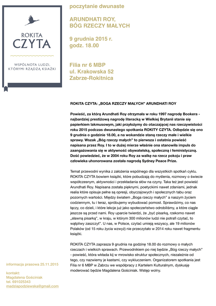 poczytanie dwunaste! ! ARUNDHATI ROY,! BÓG RZECZY MAŁYCH! ! 9 grudnia 2015 r.! godz. 18.00! ! ! Filia nr 6 MBP ! ul. Krakowska 52! Zabrze-Rokitnica! ! ROKITA CZYTA: „BOGA RZECZY MAŁYCH” ARUNDHATI ROY ! Powieść, za którą Arundhati Roy otrzymała w roku 1997 nagrodę Bookera najbardziej prestiżową nagrodę literacką w Wielkiej Brytanii stanie się papierkiem lakmusowym, jaki przyłożymy do otaczającej nas rzeczywistości roku 2015 podczas dwunastego spotkania ROKITY CZYTA. Odbędzie się ono 9 grudnia o godzinie 18.00, a na wokandzie staną rzeczy małe i wielkie sprawy. Wszak „Bóg rzeczy małych” to pierwsza i ostatnia powieść napisana przez Roy. I to w dużej mierze właśnie ona stanowiła impuls do zaangażowania się w aktywność obywatelską, społeczną i feministyczną. Dość powiedzieć, że w 2004 roku Roy za walkę na rzecz pokoju i praw człowieka uhonorowana została nagrodą Sydney Peace Prize. ! Temat przewodni wynika z założenia wspólnego dla wszystkich spotkań cyklu. ROKITA CZYTA bowiem książki, które pobudzają do myślenia, rozmowy o świecie współczesnym, aktywności i przekładania słów na czyny. Taka też jest powieść Arundhati Roy. Napisana została pięknymi, poetyckimi nawet zdaniami, jednak realia które opisuje pełne są opresji, obyczajowych i społecznych tabu oraz pozornych wartości. Między światem „Boga rzeczy małych” a naszym życiem codziennym, tu i teraz, spróbujemy wybudować pomost. Sprawdzimy, co nas łączy, co dzieli, i które lekcje już jako społeczeństwo odrobiliśmy, a które ciągle jeszcze są przed nami. Roy uparcie twierdzi, że „być pisarką, rzekomo nawet „sławną pisarką”, w kraju, w którym 300 milionów ludzi nie potrafi czytać, to wątpliwy zaszczyt”. U nas, w Polsce, czytać umieją wszyscy, ale 19 milionów Polaków (od 15 roku życia wzwyż) nie przeczytało w 2014 roku nawet fragmentu książki. ! !! ! informacja prasowa 25.11.2015 kontakt: Magdalena Gościniak tel. 691025343 [email protected] ROKITA CZYTA zaprasza 9 grudnia na godzinę 18.00 do rozmowy o małych rzeczach i wielkich sprawach. Przewodnikiem po niej będzie „Bóg rzeczy małych” - powieść, która wkłada kij w mrowisko struktur społecznych, niezależnie od tego, czy nazwiemy je kastami, czy wykluczeniem. Organizatorem spotkania jest Filia nr 6 MBP w Zabrzu we współpracy z Kartelem Kulturalnym, dyskusję moderować będzie Magdalena Gościniak. Wstęp wolny.