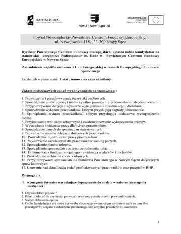 Powiat Nowosądecki- Powiatowe Centrum Funduszy Europejskich ul. Nawojowska 118, 33-300 Nowy Sącz Dyrektor Powiatowego Centrum Funduszy Europejskich ogłasza nabór kandydatów na stanowisko urzędnicze Podinspektor ds. kadr w Powiatowym Centrum Funduszy Europejskich w Nowym Sączu Zatrudnienie współfinansowane z Unii Europejskiej w ramach Europejskiego Funduszu Społecznego Liczba lub wymiar etatu: 1 etat , umowa na czas określony Zakres podstawowych zadań wykonywanych na stanowisku : 1. Prowadzenie i przechowywanie teczek akt osobowych. 2. Sporządzanie umów o pracę i umów cywilno prawnych z pracownikami/ zleceniobiorcami 3. Przygotowywanie decyzji o wymiarze wynagrodzenia zasadniczego i dodatków. 4. Sporządzanie wykazów pracowników, którym przysługują nagrody jubileuszowe. 5. Sporządzanie wykazu pracowników, którym przysługuje dodatkowe wynagrodzenie roczne. 6. Przyjmowanie wniosków urlopowych i ewidencjonowanie wykorzystania urlopów. 7. Wystawianie świadectw pracy dla byłych pracowników. 8. Sporządzanie danych do sprawozdań statystycznych. 9. Prowadzenie rejestru delegacji służbowych pracowników. 10. Prowadzenie rejestru czasu pracy pracowników. 11. Wystawianie zaświadczeń dla pracowników według potrzeb. 12. Sporządzanie planów urlopów. 13. Sporządzanie sprawozdań z zakresu zatrudnienia i płac. 14. Dokumentacja funduszu socjalnego - ewidencja wydatków i dochodów. 15. Prowadzenie archiwum spraw kadrowych. 16. Przygotowywanie sprawozdań dla Starostwa Powiatowego w Nowym Sączu dotyczących spraw kadrowych. 17. Czuwanie nad aktualizacją badań profilaktycznych pracowników oraz przepisów BHP. Wymagania: I. wymagania formalne warunkujące dopuszczenie do udziału w naborze (wymagania niezbędne) : 1. Obywatelstwo polskie,* 2. Pełna zdolność do czynności prawnych oraz korzystanie z pełni praw publicznych, 3. Nieposzlakowana opinia, 4. Osoba kandydująca nie może być osobą skazaną prawomocnym wyrokiem sądu za umyślne przestępstwo ścigane z oskarżenia publicznego lub umyślne przestępstwo skarbowe, 1 5. Wykształcenie wyższe. Preferowane wykształcenie: prawo, prawo administracyjne, prawo pracy, zarządzanie zasobami ludzkimi 6. Doświadczenie zawodowe: min. 1 rok stażu pracy na stanowisku związanym z obsługą kadrowo-organizacyjną II. Wymagania dodatkowe (będące przedmiotem oceny): 1. Znajomość przepisów: - Kodeks Pracy - Ustawa o ochronie danych osobowych - Ustawa o systemie ubezpieczeń społecznych - Pozostałe przepisy prawa wymagane na stanowisku 2. Umiejętność: pracy w zespole, posiadanie prawa jazdy Kat. B 3. Znajomość programów komputerowych: Excel i Word, poczty elektronicznej i Internetu. Mile widziane orzeczenie o stopniu niepełnosprawności (nie wykluczające wykonywania obowiązków na wskazanym stanowisku). * UWAGA: O stanowisko mogą ubiegać się poza obywatelami polskimi także obywatele Unii Europejskiej oraz obywatele innych państw, którym na podstawie umów międzynarodowych lub przepisów prawa wspólnotowego przysługuje prawo do podjęcia zatrudnienia na terytorium Rzeczypospolitej Polskiej, jeżeli posiadają znajomość języka polskiego potwierdzoną dokumentem określonym w przepisach o służbie cywilnej. Wymagane dokumenty i oświadczenia: 1. 2. 3. 4. 5. 6. Kwestionariusz osobowy (wzór proszę pobrać z Biuletynu Informacji Publicznej Starostwa, www.starostwo.nowy-sacz.pl, wzór zamieszczony został w zakładce „Praca w Starostwie – Wprowadzenie), Oświadczenie o posiadaniu pełnej zdolności do czynności prawnych, Oświadczenie o korzystaniu z pełni praw publicznych, Dla potrzeb rekrutacji: oświadczenie, że kandydat (kandydatka) nie był skazany prawomocnym wyrokiem sądu za umyślne przestępstwo ścigane z oskarżenia publicznego lub umyślne przestępstwo skarbowe (po zakończeniu rekrutacji osoba, z którą ma zostać nawiązany stosunek pracy obowiązana jest przedłożyć odpowiednią informację z Krajowego Rejestru Karnego (informacje wydaje m.in. Punkt Informacyjny Krajowego Rejestru Karnego przy Sądzie Okręgowym w Nowym Sączu, ul. Pijarska 3, opłata sądowa za wydanie informacji wynosi 50 zł), Kopie dokumentów potwierdzających wykształcenie, Kopie dokumentów potwierdzających doświadczenie zawodowe /jeżeli dotyczy/. W przypadku przedstawienia dokumentów w języku obcym należy dołączyć również ich tłumaczenie na język polski dokonane przez tłumacza przysięgłego. Dokumenty należy składać w terminie do dnia 17.12.2010 r. (włącznie) w siedzibie Powiatowego Centrum Funduszy Europejskich w Nowym Sączu, ul. Nawojowska 118 – na dziennik podawczy 113 lub przesłać pocztą z dopiskiem na kopercie : „Oferta zatrudnienia 2 na stanowisku ds. …” pod adresem: Powiatowe Centrum Funduszy Europejskich w Nowym Sączu, ul. Nawojowska 118, 33-300 Nowy Sącz. Zgłoszenia, które wpłyną do Powiatowego Centrum Funduszy Europejskich w Nowym Sączu po upływie wyżej wymienionego terminu nie będą rozpatrywane. Inne informacje: 1. Informacja o kandydatach , którzy zgłosili się do naboru oraz informacja o wyniku naboru zostaną umieszczone na stronie internetowej Starostwa Powiatowego – w Biuletynie Informacji Publicznej oraz na tablicy informacyjnej Powiatowego Centrum Funduszy Europejskich w Nowym Sączu 2. W ciągu 7 dni od dnia upływu terminu do składania dokumentów kandydaci spełniający wymagania formalne określone w ogłoszeniu w naborze zostaną powiadomieni o terminie przeprowadzenia rozmowy kwalifikacyjnej (lub innych metod selekcji, wybranych przez Komisję Rekrutacyjną). Osoby te proszone są o zabranie ze sobą dowodu osobistego. 3. Dokumentacja złożona przez kandydatów, którzy nie spełnili wymagań warunkujących dopuszczenie do udziału w naborze zostanie komisyjnie zniszczona. 4. Po zakończeniu procesu naboru dokumenty złożone przez osoby, które nie zostaną zatrudnione (lub nie zostaną włączone do rezerwy kadro