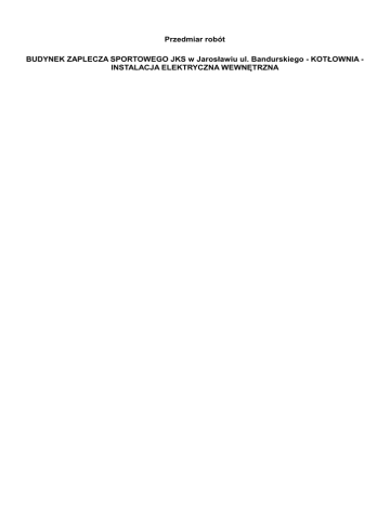 Przedmiar robót BUDYNEK ZAPLECZA SPORTOWEGO JKS w Jarosławiu ul. Bandurskiego - KOTŁOWNIA INSTALACJA ELEKTRYCZNA WEWNĘTRZNA Kosztorys JKS Kotłownia Zuzia10 (C) Datacomp 1994-2012(lic. 856) strona nr: 2 Przedmiar robót Nr Podstawa <!--TAG#PRZDM#PODST--!> Opis robót Jm Kosztorys BUDYNEK ZAPLECZA SPORTOWEGO JKS w Jarosławiu ul. Bandurskiego KOTŁOWNIA - INSTALACJA ELEKTRYCZNA WEWNĘTRZNA 1 Element Demontaż 1.1 1.2 1.3 KNNR 9/201/5 KNNR 9/203/5 KNNR 9/303/5 1.4 1.5 KNNR 9/501/6 KNNR 9/403/9 1.6 2 KNNR 9/401/7 Element Tablice rozdzielcze i obudowy, demontaż tablicy, powierzchnia do 0,5·m2 Aparaty elektryczne, masa do 2.5·kg, demontaż Przewody izolowane jednożyłowe wciągane w rury instalacyjne, demontaż przewodu, przekrój do 35·mm2 Oprawy oświetleniowe zawieszane, przykręcane, demontaż oprawy świetlówkowej z kloszem Puszki i odgałęźniki instalacyjne, demontaż puszki lub odgałęźnika uszczelnionych z tworzyw sztucznych lub metalowych Łączniki instalacyjne, demontaż łącznika nieuszczelnionego podtynkowego lub natynkowego 2.1 2.2 2.3 2.4 2.5 2.6 KNNR 5/401/1 Złącza kablowe i urządzenia samoczynnego załączania rezerwy, ZK1a 200A - analogia ZL-1 KNNR 5/401/1 Złącza kablowe i urządzenia samoczynnego załączania rezerwy, ZK1a 200A - analogia Wył. ppoż RA160 KNNR 5/404/1 Tablice rozdzielcze i obudowy, tablica do 10·kg - Rozdzielnica TB-1 KNNR 5/404/1 Tablice rozdzielcze i obudowy, tablica do 10·kg - Rozdzielnica RBK KNNR 5/404/1 Tablice rozdzielcze i obudowy, tablica do 10·kg - wyłącznik WK KNNR 5/1209/6 Przebijanie otworów w ścianach lub stropach, w cegle, długość przebicia do 1+1/2 cegły, Fi·40·mm (2) KNNR Wykucie bruzd dla przewodów wtynkowych i rur o średnicy do 47·mm, bruzdy dla rur RS47, w cegle 5/1207/15 KNNR 5/1208/2 Zaprawianie bruzd, bruzda szerokości do 50·mm KNNR 5/1208/5 Zaprawianie bruzd, przygotowanie ręczne zaprawy cementowo-wapiennej Wyliczenie ilości robót: 8*0,3*0,5 1,200000 RAZEM: 1,200000 KNNR 5/102/8 Rury winidurowe karbowane (giętkie) układane p.t. w gotowych bruzdach, podłoże inne niż betonowe, do Fi 36·mm KNNR 5/203/8 Przewody kabelkowe wciągane do rur i w kanały zamknięte, kanały, przekrój do 50·mm2 YDY (YKY) 5x10 KNNR 5/103/6 Rury winidurowe układane n.t., podłoże inne niż betonowe, Fi·28 (4) KNNR 5/203/7 Przewody kabelkowe wciągane do rur i w kanały zamknięte, kanały, przekrój do 30·mm2 KNNR 5/1204/2 Montaż końcówek kablowych, zaciskanie, przekrój żył do 16·mm2 KNNR 5/1204/1 Montaż końcówek kablowych, zaciskanie, przekrój żył do 6·mm2 KNNR Podłączenie przewodów pod zaciski lub bolce, przewód kabelkowy do 6·mm2 5/1203/10 KNNR 5/1203/11 Podłączenie przewodów pod zaciski lub bolce, przewód kabelkowy do 16·mm2 KNNR 5/1208/1 Zaprawianie bruzd, bruzda szerokości do 25·mm KNNR 5/1207/5 Wykucie bruzd dla przewodów wtynkowych i rur o średnicy do 47·mm, bruzdy dla rur RKLG18, RS22, w cegle KNNR 5/203/1 Przewody kabelkowe wciągane do rur i w kanały zamknięte, rury, przekrój do 7,5·mm2 YDY 4x1,5 KNNR 5/203/1 Przewody kabelkowe wciągane do rur i w kanały zamknięte, rury, przekrój do 7,5·mm2 YDY 3x2,5 KNNR 5/110/5 Listwy elektroinstalacyjne z PVC (naścienne, przypodłogowe i ścienne), przykręcane na betonie korytko KPR100 KNNR 5/209/1 Przewody kabelkowe układane w gotowych korytkach i na drabinkach, bez mocowania, przekrój do 7,5·mm2 YLY 3x1,5 mm2 KNNR 5/209/1 Przewody kabelkowe układane w gotowych korytkach i na drabinkach, bez mocowania, przekrój do 7,5·mm2 YLY 4x1,5 mm2 KNNR 5/209/1 Przewody kabelkowe układane w gotowych korytkach i na drabinkach, bez mocowania, przekrój do 7,5·mm2 YLY 5x1,5 mm2 KNNR 5/502/3 Oprawy oświetleniowe przykręcane (zwykłe), świetlówkowe podwójne, do 40·W - OPK 236 KNNR 5/406/1 Aparaty elektryczne, masa do 2,5·kg - Inwertor KNNR 5/502/1 Oprawy oświetleniowe przykręcane (zwykłe), żarowe, bez klosza typ B (1) 2.7 2.8 2.9 2.10 2.11 2.12 2.13 2.14 2.15 2.16 2.17 2.18 2.19 2.20 2.21 2.22 2.23 2.24 2.25 2.26 2.27 2.28 Ilość szt szt 1 15 m szt 260 5 szt szt 5 4 kpl kpl kpl kpl kpl 1 1 1 1 1 otwór 6 m m 8 8 Instalacja kotłowni m3 1,200 m m 8 8 m m szt szt 75 75 30 10 szt szt m 2 30 150 m m m 150 140 10 m 25 m 125 m 24 m kpl szt 65 7 4 kpl 1 BUDYNEK ZAPLECZA SPORTOWEGO JKS w Jarosławiu ul. Bandurskiego - KOTŁOWNIA INSTALACJA ELEKTRYCZNA WEWNĘTRZNA Kosztorys JKS Kotłownia <!--TAG#PRZDM#PODST--!> Nr Podstawa 2.29 KNNR 5/307/1 (1) 2.30 KNNR 5/304/4 2.31 KNNR 5/308/1 Zuzia10 (C) Datacomp 1994-2012(lic. 856) strona nr: 3 Opis robót Jm Ilość Łącznik klawiszowy bryzgoodporny 1-biegunowy 6A 250V nf.430 Odgałęźniki bryzgoszczelne z tworzywa sztucznego, przykręcane, 4 wyloty Gniazda instalacyjne wtyczkowe ze stykiem ochronnym, pt, 2-biegunowe 10A 2,5·mm2 końcowe gniazdo 230V szczelne 2.32 KNNR 5/308/1 Gniazda instalacyjne wtyczkowe ze stykiem ochronnym, pt, 2-biegunowe 10A 2,5·mm2 końcowe gniazdo 24V 2.33 KNNR 5/602/2 Przewody uziemiające i wyrównawcze w budynkach, przewód mocowany na wspornikach ściennych, na podłożu innym niż drewno 2.34 KNNR 5/1304/2 Badania i pomiary instalacji uziemiającej, piorunochronnej i skuteczności zerowania, uziemienie ochronne lub robocze, pomiar każdy następny 2.35 KNNR 5/1303/2 Pomiar rezystancji izolacji instalacji elektrycznej, obwód 1-fazowy, pomiar każdy następny 2.36 KNNR 5/1303/4 Pomiar rezystancji izolacji instalacji elektrycznej, obwód 3-fazowy, pomiar każdy następny szt szt 4 10 szt 1 szt 1 m 20 szt pomiar pomiar 11 7 2 Zestawienie materiałów Lp. 1. 2. 3. 4. 5. 6. 7. 8. 9. 10. 11. 12. 13. 14. 15. 16. 17. 18. 19. 20. 21. 22. 23. 24. 25. 26. 27. 28. 29. 30. 31. 32. 33. 34. 35. 36. Nazwa materiału Bednarka ocynkowana Cement portlandzki CEM I bez dodatków Gniazdo wtyczkowe 24V, szczelne Gniazdo wtyczkowe 2P+Z 10/16A 250V, szczelne Inwertor 3h + auto-test Kołek rozporowy Kołki rozporowe plastykowe Końcówka kablowa rurkowa K, do zaprasowania na ży