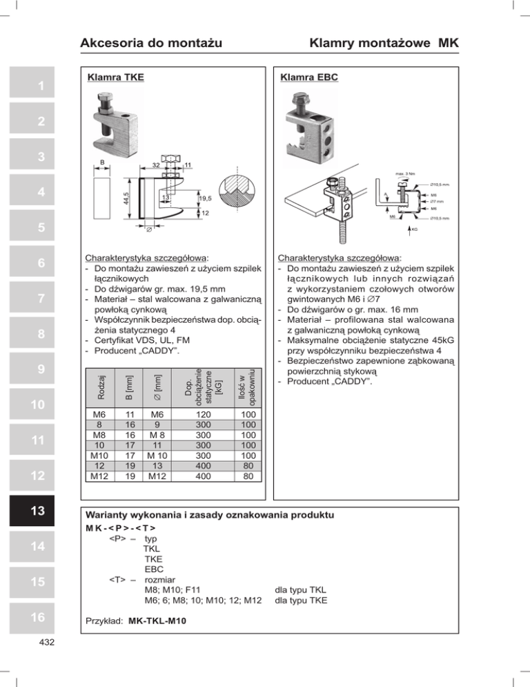 Akcesoria do monta¿u 1 Klamry monta¿owe MK Klamra TKE Klamra EBC Charakterystyka szczegó³owa: - Do monta¿u zawieszeñ z u¿yciem szpilek ³¹cznikowych - Do dwigarów gr. max. 19,5 mm - Materia³ stal walcowana z galwaniczn¹ pow³ok¹ cynkow¹ - Wspó³czynnik bezpieczeñstwa dop. obci¹¿enia statycznego 4 - Certyfikat VDS, UL, FM - Producent CADDY. Charakterystyka szczegó³owa: - Do monta¿u zawieszeñ z u¿yciem szpilek ³¹cznikowych lub innych rozwi¹zañ z wykorzystaniem czo³owych otworów gwintowanych M6 i Æ7 - Do dwigarów o gr. max. 16 mm - Materia³ profilowana stal walcowana z galwaniczn¹ pow³ok¹ cynkow¹ - Maksymalne obci¹¿enie statyczne 45kG przy wspó³czynniku bezpieczeñstwa 4 - Bezpieczeñstwo zapewnione z¹bkowan¹ powierzchni¹ stykow¹ - Producent CADDY. 2 3 4 10 11 12 13 14 15 16 432 Iloæ w opakowniu 9 Dop. obci¹¿enie statyczne [kG] 8 Æ [mm] 7 B [mm] 6 Rodzaj 5 M6 8 M8 10 M10 12 M12 11 16 16 17 17 19 19 M6 9 M8 11 M 10 13 M12 120 300 300 300 300 400 400 100 100 100 100 100 80 80 Warianty wykonania i zasady oznakowania produktu MK-<P>-<T> <P> typ TKL TKE EBC <T> rozmiar M8; M10; F11 M6; 6; M8; 10; M10; 12; M12 Przyk³ad: MK-TKL-M10 dla typu TKL dla typu TKE