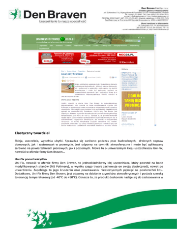Elastyczny twardziel Skleja, uszczelnia, wypełnia ubytki. Sprawdza się zarówno podczas prac budowlanych, drobnych napraw domowych, jak i zastosowao w przemyśle. Jest odporny na czynniki atmosferyczne i może byd aplikowany zarówno na powierzchniach pionowych, jak i poziomych. Mowa tu o uniwersalnym kleju-uszczelniaczu Uni-Fix, nowości w ofercie firmy Den Braven... Uni-Fix ponad wszystko Uni-Fix, nowośd w ofercie firmy Den Braven, to jednoskładnikowy klej-uszczelniacz, który powstał na bazie modyfikowanych silanów (MS Polimeru), w wyniku czego trwale zachowuje on swoją elastycznośd, nawet po utwardzeniu. Zapobiega to jego kruszeniu oraz powstawaniu nieestetycznych pęknięd na powierzchni kitu. Dodatkowo, Uni-Fix firmy Den Braven, jest odporny na działanie czynników atmosferycznych i posiada szeroką tolerancję temperaturową (od -40°C do +90°C). Oznacza to, że produkt doskonale nadaje się do zastosowania w profesjonalnym przemyśle chłodniczym (np. w autochłodniach, magazynach chłodniczych), jak również do uszczelniania narażonych na wysoką temperaturę urządzeo sanitarnych (np. wanien, pryszniców, umywalek) czy izolacji instalacji grzewczych i nie traci przy tym swych właściwości. Dodatkowym gwarantem trwałości i wysokiej jakości kleju-uszczelniacza Uni-Fix firmy Den Braven jest bardzo dobra odpornośd fizyczna na wodę, chlor, pleśo czy grzyby, a także na mechaniczne drgania i wibracje. Uni-Fix - od podłogi aż po dach Lista zastosowao nowatorskiego kleju-uszczelniacza Uni-Fix jest bardzo długa. Poza wspomnianymi już zastosowaniami w profesjonalnym przemyśle chłodniczym oraz uszczelnieniami urządzeo sanitarnych, Uni-Fix sprawdzi się również podczas wszelkiego rodzaju prac remontowo-budowlanych. Dzięki znakomitej przyczepności do większości podłoży pozwoli nam na przyklejenie zarówno materiałów izolacyjnych, jak i dekoracyjnych, w postaci np.: parapetów, listew progowych, płytek, paneli, luster czy sztukaterii, oraz na podklejanie i uszczelnianie materiałów dekarskich, takich jak blacha, dachówki ceramiczne czy cementowe. Dodatkowo Uni-Fix firmy Den Braven pozwala na mocowanie i uszczelnianie materiałów ze styropianu, pianki poliuretanowej, PCW, poliwęglanu, korka, wełny mineralnej, drewna, MDF, stali, aluminium, mosiądzu, miedzi, cynku itp. Uni - Fix to produkt, który idealnie wypełni pęknięcia, rysy i szczeliny w betonie, ceramice budowlanej, tynkach, drewnie, kamieniu oraz wszędzie tam, gdzie istnieje ryzyko, iż silikon mógłby spowodowad plamienie. Co więcej - Uni-Fix firmy Den Braven może byd stosowany na większości podłoży budowlanych, w tym również na tych wilgotnych, bez konieczności ich wcześniejszego gruntowania. Optymalna konsystencja Uni-Fix firmy Den Braven umożliwia aplikację zarówno na powierzchniach poziomych jak i pionowych, bez ryzyka spłynięcia produktu czy powstania pęcherzyków w nakładanej warstwie. Natomiast brak skurczu Uni-Fix zabezpiecza odnawianą powierzchnię przed tworzeniem się rys, naprężeo oraz pęknięd i pozostawia ją idealnie gładką. Uni-Fix – Klejenie na piątkę Klej - uszczelniacz Uni-Fix firmy Den Braven dostępny jest w postaci pięciu produktów: Uni-Fix Original, Uni-Fix Clear, Uni-Fix Max, Uni-Fix Alu oraz Uni-Fix Automatic. Każdy z nich posiada zbliżone właściwości, różnią się jednak między sobą pojemnościami oraz są dedykowane różnym specjalistycznym zastosowaniom. Uni-Fix Original przeznaczony jest chociażby do klejenia luster oraz kamienia naturalnego. Jako jedyny ze wszystkich produktów z linii Uni-Fix dostępny jest nie tylko w kartuszu, ale również w tubce. Co więcej - występuje aż w czterech kolorach: białym, szarym, brązowym oraz czarnym. Uni-Fix Clear jest produktem idealnie przezroczystym, dzięki czemu sprawdzi się w klejeniu elementów szklanych, gdzie zastosowanie białego kleju popsułoby estetykę wykonania. Uni-Fix Max dedykowany jest klejeniu bardzo ciężkich przedmiotów bez podpierania. Z powodzeniem zastąpi w tym celu śruby, kołki czy gwoździe. Jest bardzo gęsty, w związku z czym do jego użycia potrzebny jest specjalny pistolet do kartuszy. Produkt dostępny jest w kolorze białym. Uni-Fix Alu w kolorze aluminium przeznaczony jest z kolei do bezpiecznego łączenia metalu, natomiast Uni-Fix Automatic charakteryzuje się bardzo wygodnym opakowaniem, dzięki któremu niepotrzebne staje się używanie pistoletu do kartuszy. W tej wersji klej-uszczelniacz dedykowany jest zastosowaniom w trudno dostępnych miejscach. Klej-uszczelniacz Uni-Fix jest produktem całkowicie bezwonnym oraz bezpiecznym dla organizmu. Do jego produkcji nie użyto szkodliwych izocyjanianów, silikonu, rozpuszczalników, polichlorku winylu ani plastyfikatorów. Między innymi dlatego jest tak chętnie używany, np. w branży spożywczej do uszczelniania lad chłodniczych. Może mied bowiem stycznośd z opakowaną żywnością bez ryzyka jej skażenia niebezpiecznymi substancjami chemicznymi. Ponadto Uni-Fix firmy Den Braven jest też chemicznie neutralny, co ma duże znaczenie wszędzie tam, gdzie użycie innego środka może zniszczyd powierzchnię, np. uszkodzid warstwę srebrzankową lustra lub odbarwid naturalny kamieo. Łatwośd użycia, wszechstronnośd zastosowao, poręczne opakowanie, a przede wszystkim unikalne właściwości produktów Uni-Fix firmy Den Braven powodują, że znajdą one uznanie nie tylko w oczach profesjonalistów zawodowo zajmujących się pracami remontowo-wykooczeniowymi, ale również użytkowników dokonujących samodzielnych napraw w domu. Firma Den Braven East Sp. z o.o. z siedzibą w Wysogotowie koło Poznania została założona w 1991 roku jako wschodnioeuropejski oddział Grupy Den Braven. Holding Den Braven Sealants jest liderem technologii uszczelnieo w Europie, a marka Zwaluw (Jaskółka z j. holenderskiego) jest rozpoznawalna na całym świecie. Terenem działania Den Braven East jest 