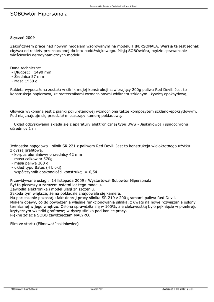 Amatorskie Rakiety Doświadczalne - KSard SOBOwtór Hipersonala Styczeń 2009 Zakończyłem prace nad nowym modelem wzorowanym na modelu HIPERSONALA. Wersja ta jest jednak cięższa od rakiety przeznaczonej do lotu naddźwiękowego. Misją SOBOwtóra, będzie sprawdzenie właściwości aerodynamicznych modelu. Dane techniczne: - Długość: 1490 mm - Średnica 57 mm - Masa 1530 g Rakieta wyposażona została w silnik mojej konstrukcji zawierający 200g paliwa Red Devil. Jest to konstrukcja papierowa, ze statecznikami wzmocnionymi włóknem szklanym i żywicą epoksydową. Głowica wykonana jest z pianki poliuretanowej wzmocniona takze kompozytem szklano-epoksydowym. Pod nią znajduje się przedział mieszczący kamerę pokładową. Układ odzyskiwania składa się z aparatury elektronicznej typu UWS - Jaskiniowca i spadochronu ośrednicy 1 m Jednostka napędowa - silnik SR 221 z paliwem Red Devil. Jest to konstrukcja wielokrotnego użytku z dyszą grafitową. - korpus aluminiowy o średnicy 42 mm - masa całkowita 570g - masa paliwa 200 g - układ typu Bates (4 bloki) - współczynnik doskonałości konstrukcji = 0,54 Przewidywane osiągi: 14 listopada 2009 r Wystartował Sobowtór Hipersonala. Był to pierwszy a zarazem ostatni lot tego modelu. Zawiodła elektronika i model uległ zniszczeniu. Szkoda tym większa, że na pokładzie znajdowała się kamera. Na pocieszenie pozostaje fakt dobrej pracy silnika SR 219 z 200 gramami paliwa Red Devil. Miałem obawy, co do powodzenia właśnie funkcjonowania silnika, z uwagi na nowe rozwiązanie osłony termicznej w jego wnętrzu. Osłona sprawdziła się w 100%, ale ciekawostką było pęknięcie w przekroju krytycznym wkładki grafitowej w dyszy silnika pod koniec pracy. Piękne zdjęcia SOBO zawdzięczam MALYRO. Film ze startu (Filmował Jaskiniowiec) http://www.ksard.cba.pl Kreator PDF Utworzono 8-03-2017, 21:04