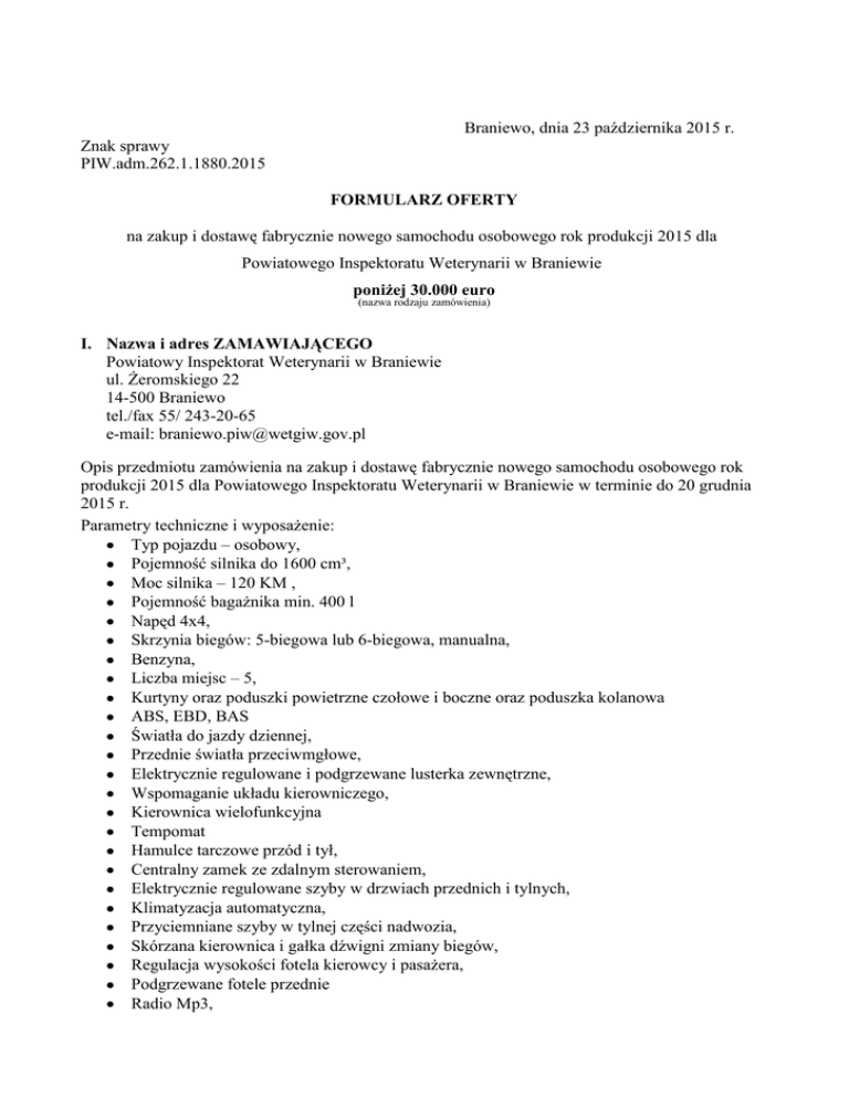 Braniewo, dnia 23 października 2015 r. Znak sprawy PIW.adm.262.1.1880.2015 FORMULARZ OFERTY na zakup i dostawę fabrycznie nowego samochodu osobowego rok produkcji 2015 dla Powiatowego Inspektoratu Weterynarii w Braniewie poniżej 30.000 euro (nazwa rodzaju zamówienia) I. Nazwa i adres ZAMAWIAJĄCEGO Powiatowy Inspektorat Weterynarii w Braniewie ul. Żeromskiego 22 14-500 Braniewo tel./fax 55/ 243-20-65 e-mail: [email protected] Opis przedmiotu zamówienia na zakup i dostawę fabrycznie nowego samochodu osobowego rok produkcji 2015 dla Powiatowego Inspektoratu Weterynarii w Braniewie w terminie do 20 grudnia 2015 r. Parametry techniczne i wyposażenie: Typ pojazdu – osobowy, Pojemność silnika do 1600 cm³, Moc silnika – 120 KM , Pojemność bagażnika min. 400 l Napęd 4x4, Skrzynia biegów: 5-biegowa lub 6-biegowa, manualna, Benzyna, Liczba miejsc – 5, Kurtyny oraz poduszki powietrzne czołowe i boczne oraz poduszka kolanowa ABS, EBD, BAS Światła do jazdy dziennej, Przednie światła przeciwmgłowe, Elektrycznie regulowane i podgrzewane lusterka zewnętrzne, Wspomaganie układu kierowniczego, Kierownica wielofunkcyjna Tempomat Hamulce tarczowe przód i tył, Centralny zamek ze zdalnym sterowaniem, Elektrycznie regulowane szyby w drzwiach przednich i tylnych, Klimatyzacja automatyczna, Przyciemniane szyby w tylnej części nadwozia, Skórzana kierownica i gałka dźwigni zmiany biegów, Regulacja wysokości fotela kierowcy i pasażera, Podgrzewane fotele przednie Radio Mp3, Bluetooth + zestaw głośnomówiący Aluminiowe obręcze kół, Koła letnie i zimowe (opony letnie i zimowe), Apteczka, gaśnica, trójkąt odblaskowy. Spalanie cykl mieszany max 6.5l II. FORMA ZŁOŻENIA OFERTY Ofertę należy złożyć w terminie do dnia 5 listopada 2015r. do godz. 10:00 w zamkniętej kopercie. Koperta musi być zaadresowana wg poniższego wzoru: Powiatowy Inspektorat Weterynarii w Braniewie ul. Żeromskiego 22 14-500 Braniewo „Oferta - zakup samochodu” Otwarcie ofert nastąpi w dniu 6 listopada 2015 r. o godz. 10.30 Jeżeli termin złożenia oferty jest zbyt krótki prosimy o pisemną informację przesłaną mailem, faxem bądź dostarczoną osobiście w terminie do 28 października 2015 r. Kryterium oceny – cena 100% za wymagany przedmiot zamówienia III. Nazwa i adres WYKONAWCY NAZWA: ……………..……………………………………………………………………………………… …………………………………………………………………………………………………… ADRES: …………………………………………………………………………………………………… …………………………………………………………………………………………………… NIP: …………………………………………………………….……………………………………… NR RACHUNKU BANKOWEGO: ……………………………………………………………………………… 1. Oferuję wykonanie przedmiotu zamówienia za: cenę netto: …………………………… zł podatek VAT: …………………………… zł cenę brutto: ……………………………... zł słownie brutto: ………………………………………………………………………………zł 2. Oświadczamy, że zapoznaliśmy się z opisem przedmiotu zamówienia i nie wnosimy do niego zastrzeżeń. 3. Oświadczamy, że zapoznaliśmy się z projektem umowy i nie wnosimy do niego żadnych uwag. 4. Oświadczamy, że przystępując do udziału w postępowaniu : posiadamy uprawnienia do wykonywania określonej działalności lub czynności, jeżeli przepisy prawa nakładają obowiązek ich posiadania. posiadamy wiedzę i doświadczenie w zakresie niezbędnym dla prawidłowego wykonania zamówienia. dysponujemy odpowiednim potencjałem technicznym oraz osobami zdolnymi do wykonania zamówienia. znajdujemy się w sytuacji ekonomicznej i finansowej zapewniającej prawidłowe wykonanie zamówienia. ………………………, dnia ………………… …………………………………… pieczęć i podpis wykonawcy UMOWA nr ………… zawarta w dniu ………………. w Braniewie, pomiędzy: Powiatowym Inspektoratem Weterynarii w Braniewie z siedzibą w Braniewie przy ul. Żeromskiego 22, REGON nr ……………, NIP ………………. reprezentowanym przez Tadeusza Zakrzewskiego – Powiatowego Lekarza Weterynarii w Braniewie zwaną w dalszej treści umowy „Zamawiającym” a ………………………………………………………….., reprezentowaną przez: ………..………………. zwanym w dalszej treści umowy „Wykonawcą” § 1. 1. Na podstawie niniejszej Umowy Wykonawca sprzedaje, a Zamawiający nabywa fabrycznie nowy wyprodukowany w 2015 r. samochód osobowy (marka, model): ………………………… o parametrach technicznych i wyposażeniu, określonych w formularzu ofertowym, zwanym dalej „samochodem”. 2. Wykonawca oświadcza, że jako autoryzowany przedstawiciel ……… jest uprawniony do sprzedaży samochodu marki ……………………. będącym przedmiotem niniejszej umowy. 3. Numer fabryczny nadwozia samochodu zostanie wpisany w fakturze VAT wystawionej przez Wykonawcę oraz w protokole odbioru, o którym mowa w ust. 4 niniejszego paragrafu. 4. Odbiór samochodu przez Zamawiającego nastąpi na podstawie protokołu odbioru stanowiącego załącznik nr 1 do niniejszej Umowy, podpisanego przez upoważnionych przedstawicieli Stron, w miejscu uzgodnionym przez Strony, po zarejestrowaniu i ubezpieczeniu samochodu przez Zamawiającego. 5. Dostawa samochodu do miejsca jego odbioru przez Zamawiającego odbędzie się na koszt i ryzyko Wykonawcy. 6. Wraz z samochodem Wykonawca zobowiązany jest wydać Zamawiającemu duplikaty kluczy oraz dokumenty niezbędne do jego eksploatacji, a w szczególności: instrukcję obsługi w języku polskim, 